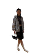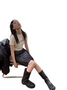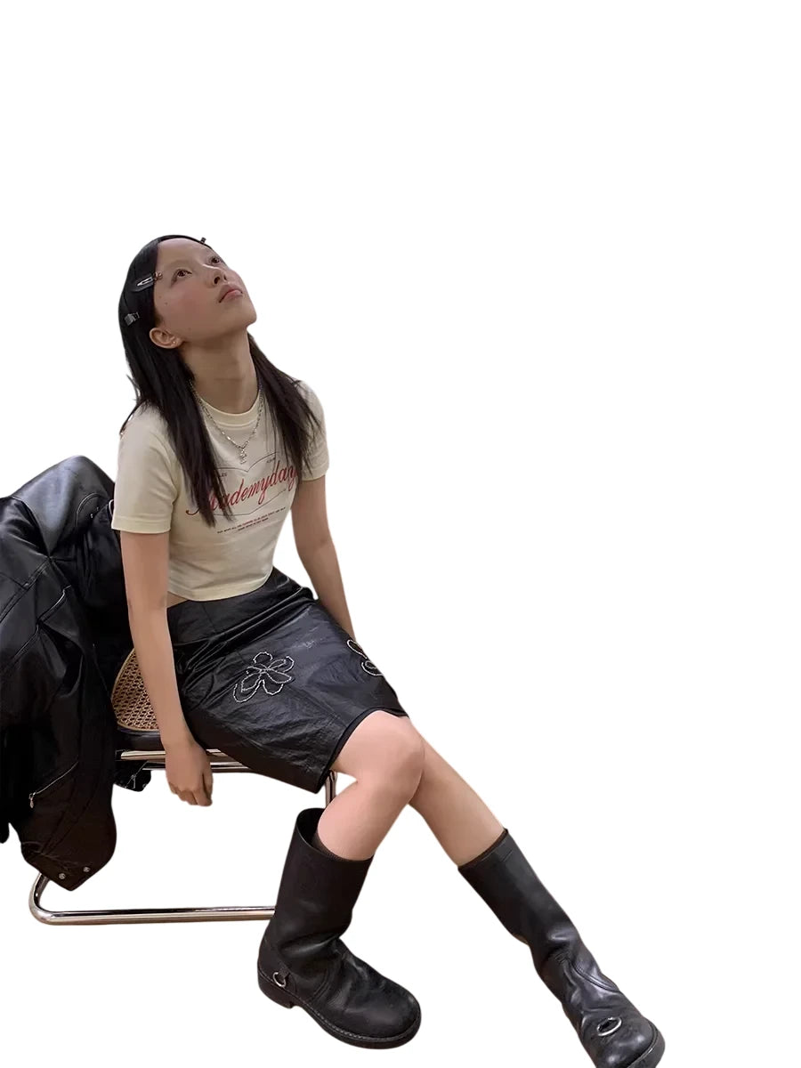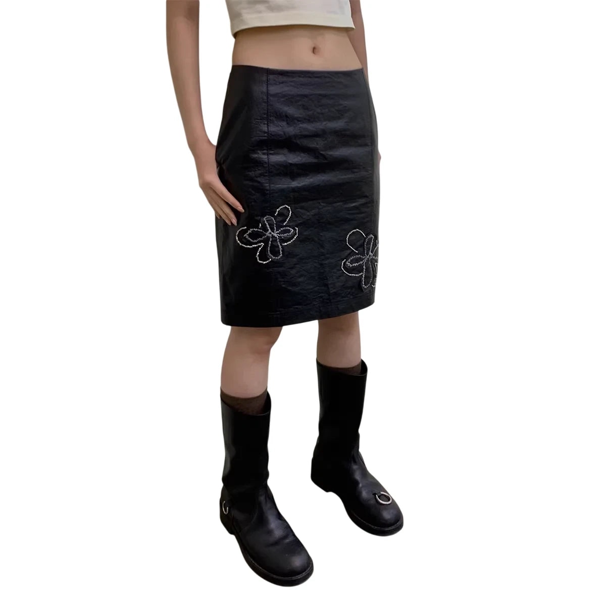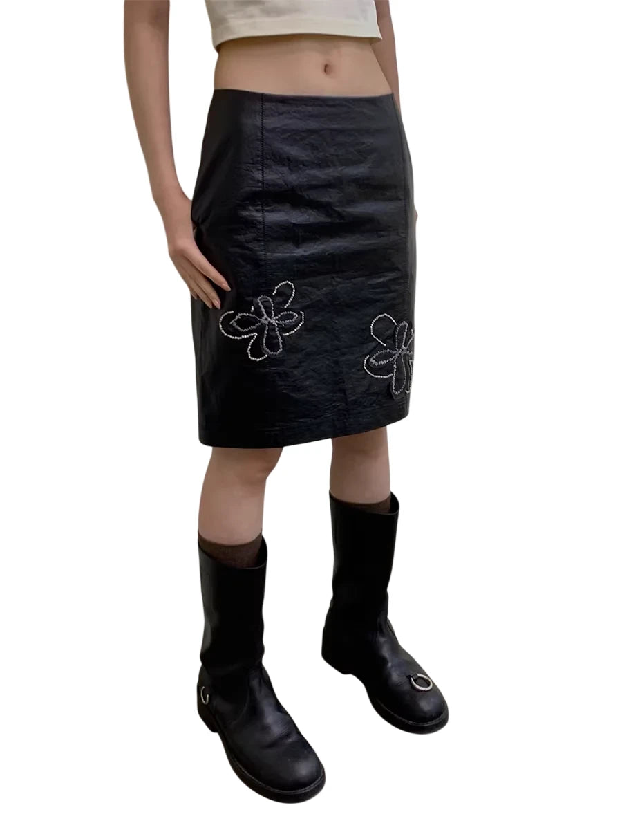 Elevate your spring and summer wardrobe with this chic women's skirt featuring intricate hand-beaded floral embroidery. Crafted from crinkled faux leather, this knee-length patchwork skirt combines edgy texture with delicate detailing. Perfect for styled casual or evening looks, it pairs beautifully with boots and a cropped top for an effortlessly fashionable outfit.