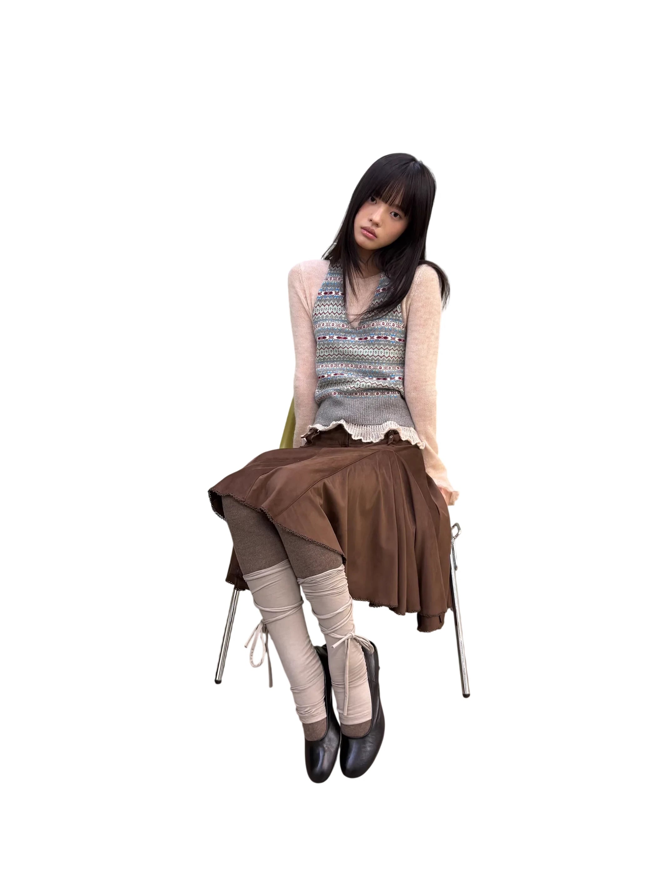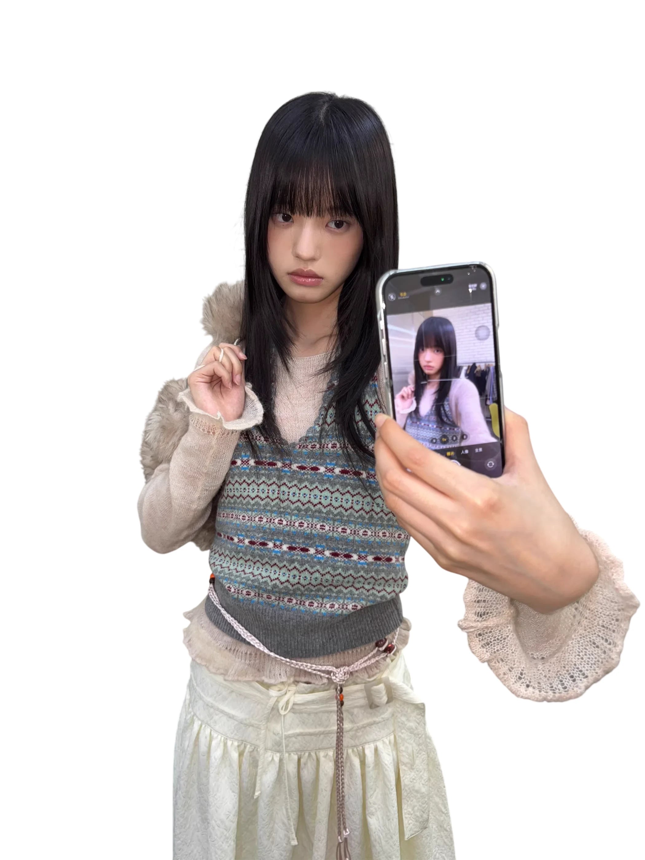 This women's halter camisole features a charming Fair Isle jacquard knit in a harmonious mix of blue, red, and white, offering a cozy and seasonal feel. The delicate white lace trim along the neckline adds a touch of femininity, while the grey ribbed hem provides contrast and structure. Designed in a soft wool blend, this piece is perfect for layering over long sleeves in cooler weather, making it an ideal choice for autumn and winter fashion.