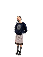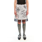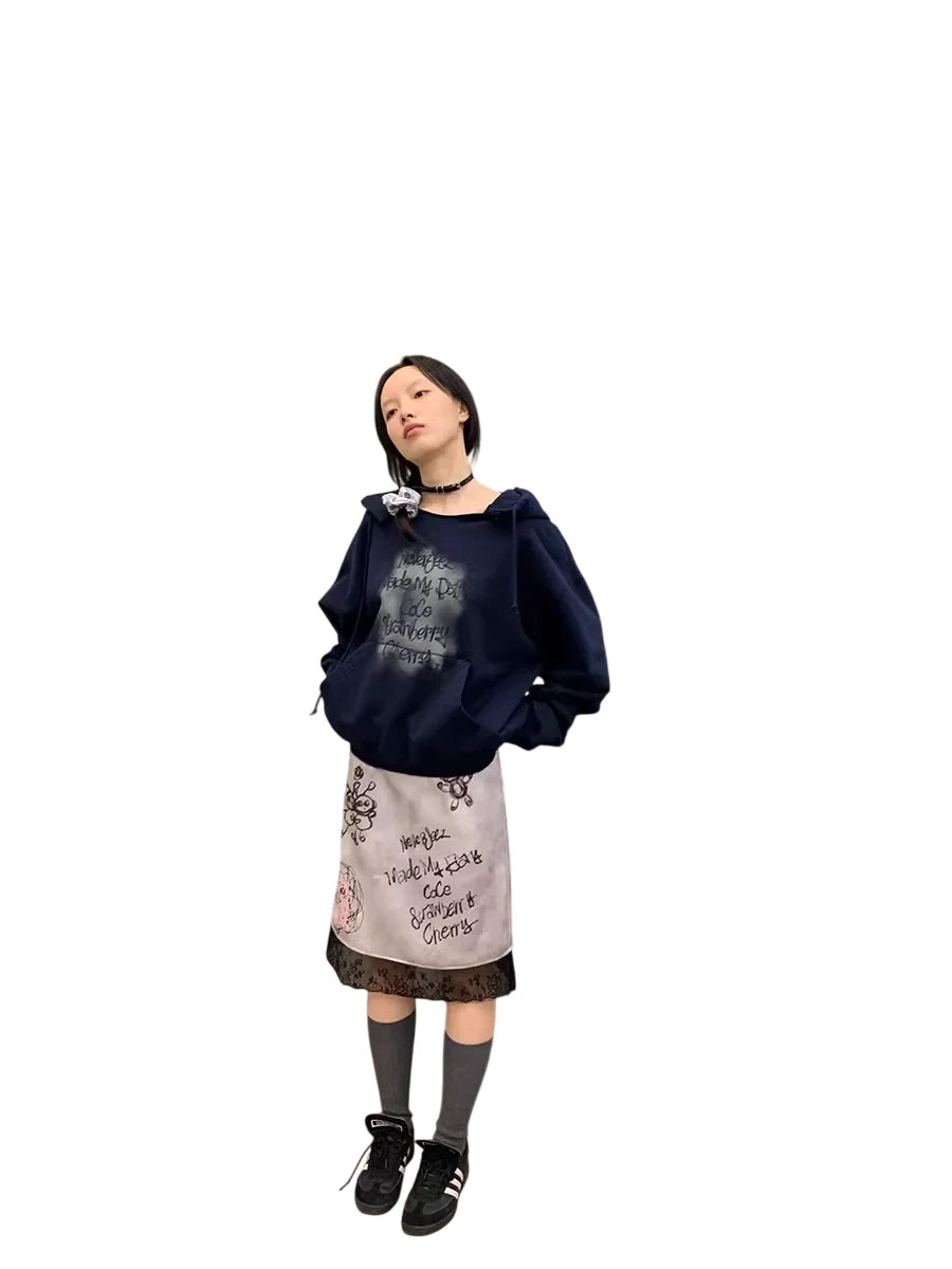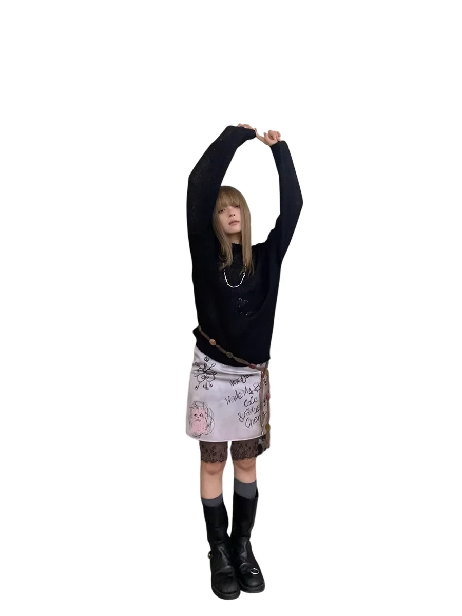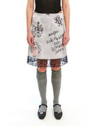 This women's skirt combines playful charm with edgy flair, featuring a unique graffiti-inspired print. The design includes whimsical hand-drawn illustrations such as teddy bears, strawberries, cherries, and quirky phrases like 'Made My Play Code' and 'Strawberry Cherrys.' Crafted in a crisp white fabric with bold black prints, the skirt is finished with delicate lace trim at the hem for a feminine touch. Pair it with knee-high socks and flats for a punk-inspired look that stands out.