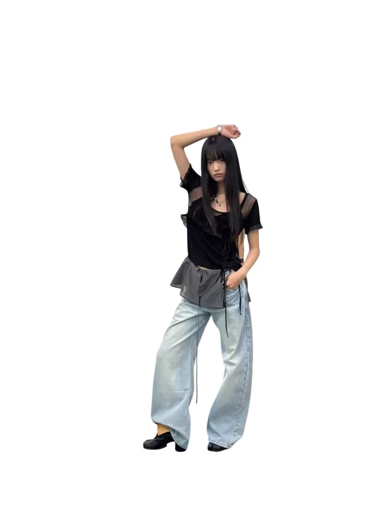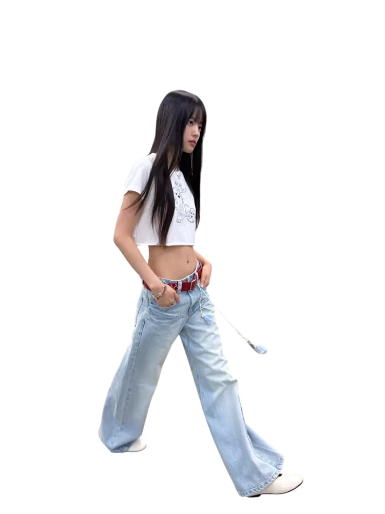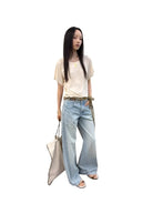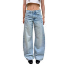 Elevate your casual wardrobe with these light blue high-waisted wide-leg jeans, designed for a laid-back yet stylish look. Featuring a classic five-pocket design and subtle whisker detailing, these jeans offer a slightly faded wash throughout for that perfect worn-in feel. Ideal for women seeking all-day comfort and modern appeal.