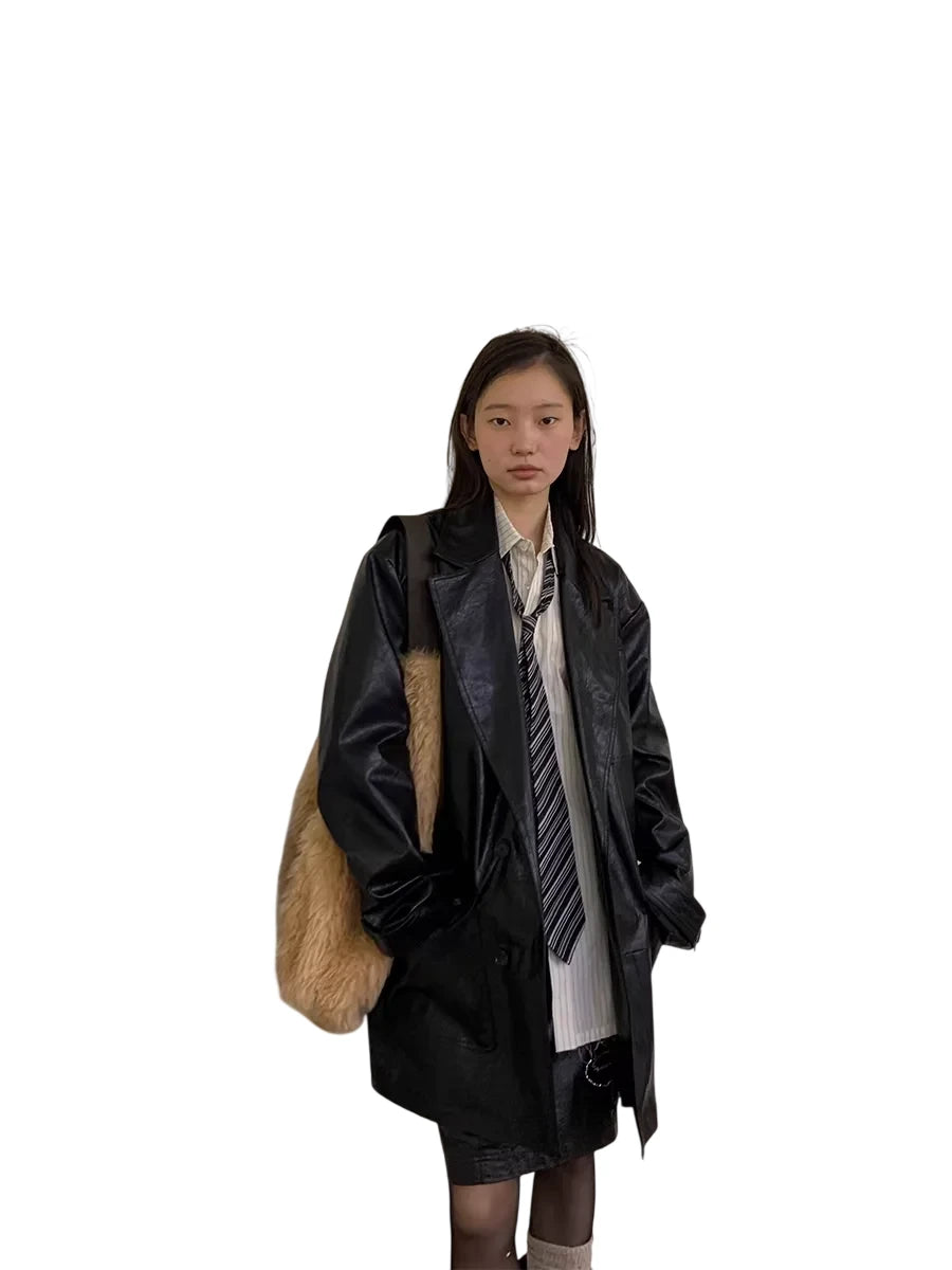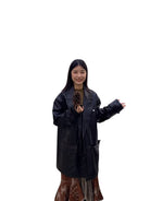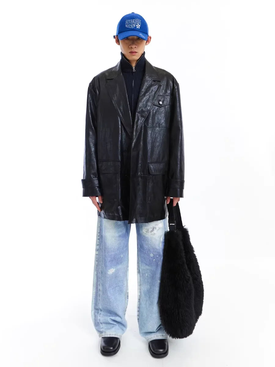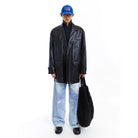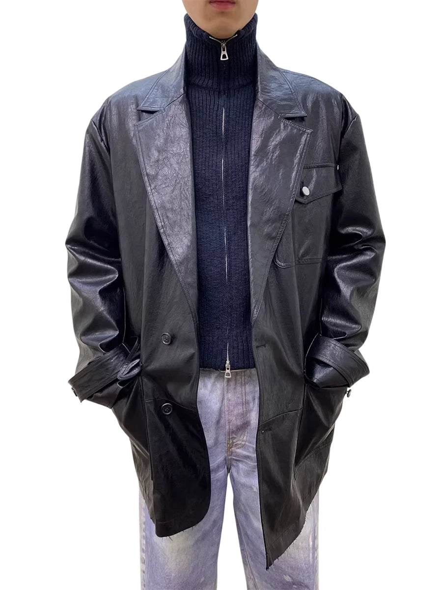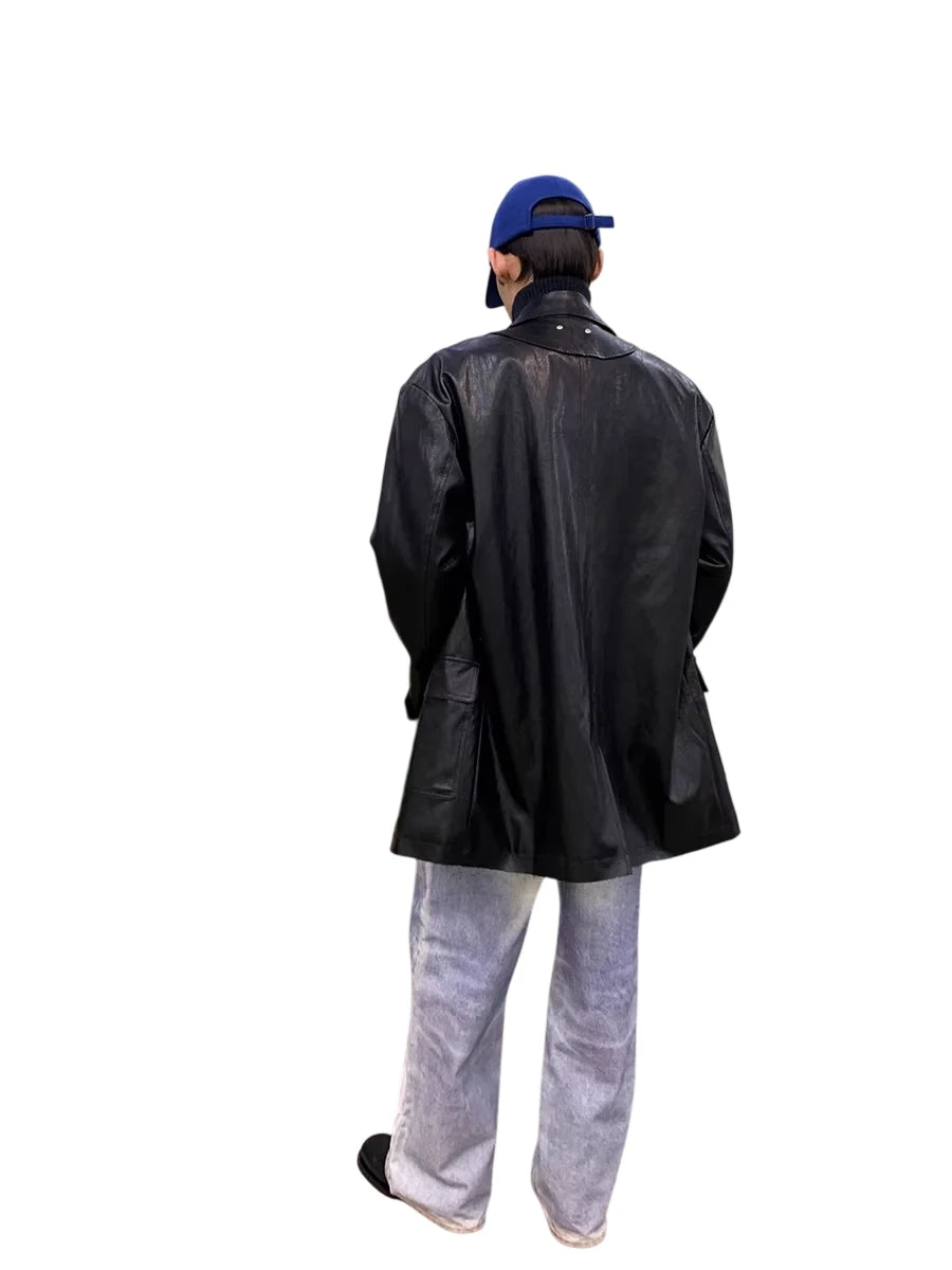 This men's mid-length padded faux leather jacket offers a bold fusion of streetwear style and modern design. Crafted with a slightly crinkled texture, it features a structured silhouette with multiple front pockets, including a practical flap pocket at the chest. The oversized fit creates a contemporary edge, ideal for layering over casual outfits. Paired with distressed wide-leg jeans and chunky footwear, this jacket adds depth and dimension to any fashion-forward wardrobe.