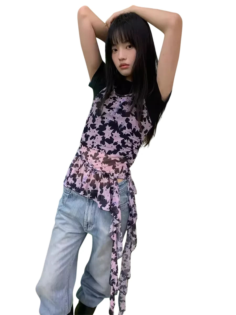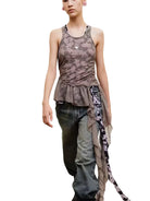 Make a statement with this women's mesh ruffle vest top, featuring a sleeveless design and unique asymmetrical peplum hem. The muted mauve camo-style pattern provides a modern edge, while layered chiffon ruffles add a soft, feminine contrast. A drawstring detail enhances the shape, making this piece perfect for styling with edgy denim or structured outerwear.