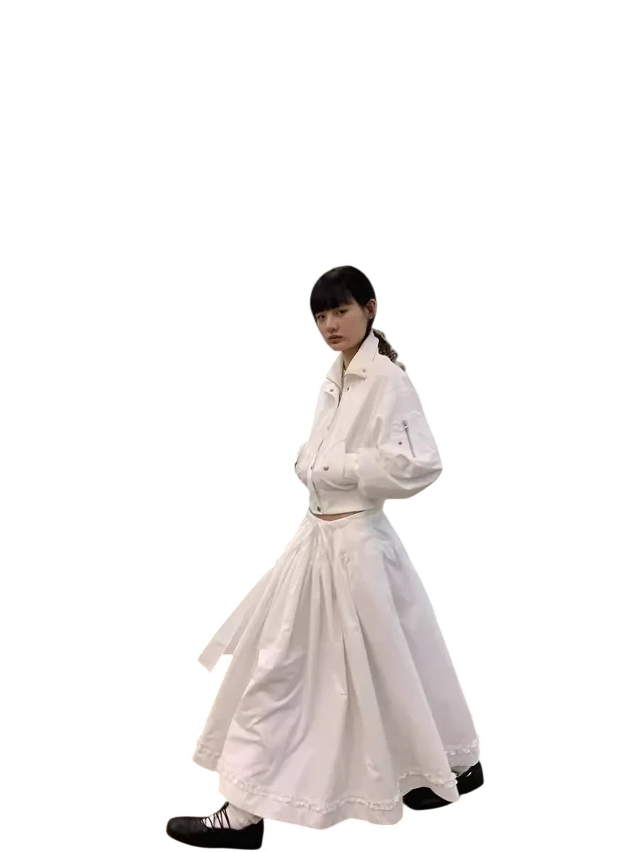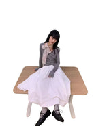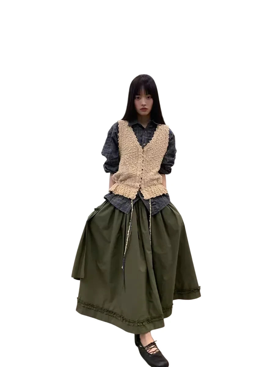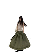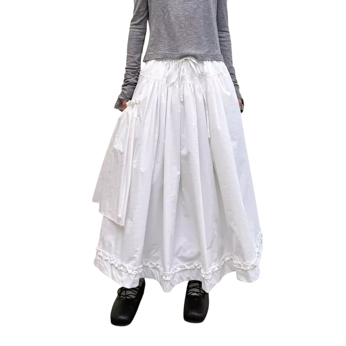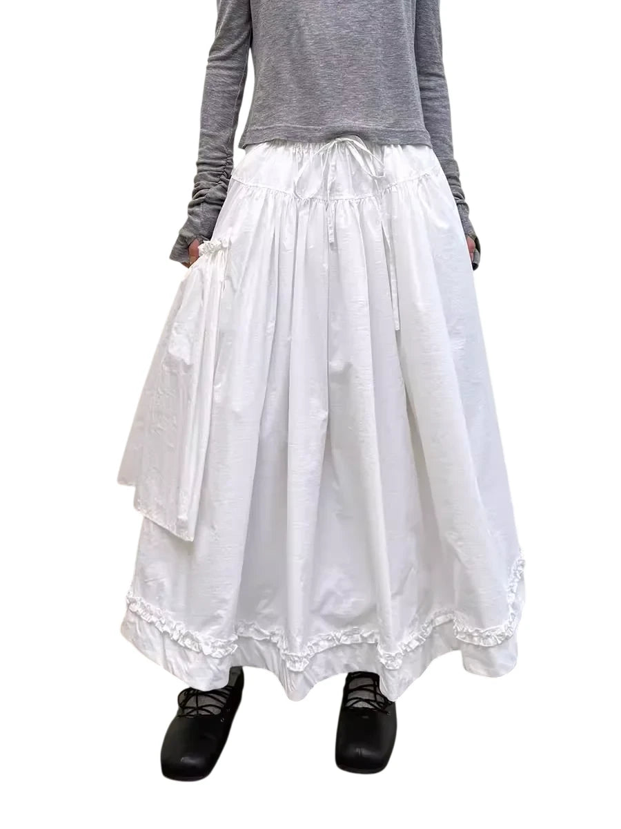 This women's midi skirt features a voluminous A-line silhouette with elegant pleating and an asymmetrical layered detail for added texture. Designed with a comfortable drawstring waist and large pocket, it combines functionality with vintage-inspired style. The ruffled hemline enhances the skirt's flowy aesthetic, making it perfect for both casual and elevated looks.