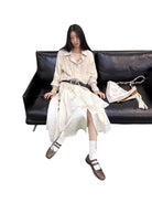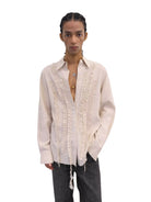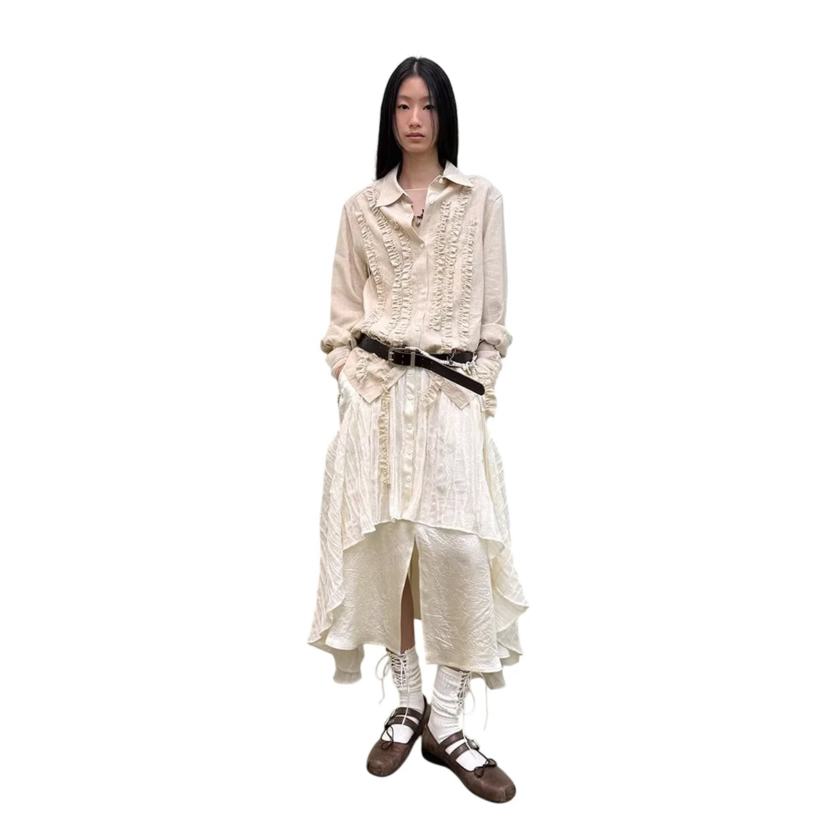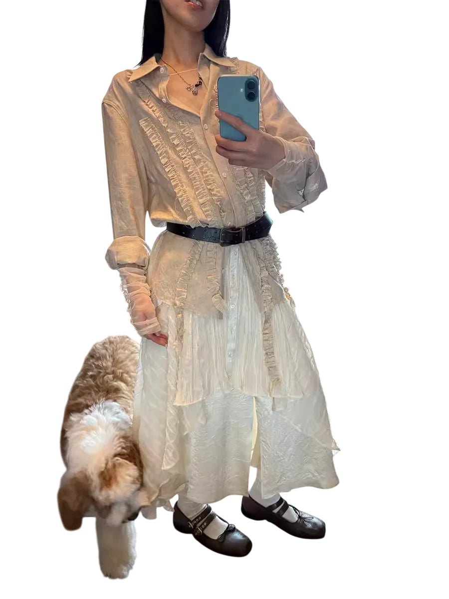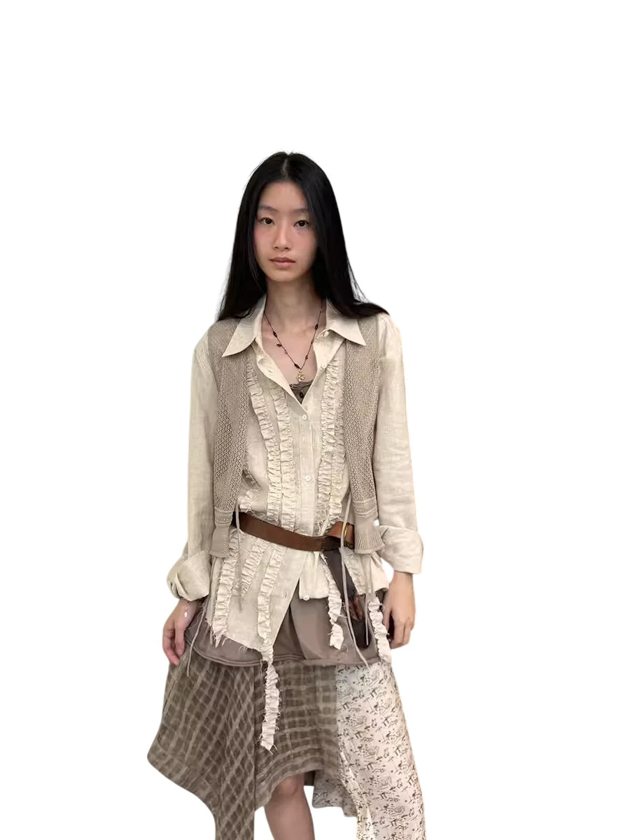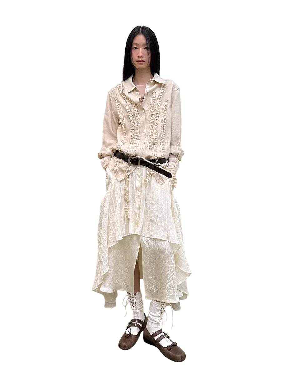 Elevate your wardrobe with this women's vintage-inspired blouse crafted from a breathable lyocell-linen blend. Featuring delicate pleats, ruffle detailing, and decorative tassels, this cream-colored long-sleeve shirt exudes romantic charm. Ideal for pairing with skirts or trousers, it brings a touch of rustic elegance to any ensemble.