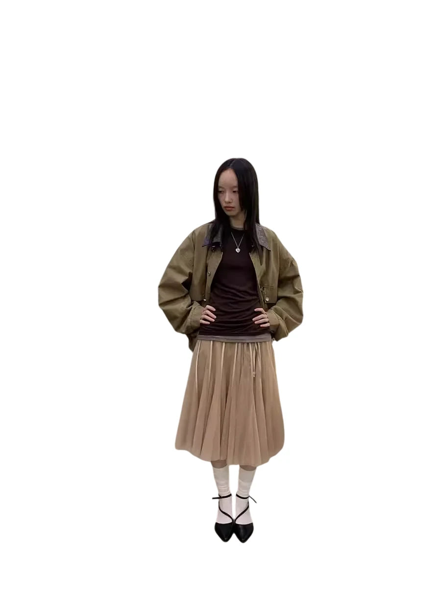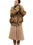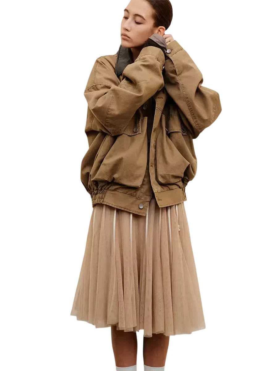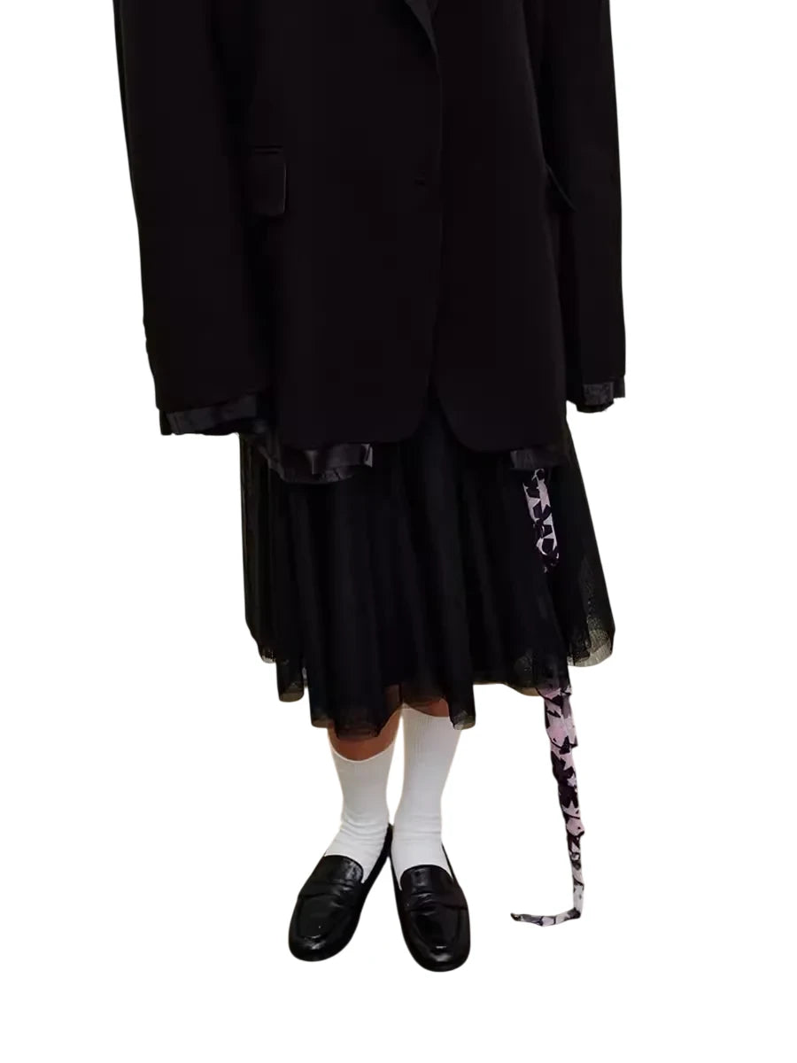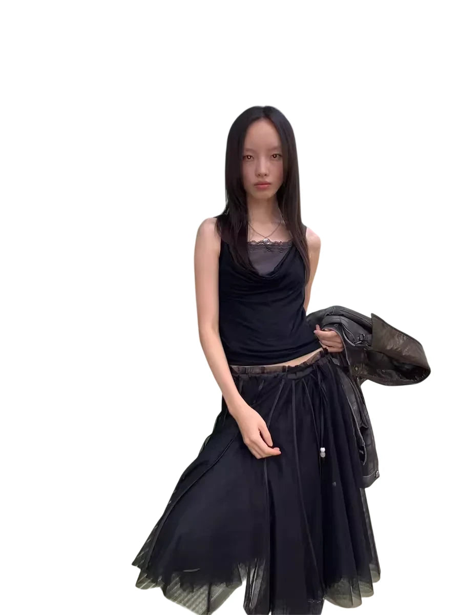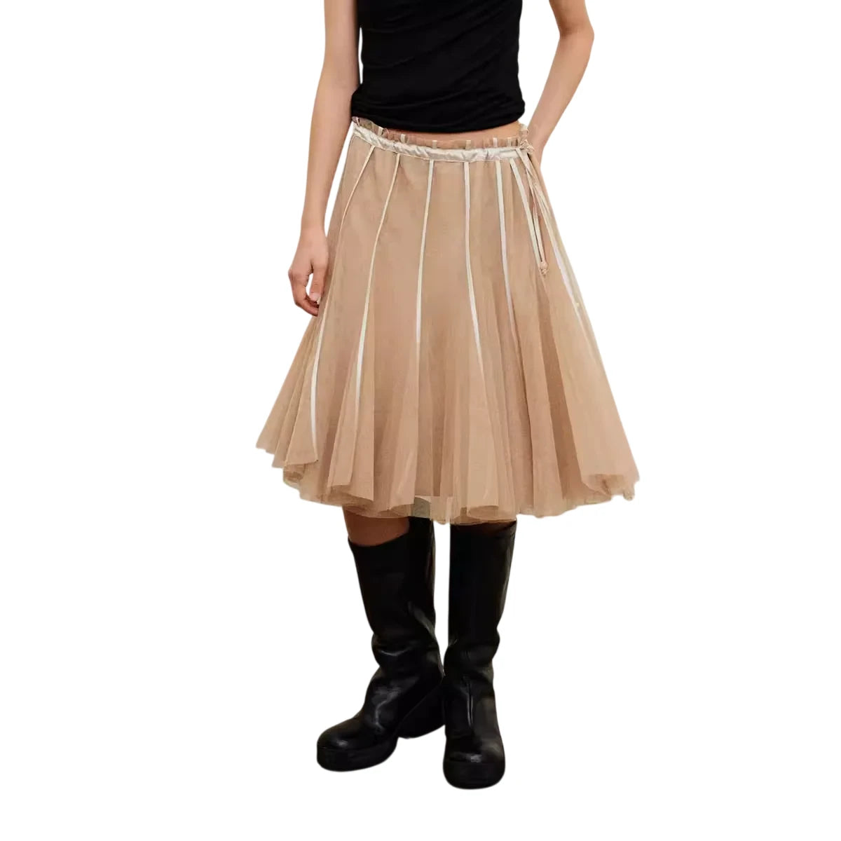 This women's midi skirt features a voluminous A-line silhouette crafted from a sheer mesh overlay atop a solid underskirt. It includes elegant vertical pleats with white piping accents for a structured yet flowing effect. The gathered waistband is complemented by an integrated drawstring, offering both style and comfort. Perfect for versatile styling, this piece blends ethereal texture with modern design.