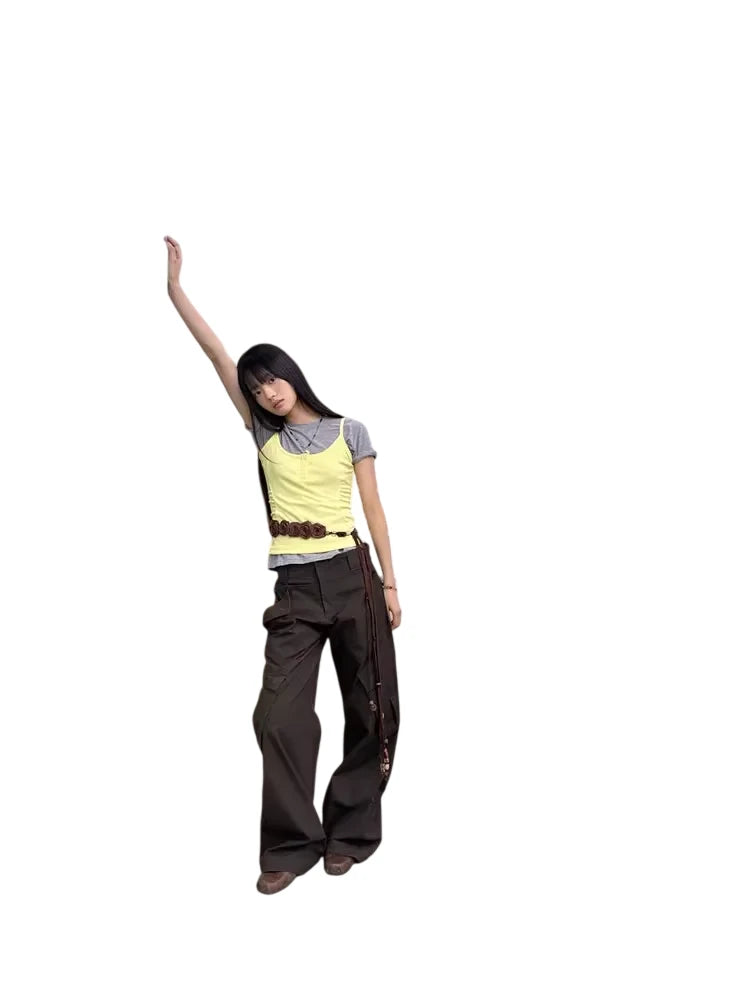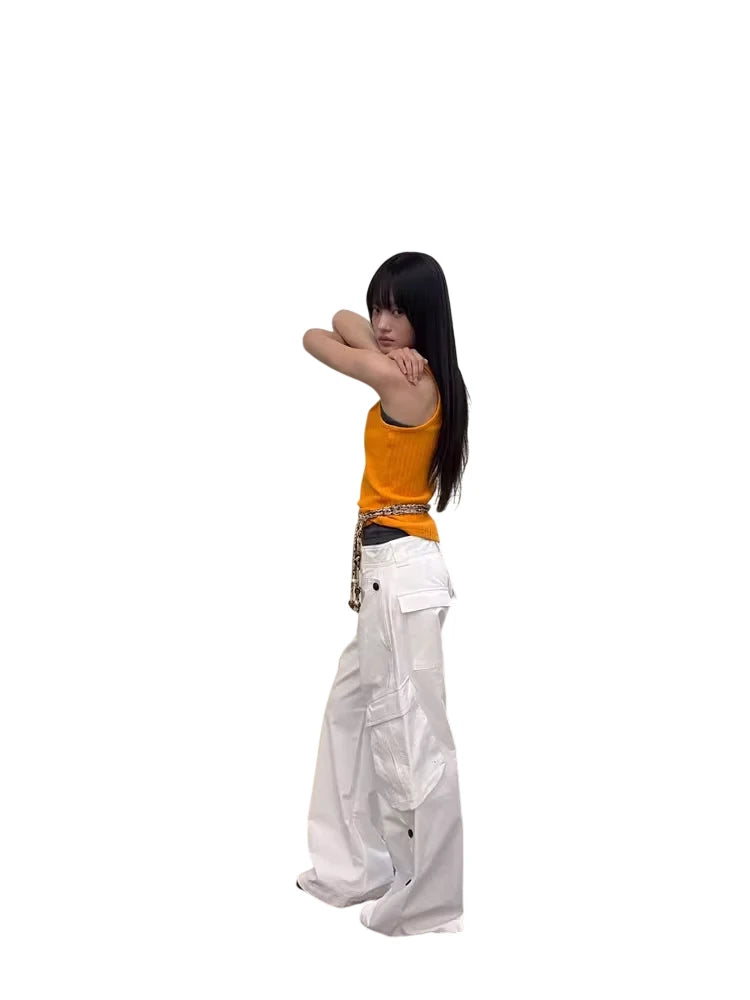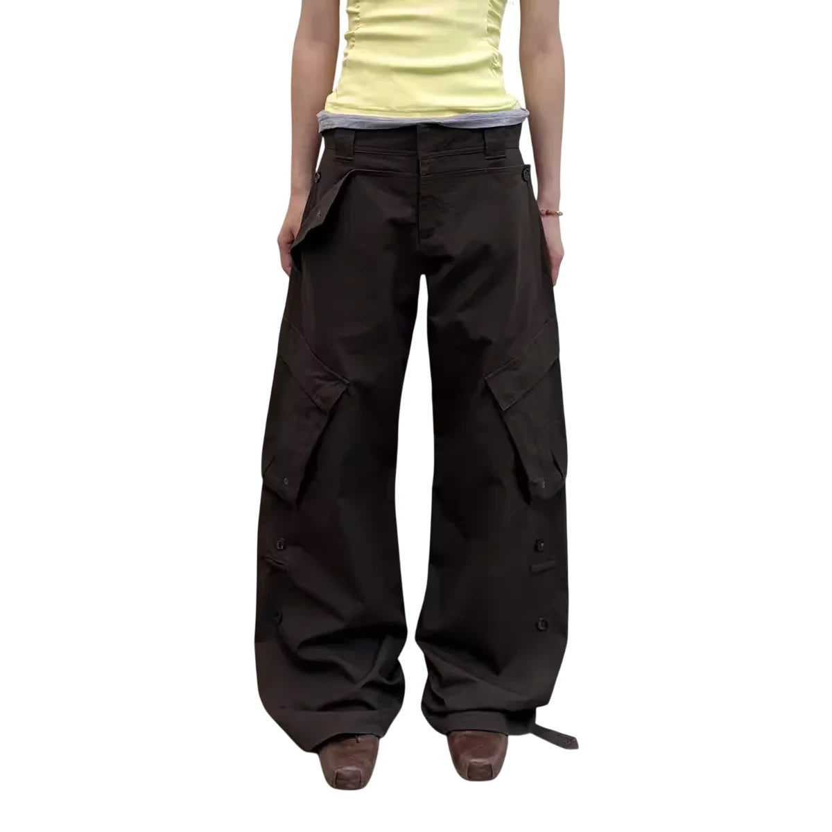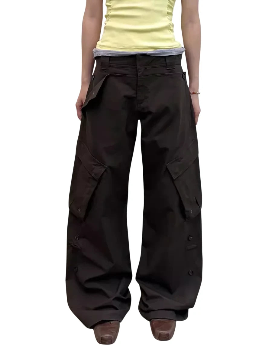 These women's wide-leg cargo pants feature an oversized silhouette and a mid-rise waistband for a relaxed, contemporary look. Designed with slanted side pockets and pleated detailing, they offer both function and style. Multiple large utility pockets with button closures add a rugged aesthetic, while adjustable button elements at the hem allow for a customizable fit. Perfect for casual wear or edgy street style.
