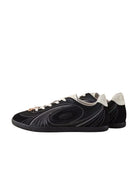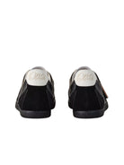 Step into timeless style with these ebony cyan retro German trainer sneakers, designed for versatile everyday wear. Crafted with a mix of smooth leather and suede-like materials, they feature curving stitch details and a sophisticated silhouette. The white laces and tan leather heel tags add a contrast that elevates their modern appeal.