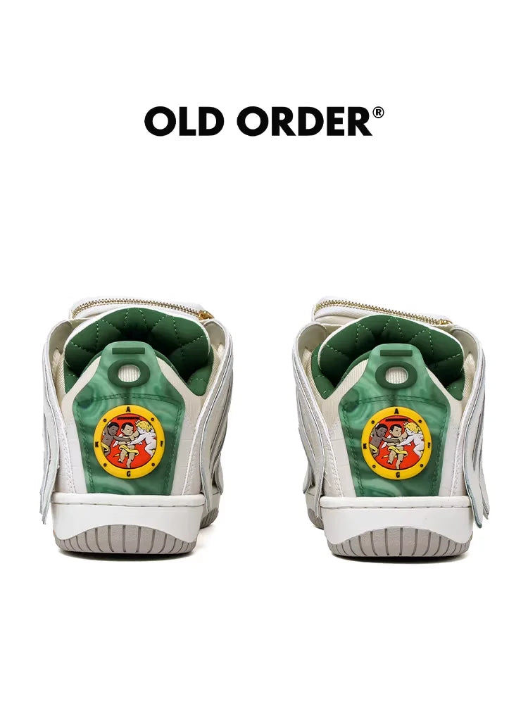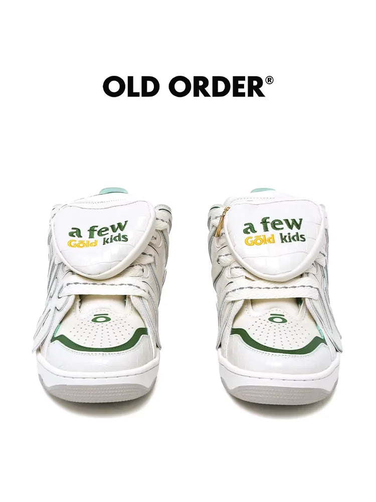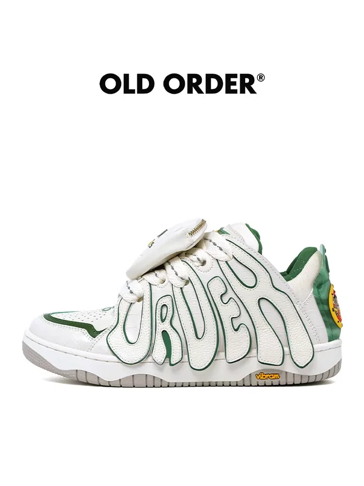 Step into bold style with these unisex chunky skater sneakers. Featuring oversized embroidered lettering along the side panels, a layered synthetic upper, and thick white soles with green detailing, these sneakers offer both comfort and eye-catching design. The lace-up front includes unique embellishments with branded text, adding extra flair to your look. Perfect for making a statement in everyday streetwear.
