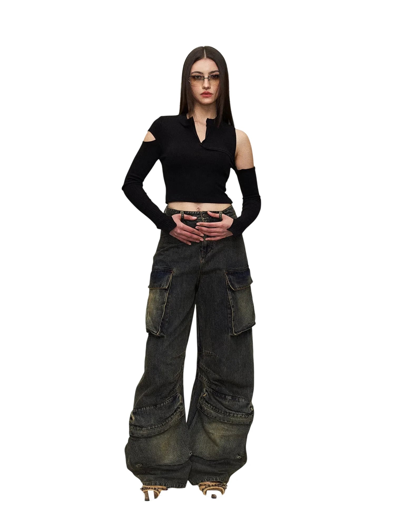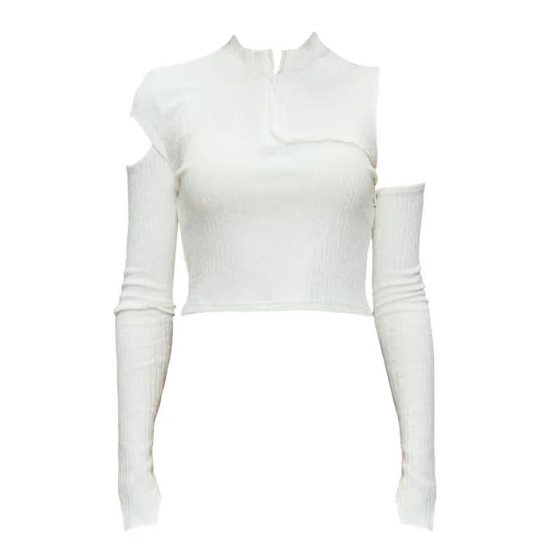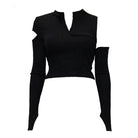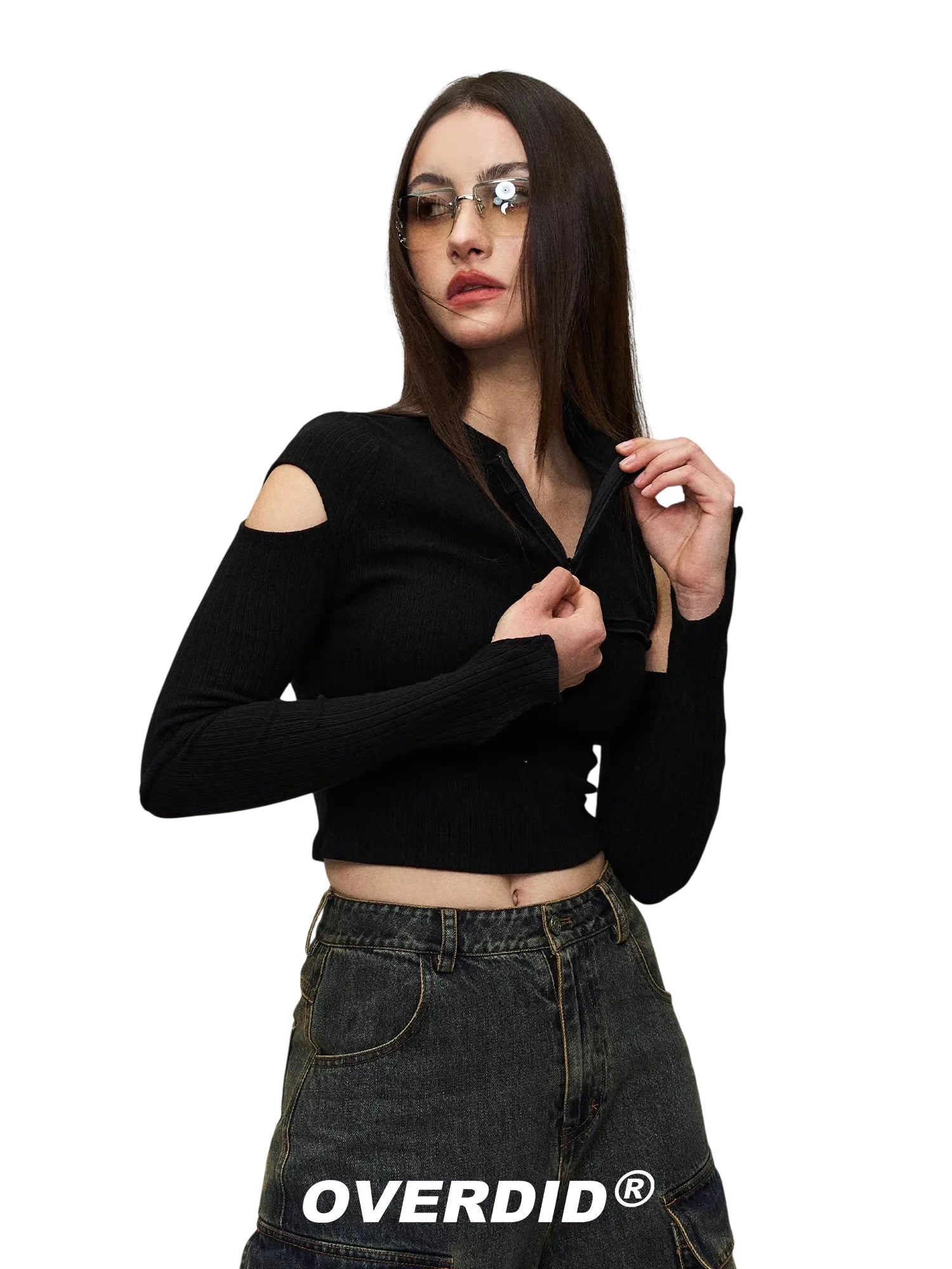 Elevate your casual wardrobe with this trendy off-shoulder knit crop top designed for women. Crafted with a ribbed texture, this black top features stylish asymmetrical cutouts on the shoulders for a bold, modern look. A collared neckline and front button detail add structure and sophistication, while the cropped length pairs perfectly with high-waisted jeans or skirts. Ideal for spring and summer wear, this top makes a fashion-forward statement for any hot girl look.