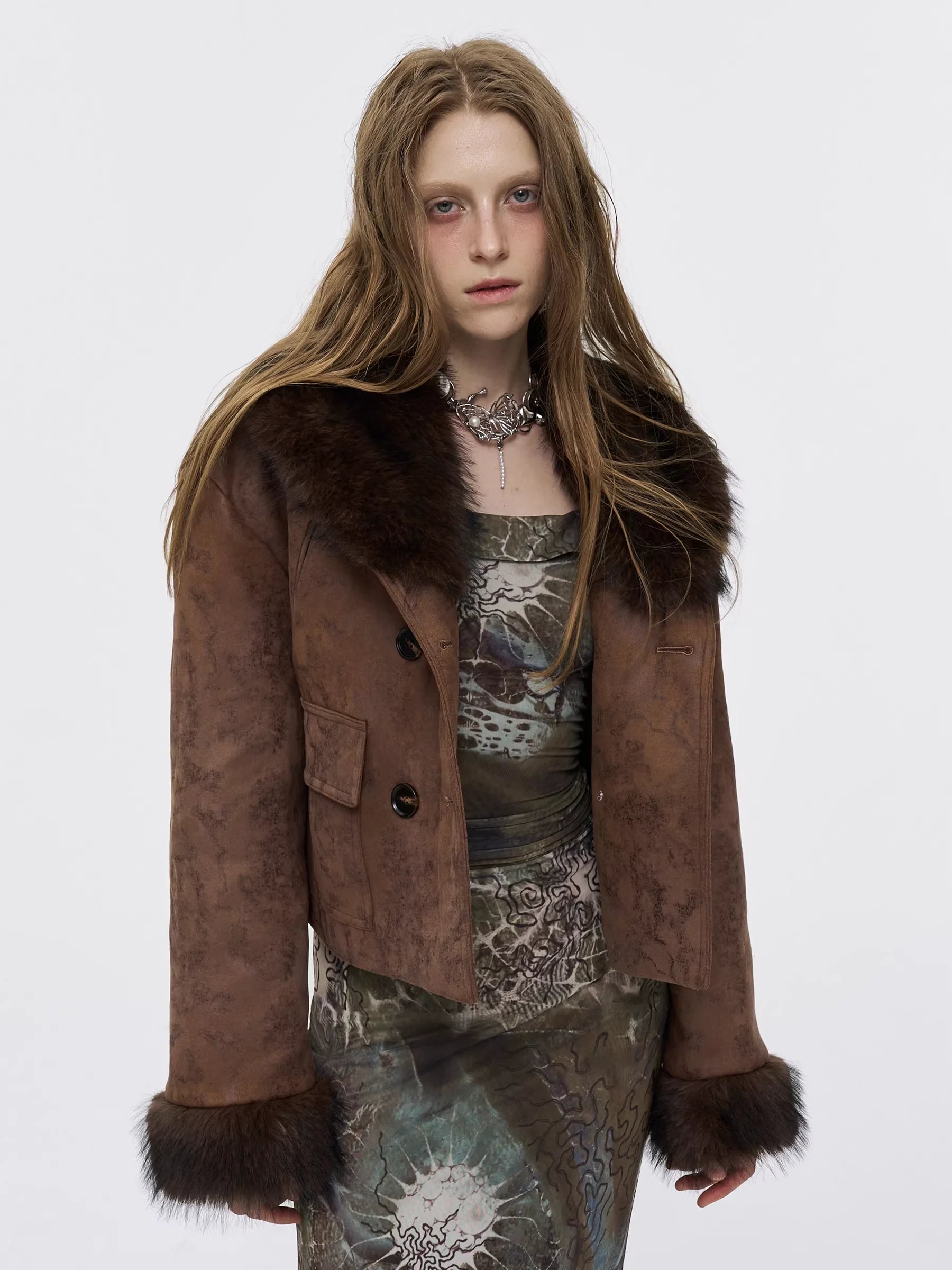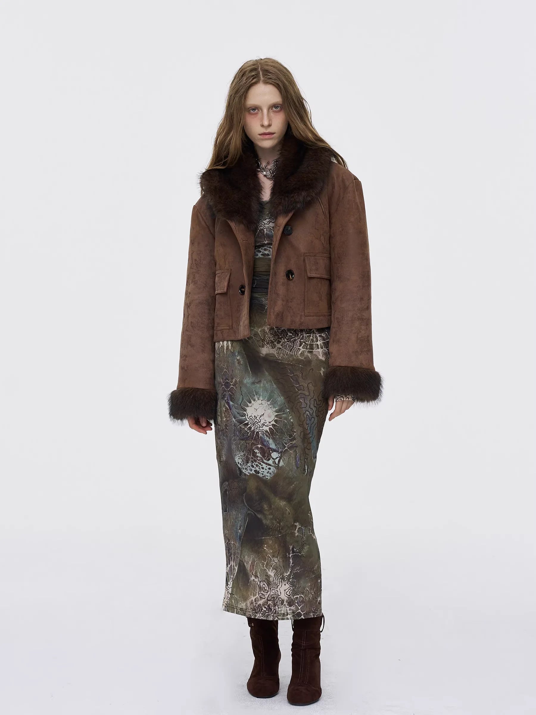 This women's cropped suede jacket blends modern elegance with vintage charm. Crafted in a rich red-brown hue, it features a plush fur collar and cuffs in deep brown for added warmth and sophistication. The quilted short design, paired with subtly flared sleeves, lends a contemporary silhouette perfect for the colder seasons. Styled here with an artistic, body-contouring dress, this jacket is ideal for autumn and winter ensembles.