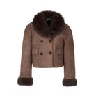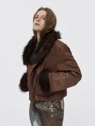 Amee Red-Brown Cropped Suede Jacket with Fur Collar and Quilted Design