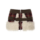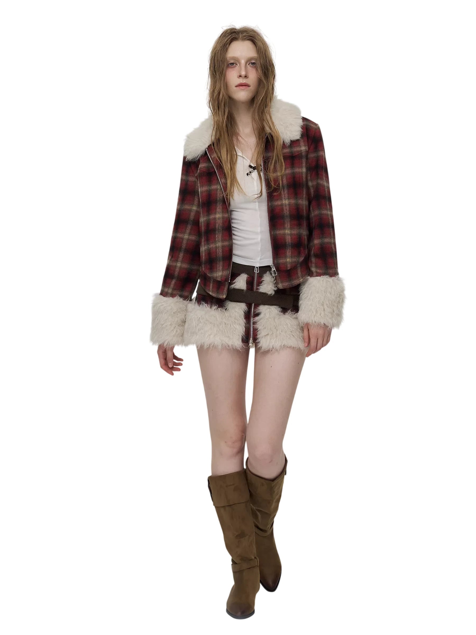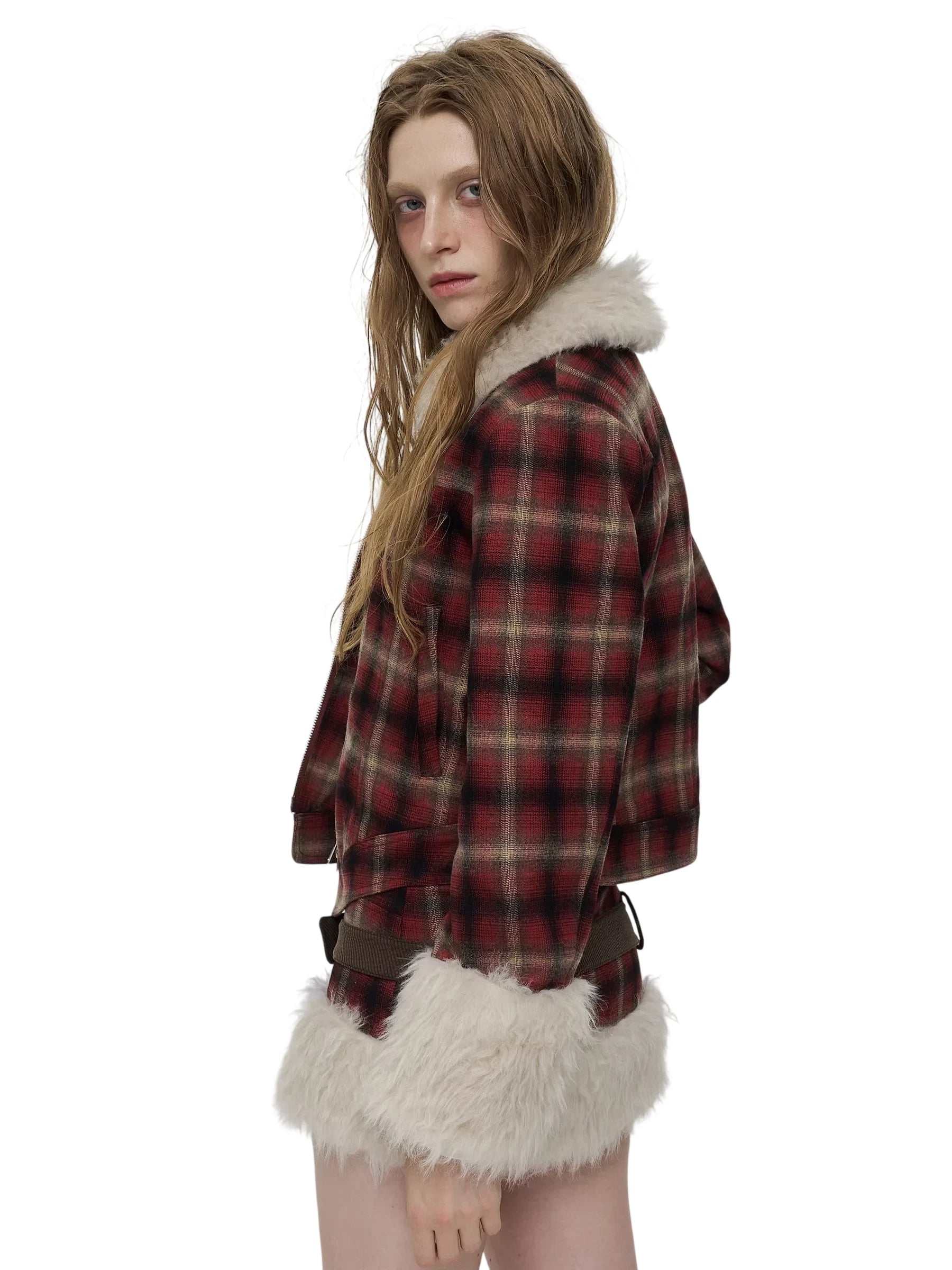 Embrace the festive spirit with this vintage-inspired red plaid jacket and shorts set. Designed for women, the ensemble features a cozy quilted jacket with a zip front, functional pockets, and thick white faux fur trim along the collar and cuffs. Paired with coordinating mini shorts that include a matching belt and faux fur hemline, this set offers a stylish alpine look. Perfect for holiday events or seasonal outings, it combines modern flair with classic winter charm.