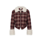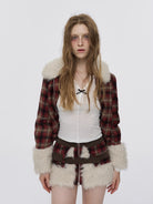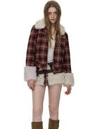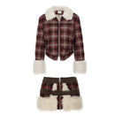 Amee Red Plaid Faux Fur Trim Quilted Jacket and Shorts Set