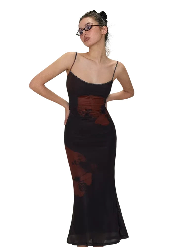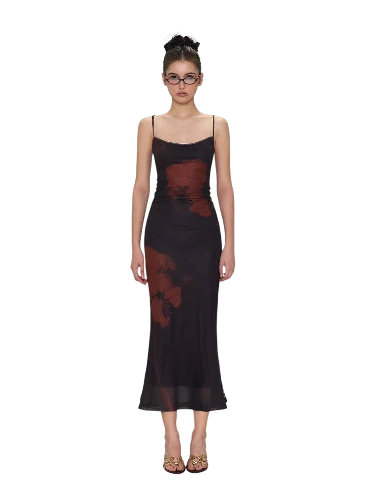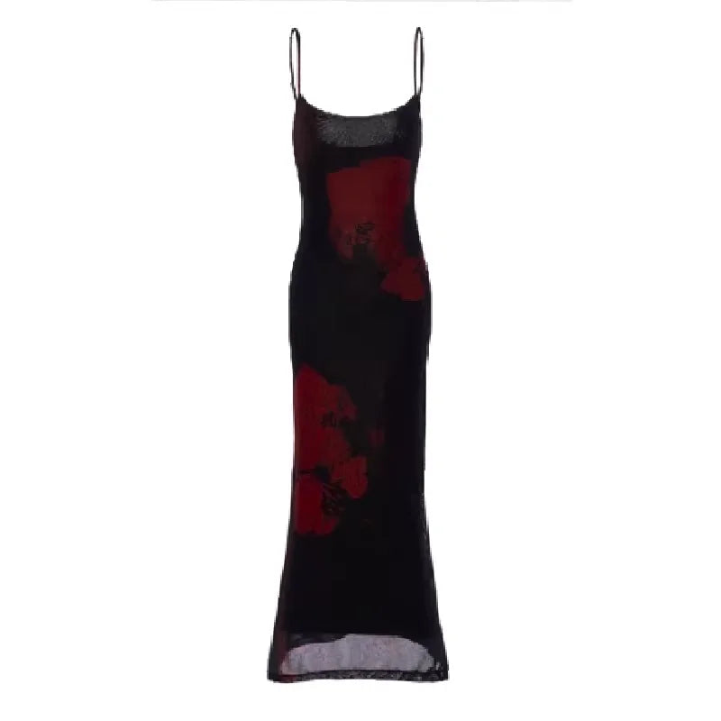 This elegant women's maxi dress features a vintage-inspired design with spaghetti straps and a slim fit silhouette that enhances the figure. Crafted from lightweight mesh fabric, the dress offers a semi-sheer effect with delicate red floral print accents along the sides. The soft flared hem adds a graceful touch, making it ideal for both casual outings and special occasions. Styled with minimal accessories, it embodies effortless sophistication and modern appeal.