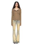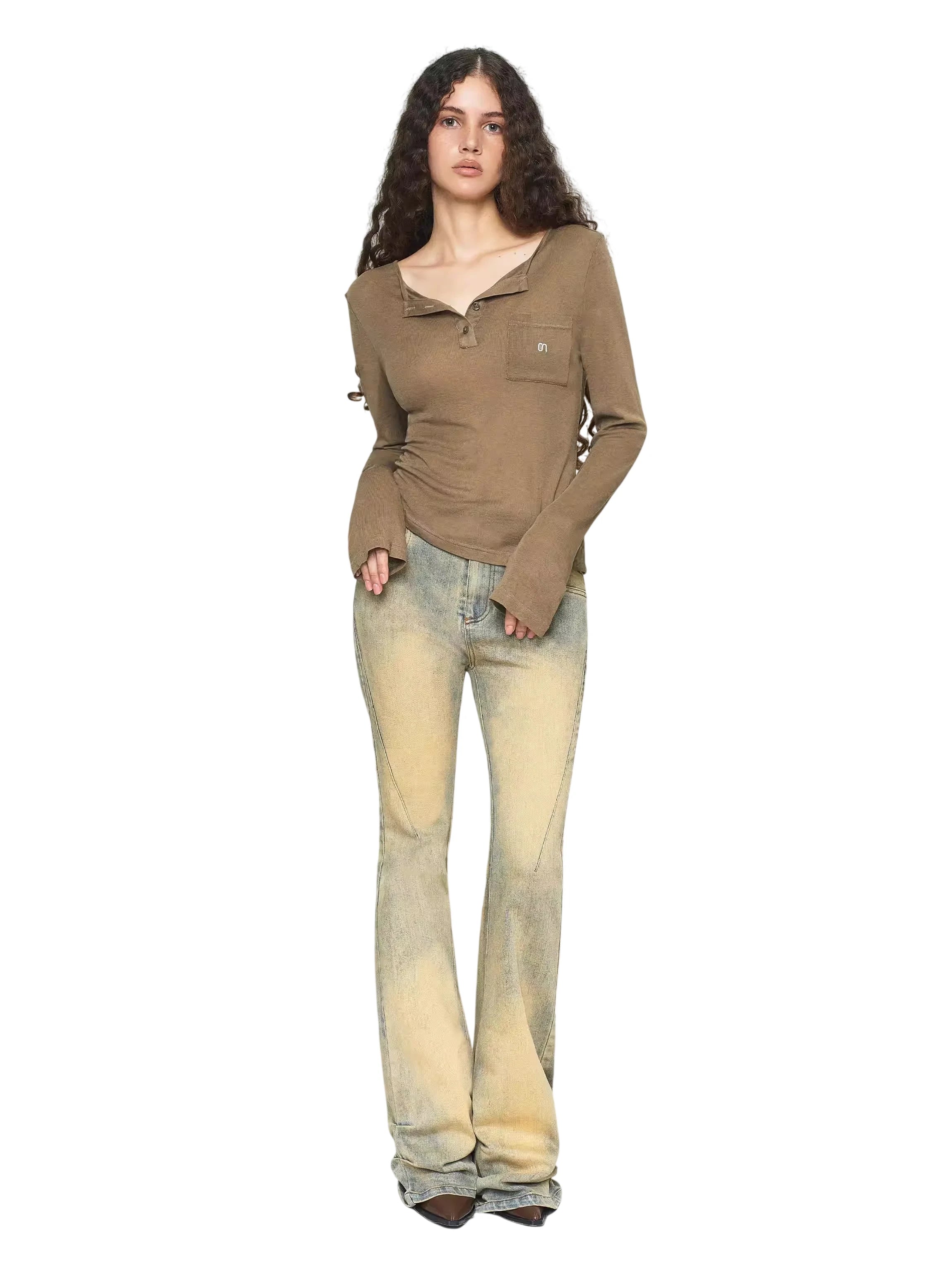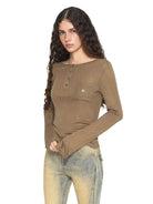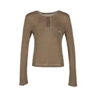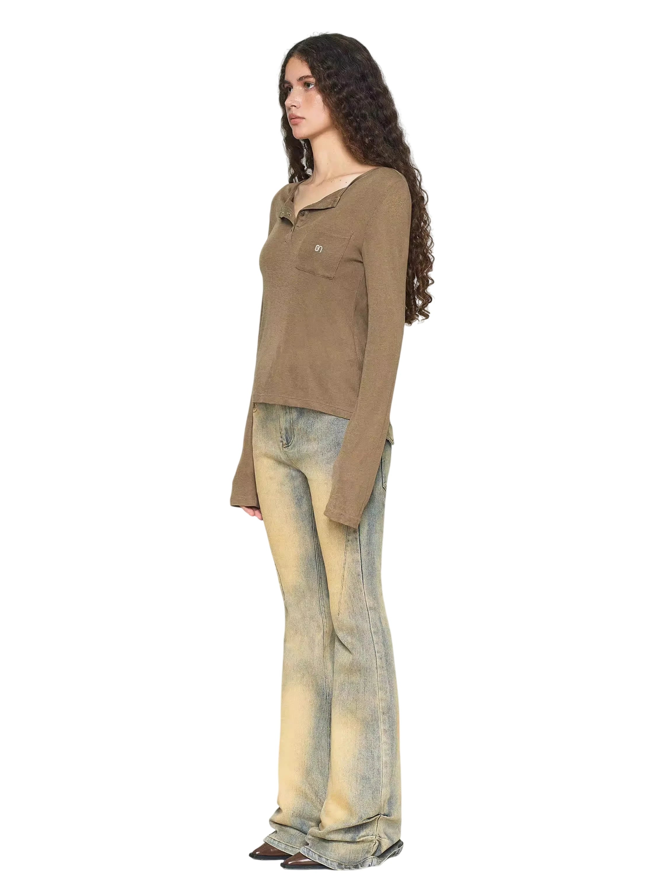 Elevate your autumn wardrobe with this women's vintage-inspired long-sleeve knit top. Crafted with cozy fabric, it features a stylish asymmetrical neckline and a partial button placket for a relaxed yet refined silhouette. A small chest patch pocket is accented with subtle embroidery, adding a touch of charm. Pair it effortlessly with denim for a casual yet polished look.