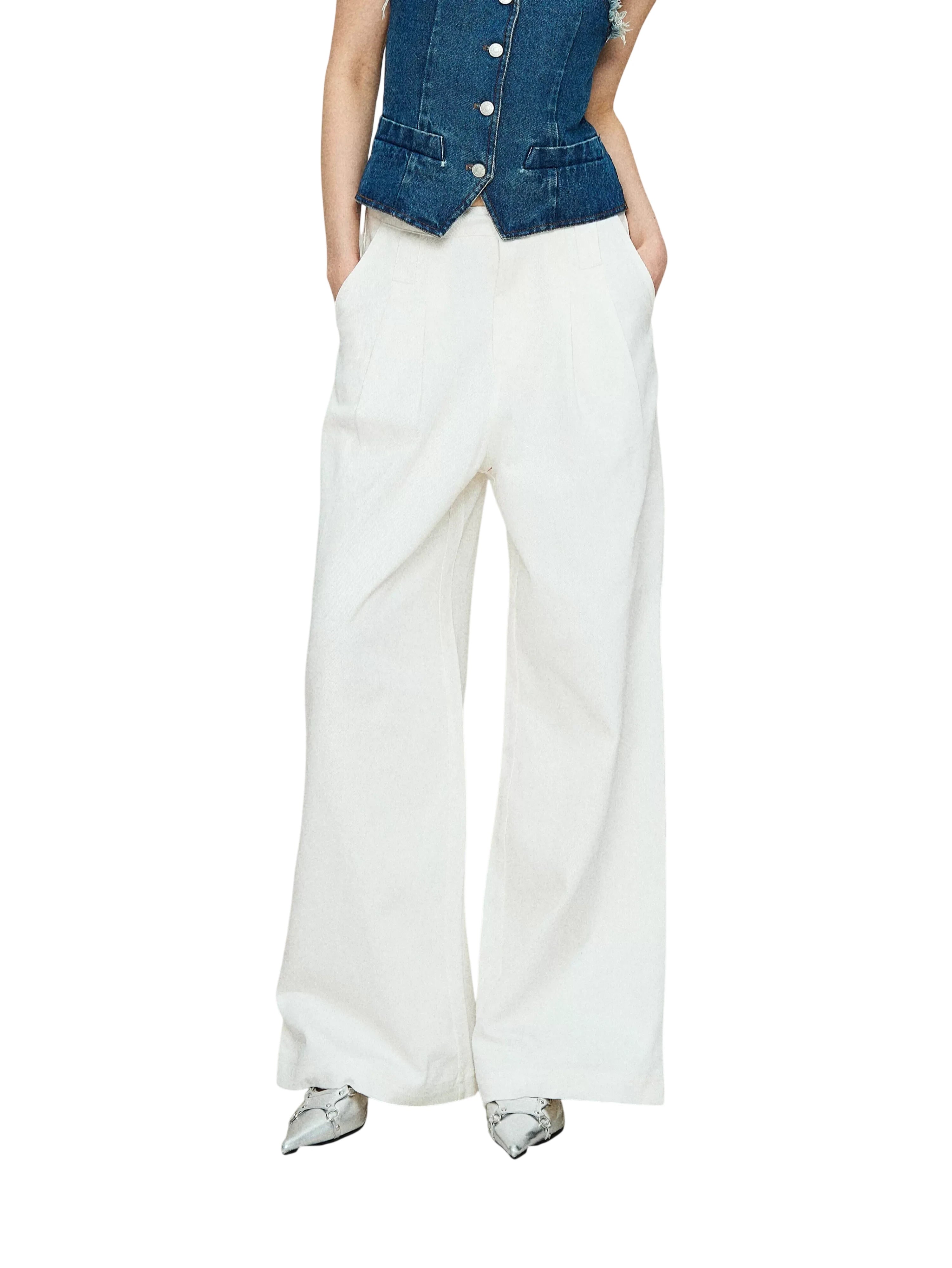 Elevate your everyday style with these women's high-waisted wide-leg pants. Designed with front pleats and side pockets, they offer a flattering silhouette and comfortable fit. The tailored finish, along with a button and zip closure, brings a touch of sophistication to this versatile piece. Pair effortlessly with cropped tops or blouses for a casually refined look.