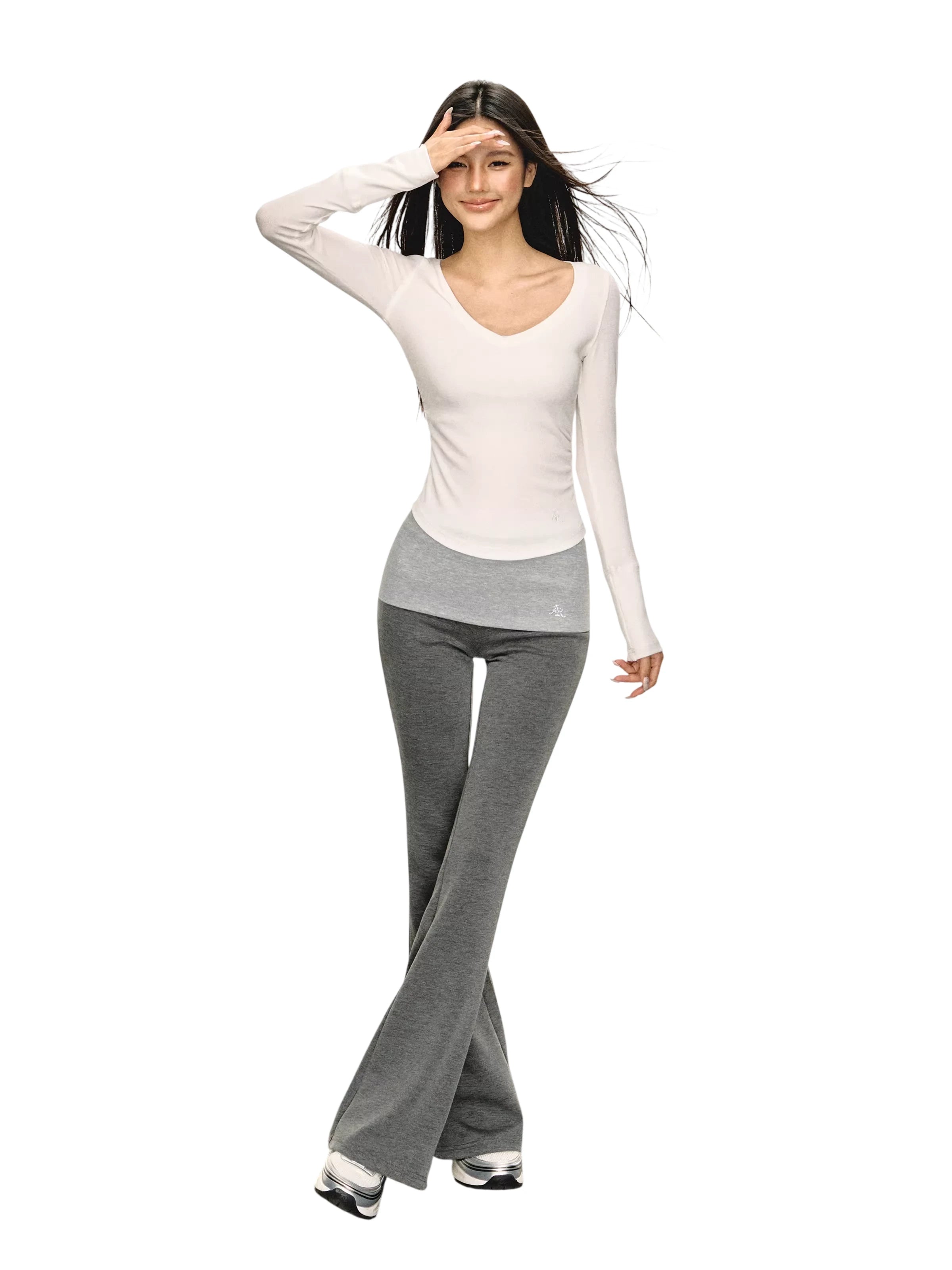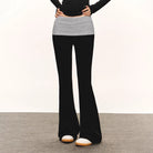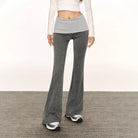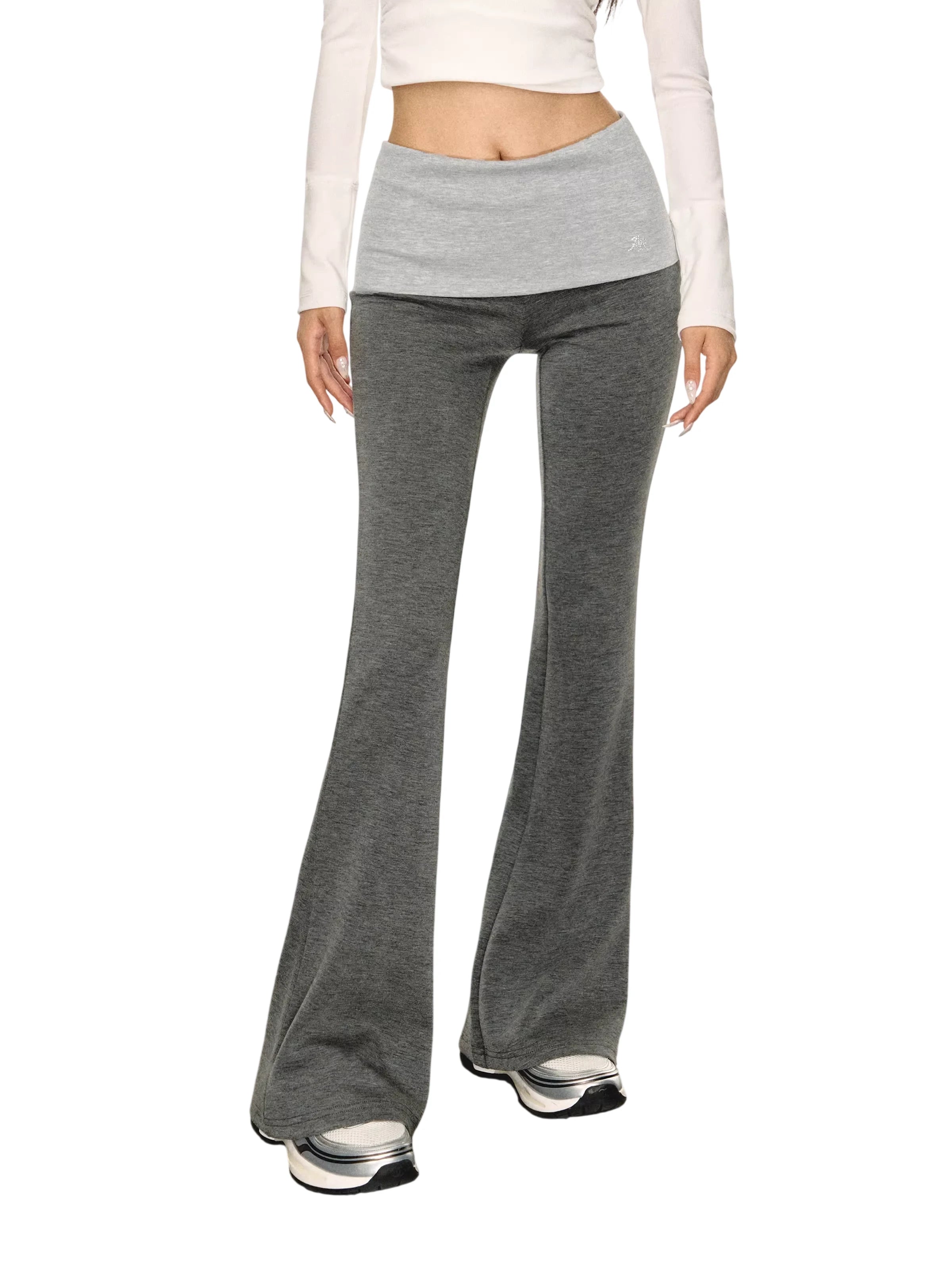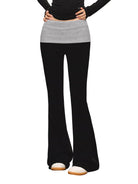 Elevate your activewear with these stylish white flared yoga pants for women, designed with a flattering fold-over waistband that offers both support and comfort. The snug fit through the hips and thighs flares out below the knees, creating a sleek and elongated silhouette. Made from smooth, stretchy fabric, these trousers are perfect for yoga, workouts, or casual wear during the autumn season. Also available in grey, black, and light purple color options.