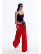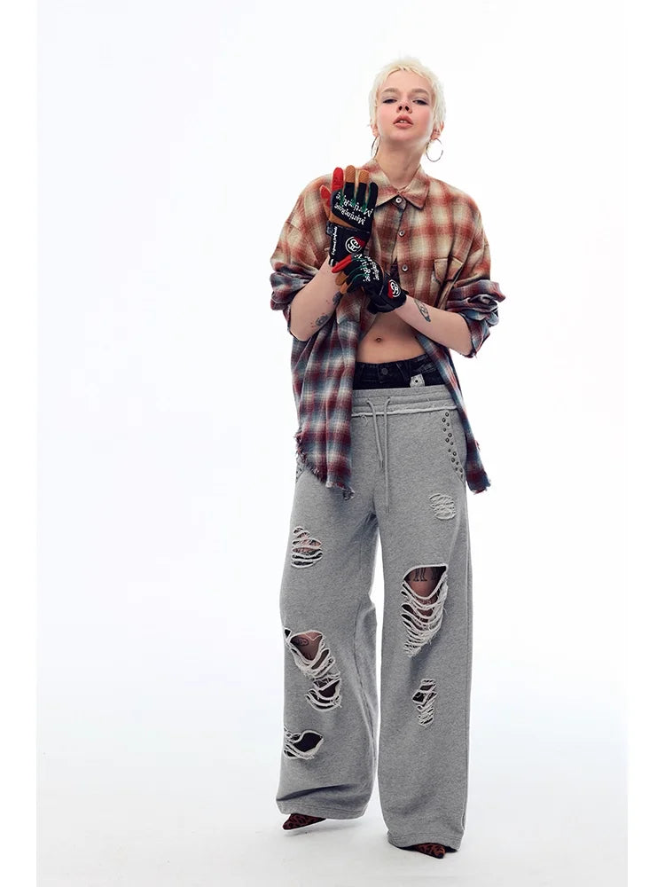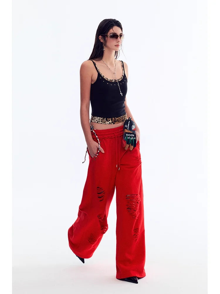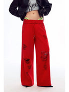 Designed for a bold and casual aesthetic, these high-waisted sweatpants feature dramatic distressed and ripped detailing for an edgy urban look. The wide-leg fit offers comfort and freedom of movement, while the washed red fabric adds a unique vintage appeal. Styled for women, these sweatpants are perfect for making a streetwear statement.