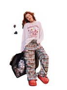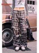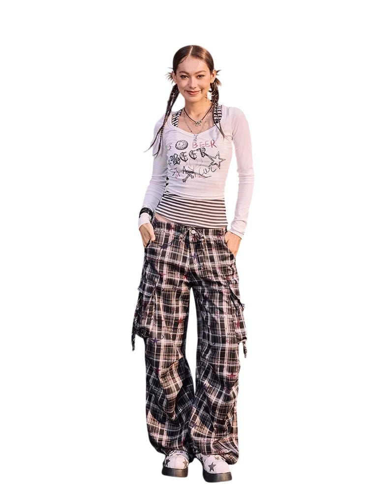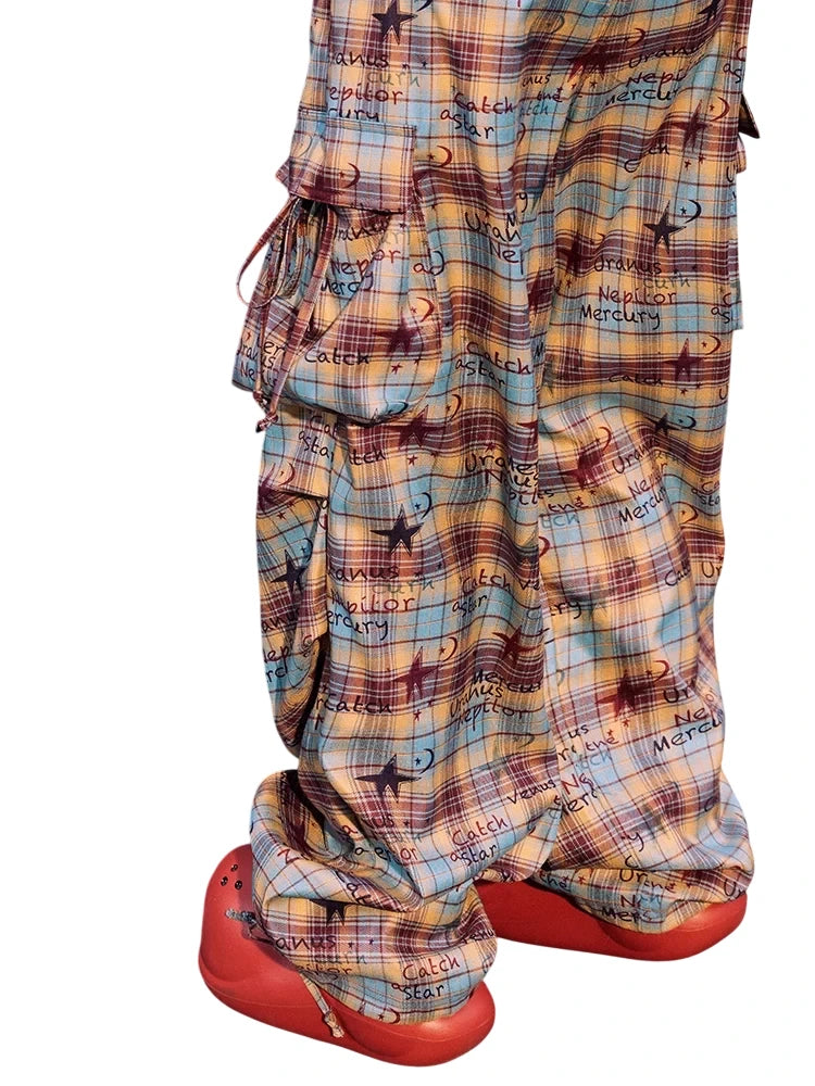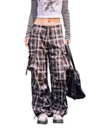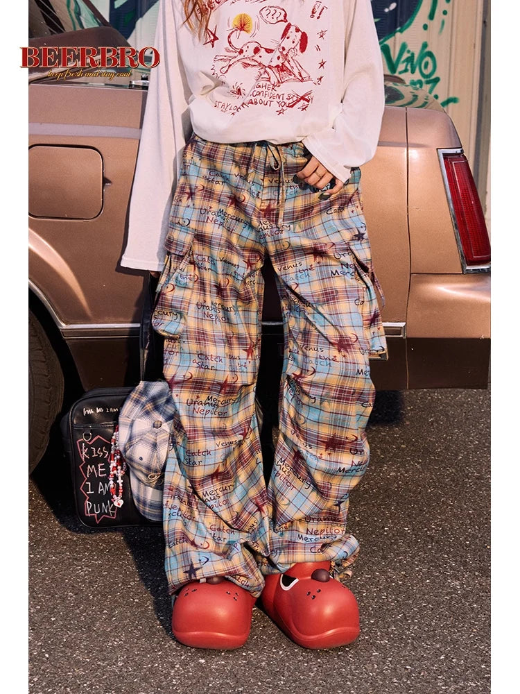 BeerBro Graffiti Plaid Cargo Pants with Strap Pockets