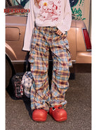 Make a bold streetwear statement with these graffiti plaid cargo pants, designed with a loose, straight-leg fit for maximum comfort and edge. Featuring an eye-catching multicolored plaid print with paint splatter and writing details, these pants bring a punk-inspired look to any outfit. The multiple strap pockets add both style and practicality, while a drawstring waist ensures an adjustable fit.