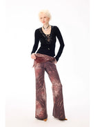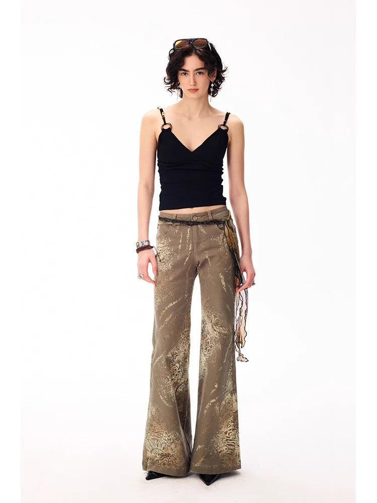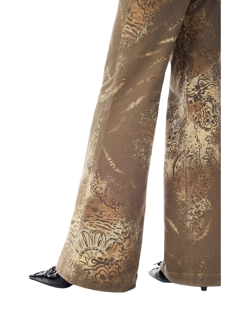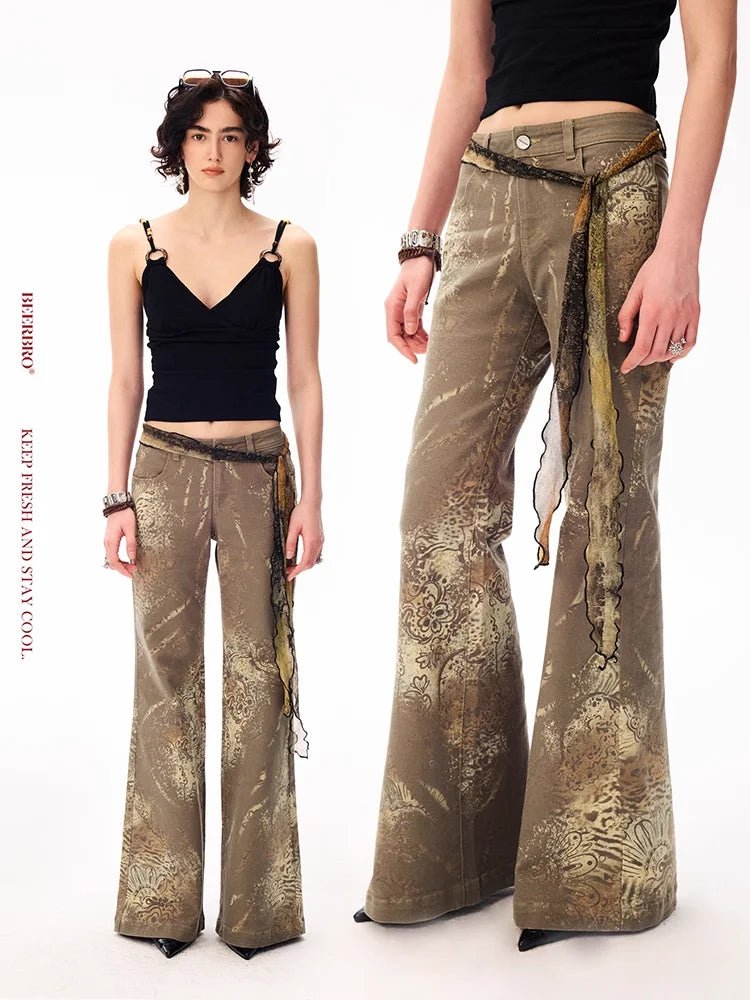 Elevate your casual wardrobe with these stylish high-waisted flared pants for women, designed with a vintage-inspired paisley and abstract print. These slim-fit pants feature a flattering olive-brown tone and a flowing silhouette that blends comfort with a touch of retro flair. Accentuated with a sheer, multicolor belt tied at the waist, they offer versatile styling options. Ideal for casual outings or making a bold fashion statement, these pants pair effortlessly with crop tops or fitted tees.