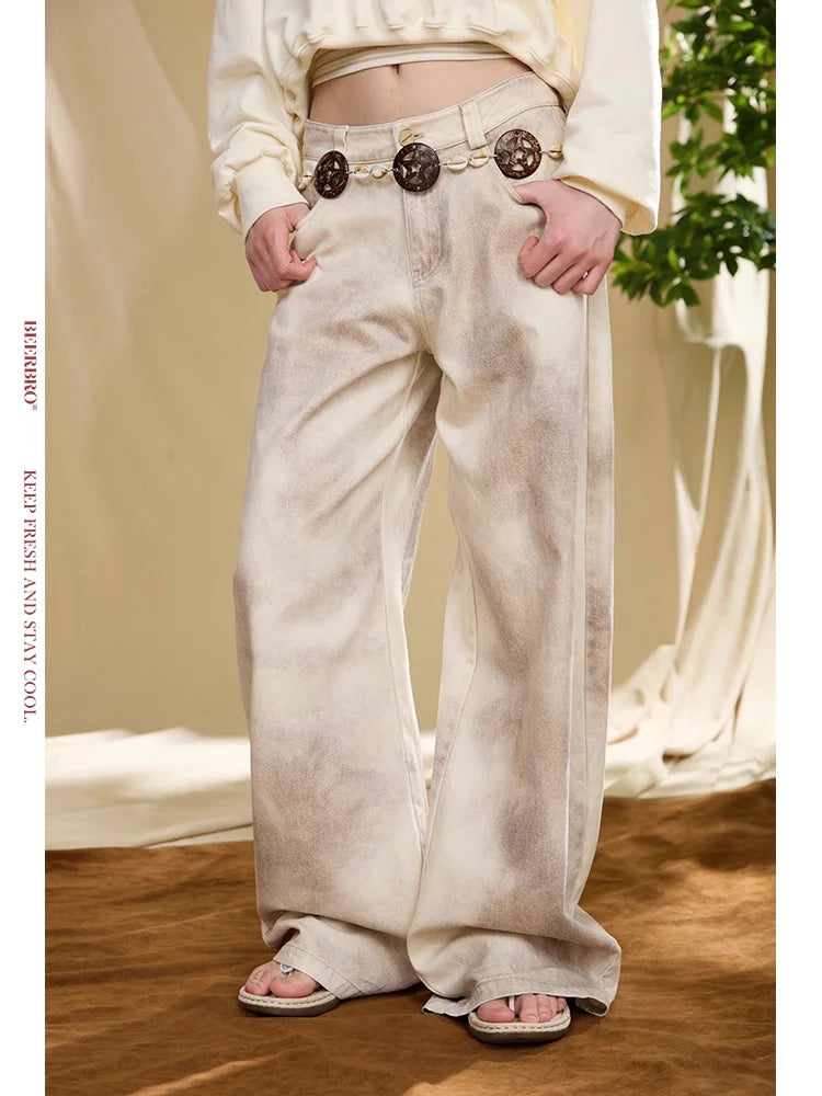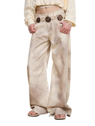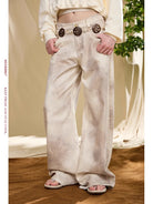 Elevate your summer wardrobe with these women's high-waisted wide-leg pants, crafted from comfortable Tencel Lyocell fabric. Featuring a distinctive snake-inspired tie-dye pattern in beige and black, these pants offer a relaxed fit perfect for casual wear. Enhanced by a curved blade cut and heavy enzyme wash, the design includes a unique double belt detail—a braided rope-style accessory and a classic beige belt—delivering both style and versatility.