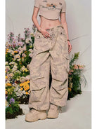 These women's high-waisted cargo jogger pants feature a beige camouflage pattern and a relaxed wide-leg fit. Designed with multiple utility pockets and a drawstring waist, they offer both comfort and street-style appeal. The durable fabric and loose silhouette make them ideal for casual wear or adding an urban edge to your outfit.