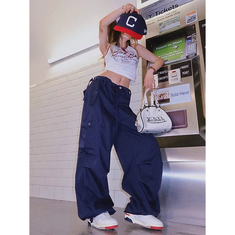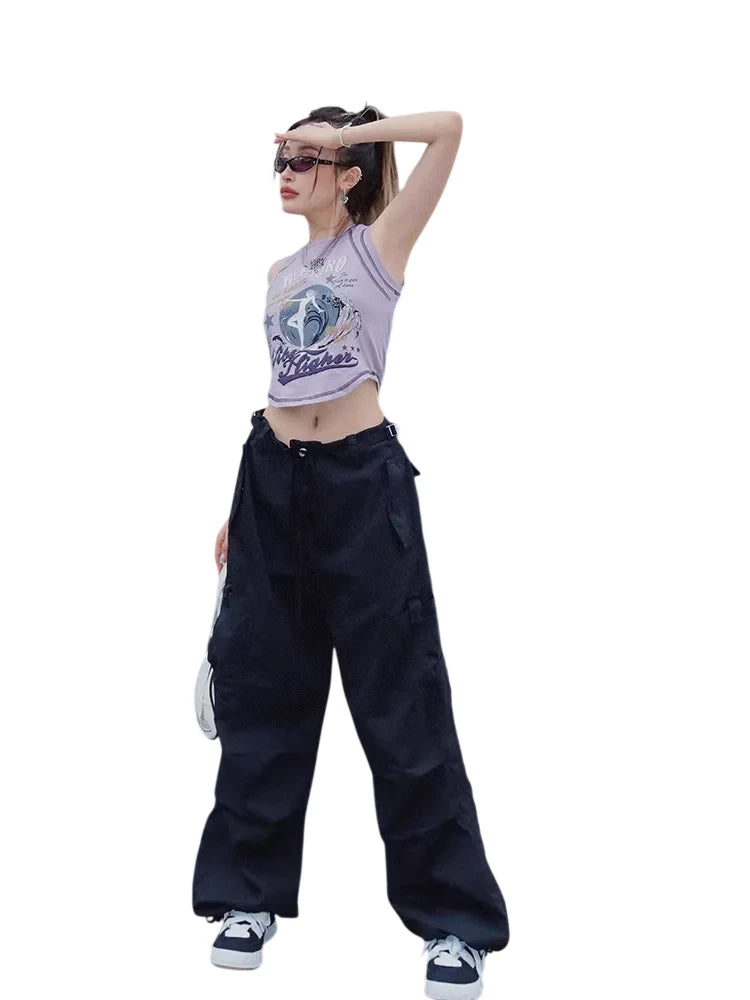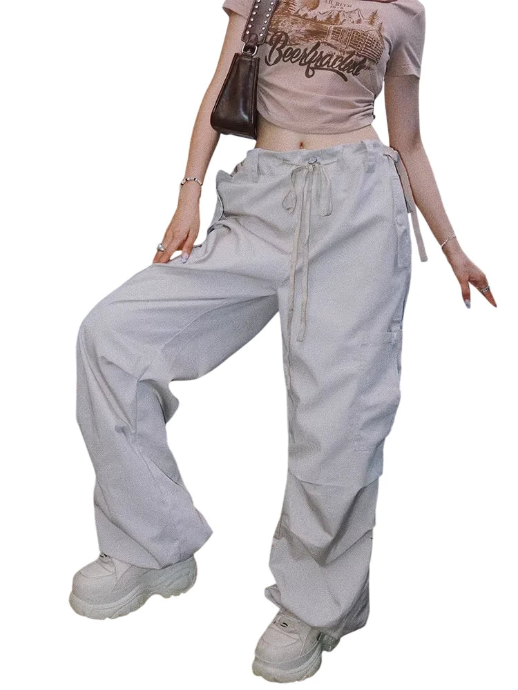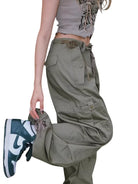 Step up your streetwear game with these stylish green cargo pants designed for women. Crafted in a high-waisted, loose-fitting silhouette, these pants feature an elastic drawstring waistband and multiple side flap pockets for a utilitarian look. The parachute design and drawstring cuffs add a trendy edge, making them perfect for casual and outdoor settings.