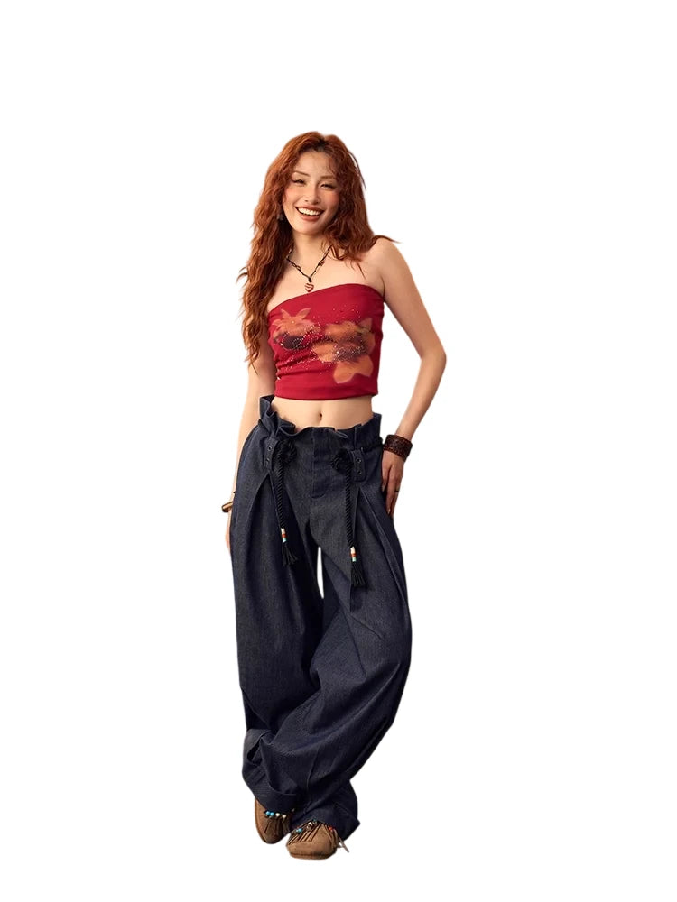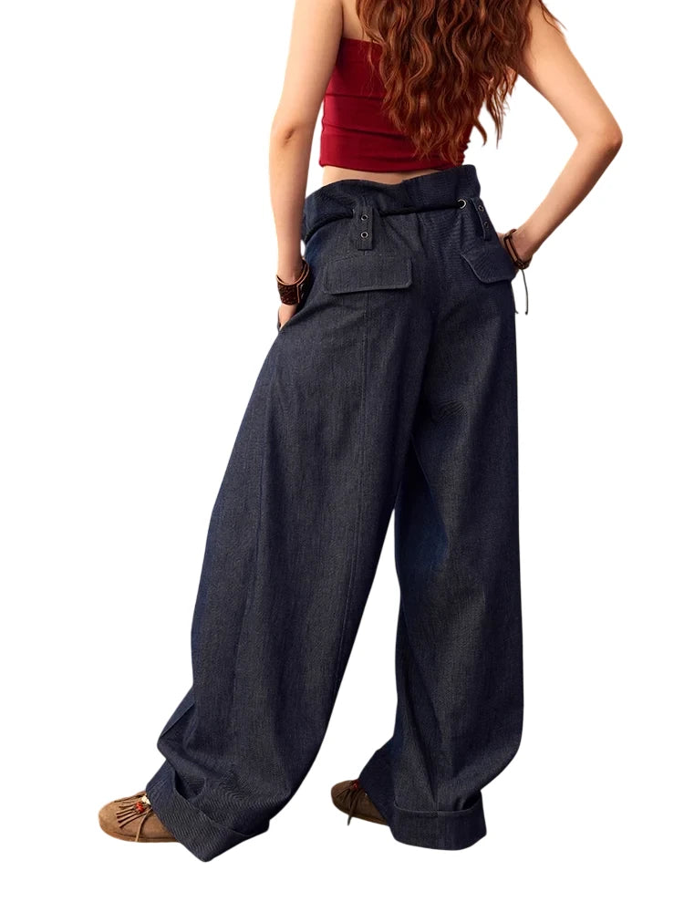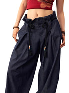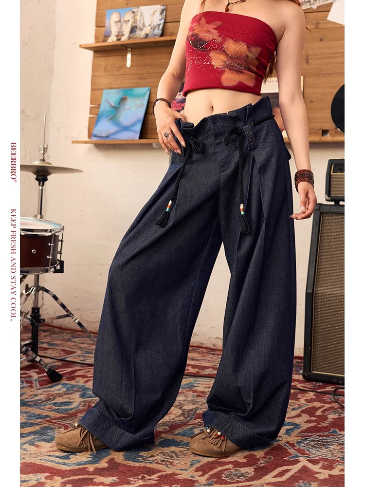 Elevate your style with these women's high-waisted, wide-leg casual pants. Designed for comfort and fashion, these pants feature a relaxed fit with a voluminous silhouette that flatters the figure. The drawstring waist includes thick rope ties adorned with beads, adding a touch of bohemian charm. Perfect for everyday wear, their dark denim fabric pairs effortlessly with a variety of tops for a laid-back yet polished look.