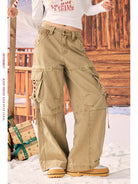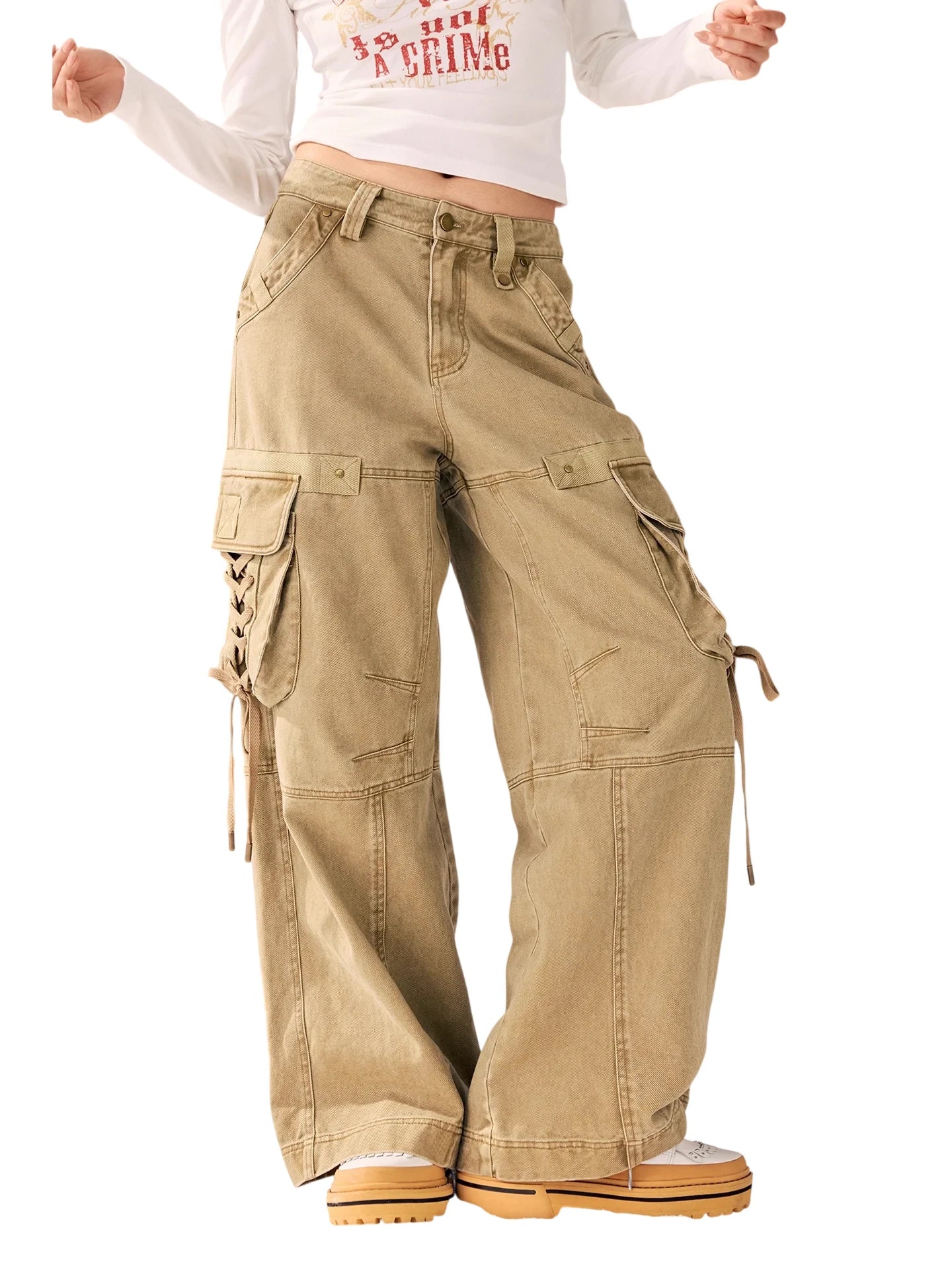 Elevate your street style with these women's high-waisted wide-leg cargo pants, crafted from a durable cotton blend. Featuring multiple flap pockets on the thighs and sides, and accented with stylish leg ties, these pants combine utility and trend effortlessly. Perfect for casual wear, the relaxed silhouette offers comfort and versatility for any cool-weather wardrobe.