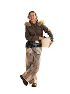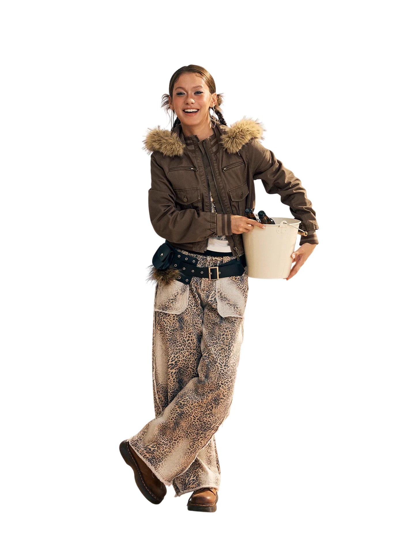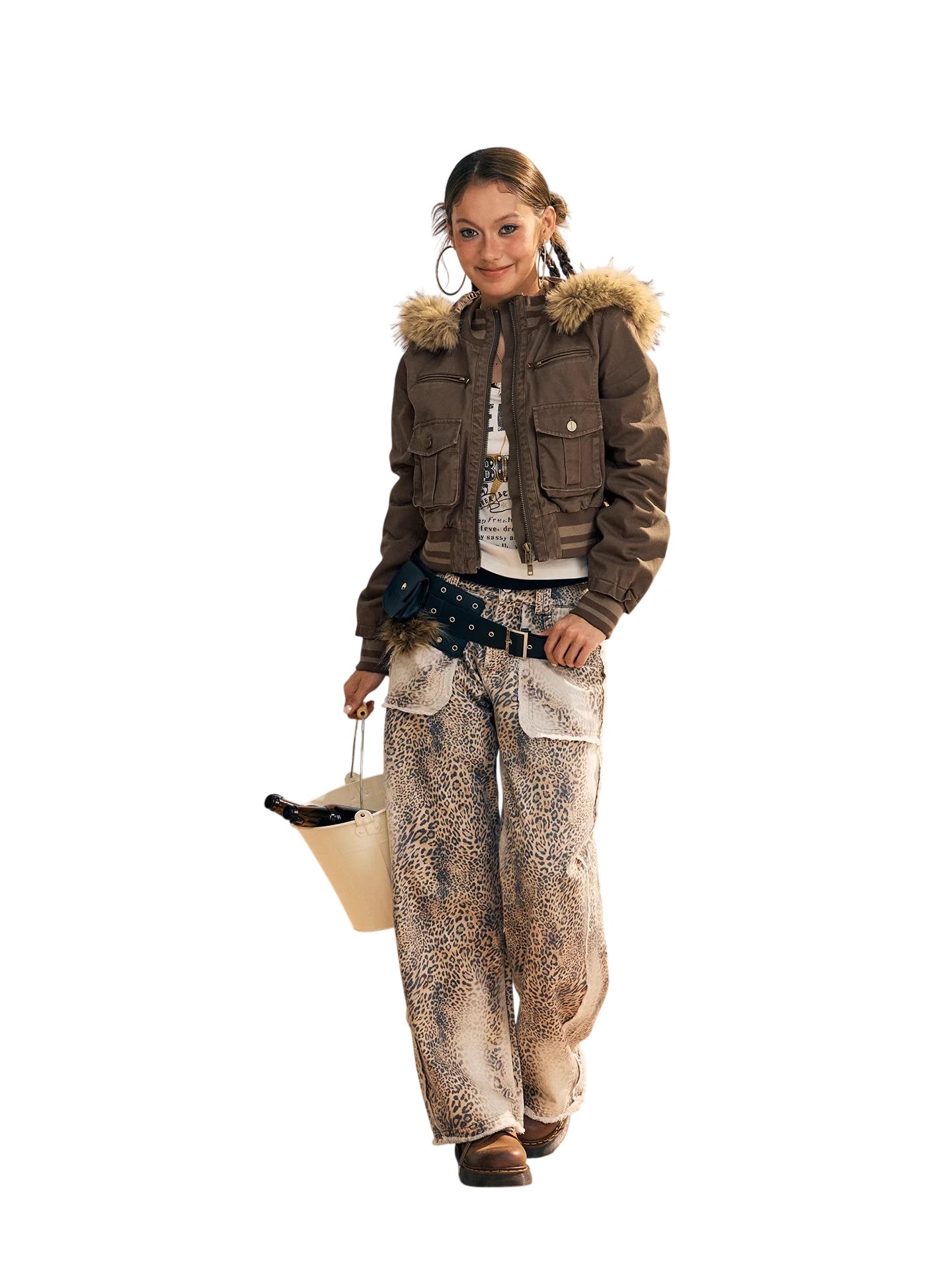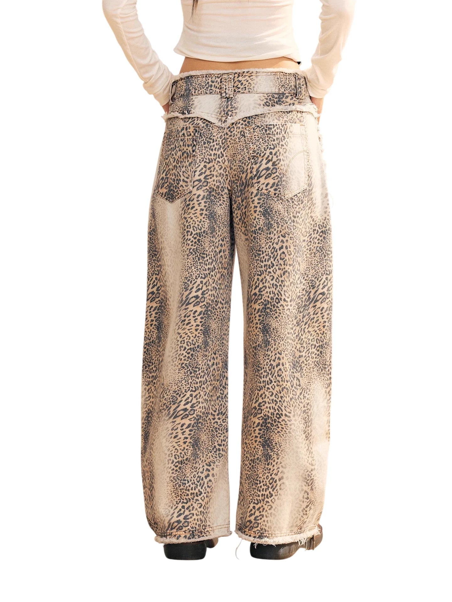 Make a bold statement with these women's wide-leg jeans, featuring an all-over leopard print pattern and a relaxed, loose-fitting silhouette. Designed with a high-waisted fit, the pants include oversized dual front pockets and a heavily distressed, faded denim finish. A frayed waistband enhances the edgy, streetwear-inspired aesthetic, making these jeans a standout choice for casual wear.