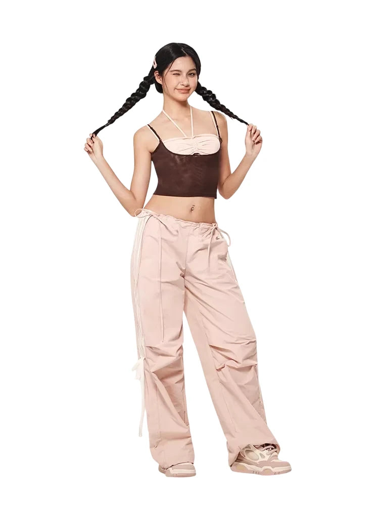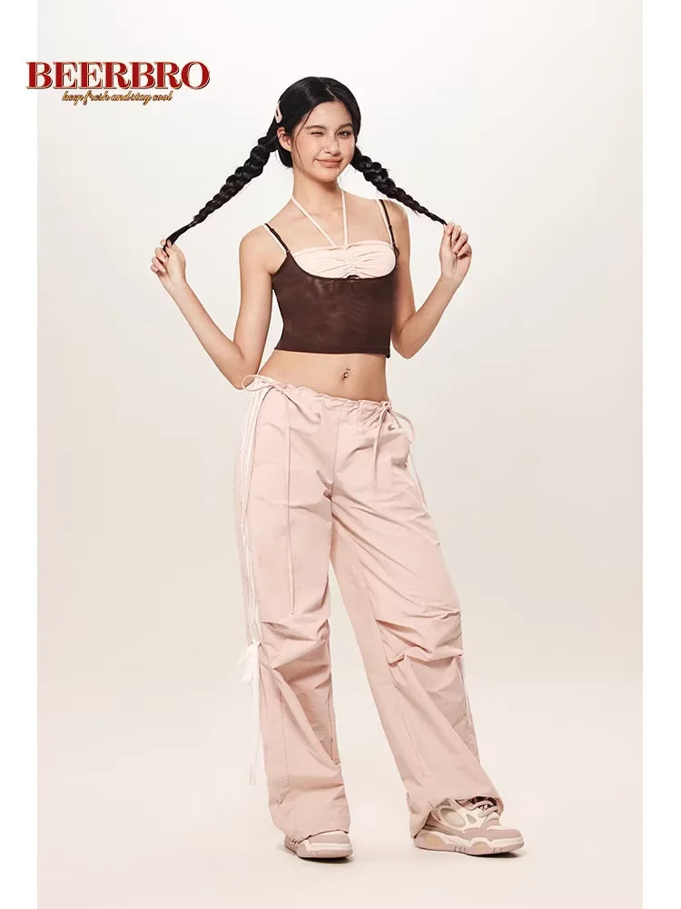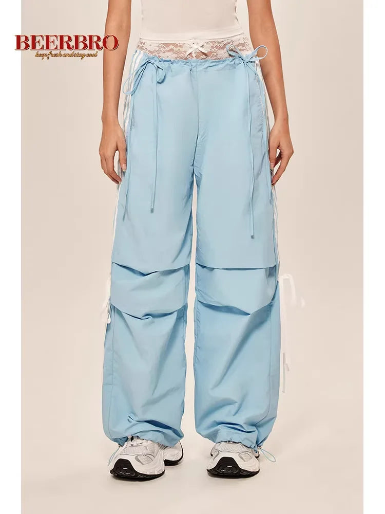 BeerBro Women's Loose Wide-Leg Cargo Pants with Lace-Up Detail
