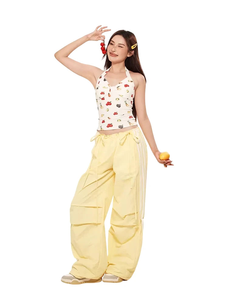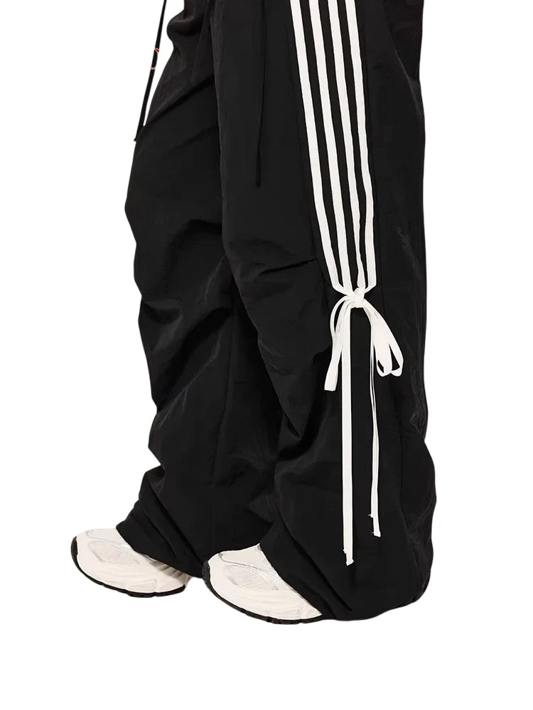 These women's wide-leg cargo pants offer a fashionable blend of comfort and streetwear style. Designed with a loose, floor-length fit, they feature sporty white side stripes and adjustable lace-up accents at the waist and lower legs. Perfect for casual summer wear, these trousers effortlessly combine practicality with a trendy, athletic vibe.