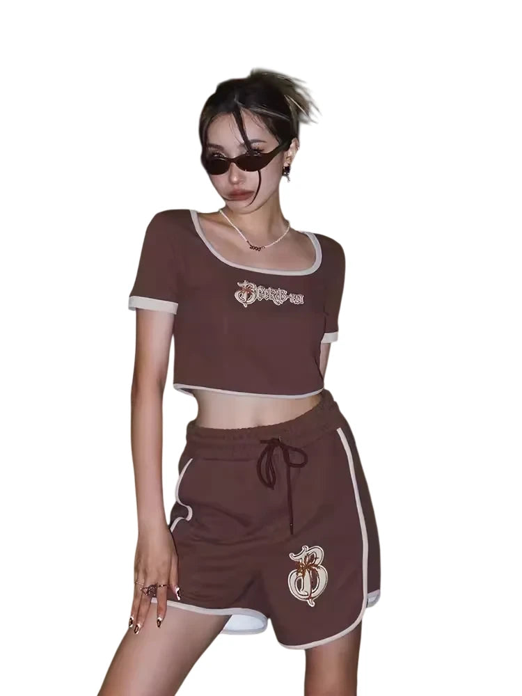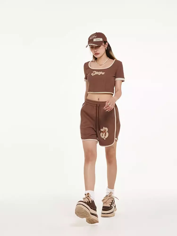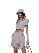 Stay cool and stylish this summer with this American retro-inspired two-piece set for women. The outfit features a beige cropped U-neck short sleeve top with contrast brown edging for a classic touch. Paired with high-waisted sports shorts that include an elastic waistband and drawstring, this set offers both comfort and flexibility. The shorts are adorned with a monogram-style embroidered logo, adding a subtle statement to the look. Crafted from breathable, textured fabric, this set is perfect for casual outings or relaxed summer days.