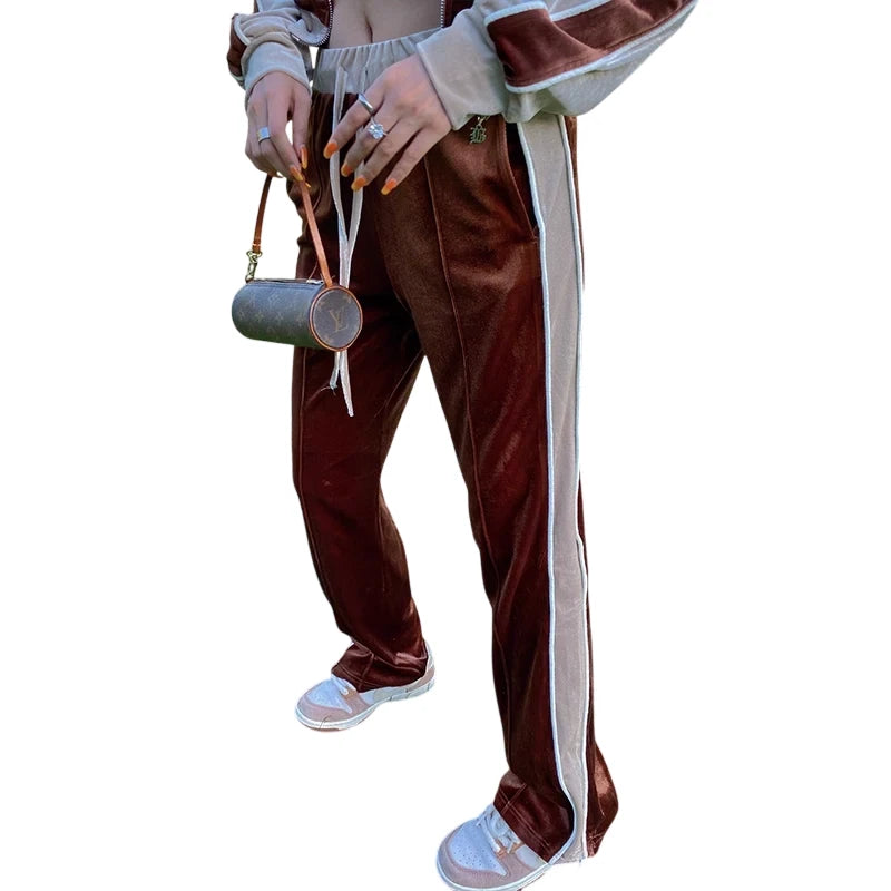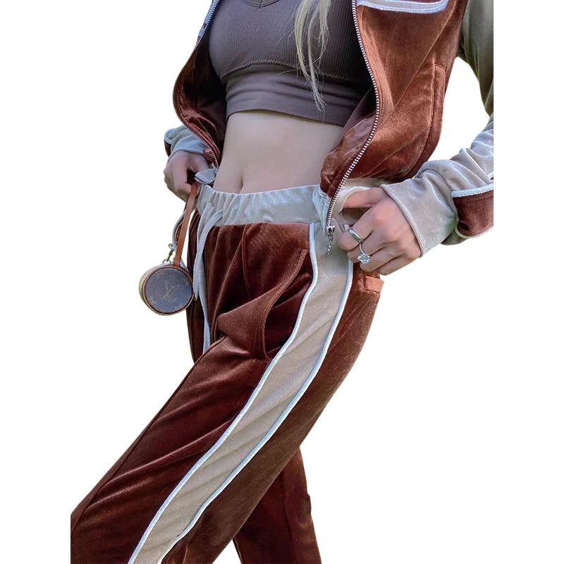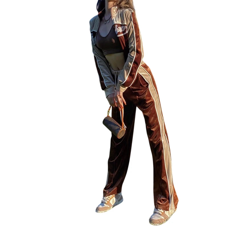 Elevate your casual wardrobe with this women's velvet tracksuit set, featuring a high waist design and straight-leg fit for a flattering silhouette. The outfit includes a matching track jacket and pants in a retro-inspired color block style with satin finish and side stripes. Perfect for outdoor strolls or relaxed gatherings, this sporty yet chic set combines comfort and vintage flair in a fashion-forward look.