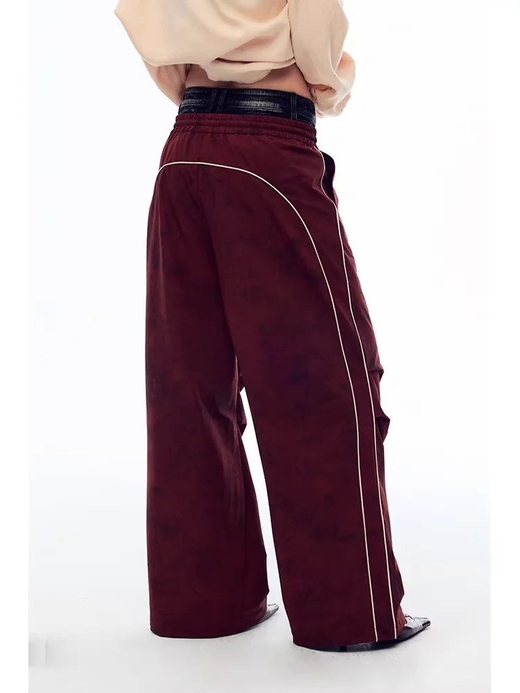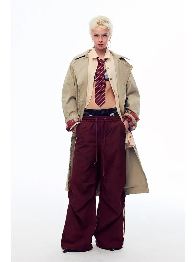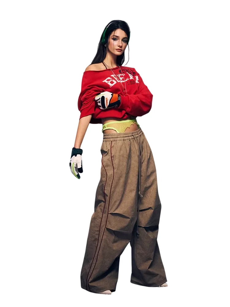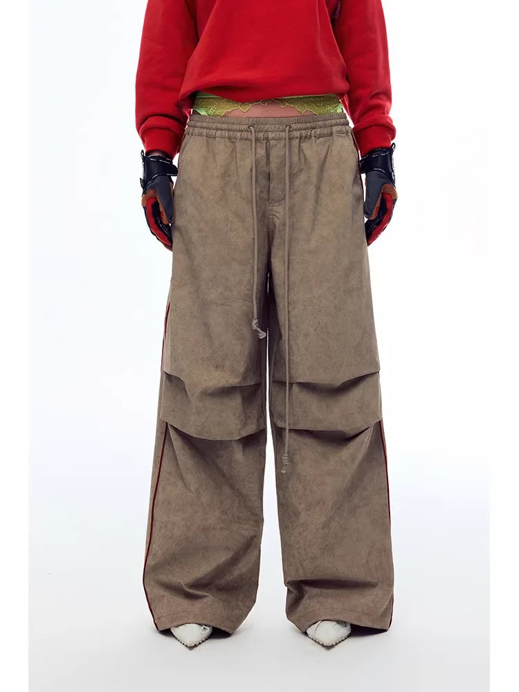 These women's vintage-style wide-leg paratrooper pants feature a unique iron flow print and a ruched, layered design for added texture and flair. Designed with a breathable fabric and casual drawstring waistline, they offer both comfort and street-inspired style. Vertical white piping along the seams enhances the silhouette, making these pants a perfect choice for bold, fashion-forward looks.