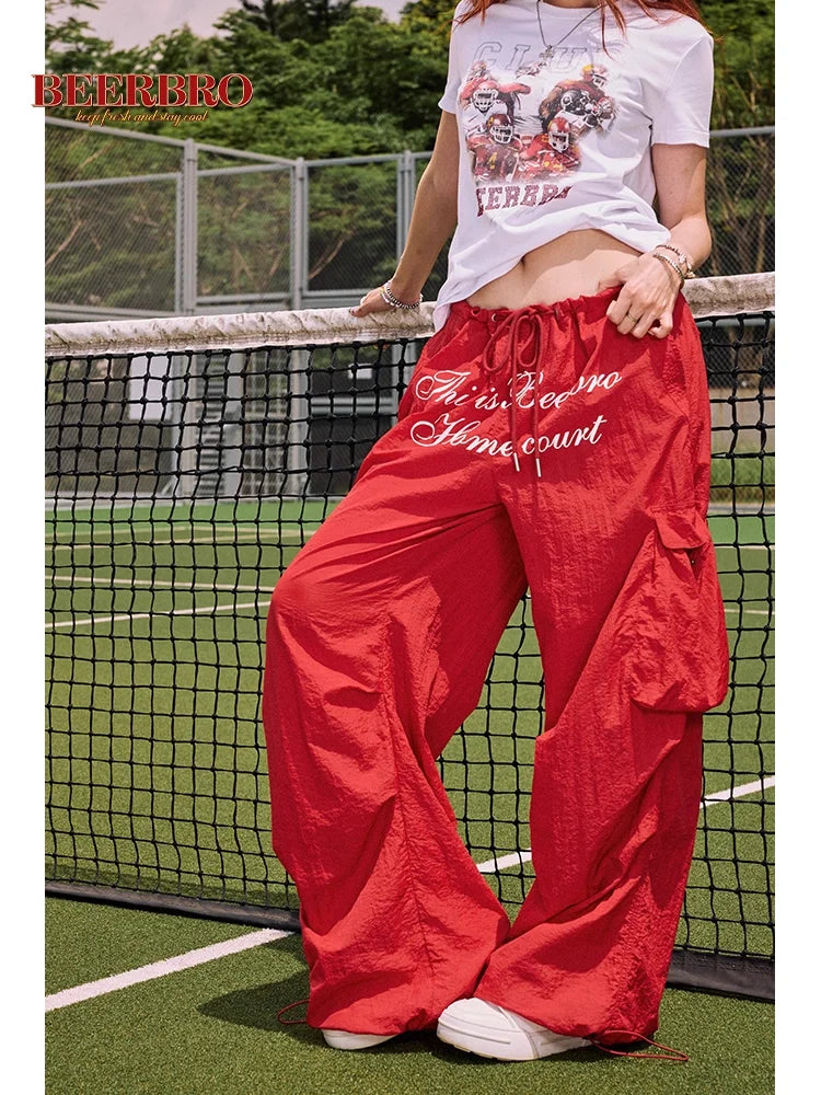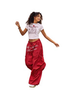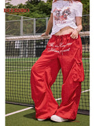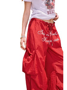 Elevate your streetwear look with these Y2K-inspired cargo pants designed for women. Featuring a bold red color and a loose, wide-leg silhouette, these trousers combine comfort and edgy style. A distinctive graphic print on the front adds a statement-making touch, while side cargo pockets and a drawstring waistband offer practicality and adjustability. Perfect for casual outings or laid-back sporty ensembles.