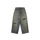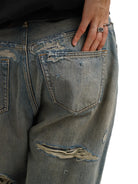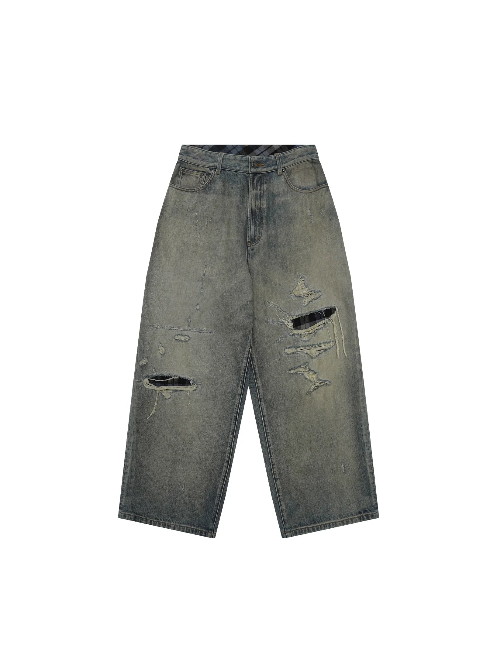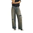 Make a bold style statement with these distressed wide-leg jeans. Designed for women, these high-waisted jeans feature a vintage washed blue finish and heavy distressing with frayed openings for an edgy, worn-in look. Unique black patchwork beneath select rips adds eye-catching contrast. Finished with a relaxed baggy silhouette, these jeans are perfect for streetwear-inspired outfits.