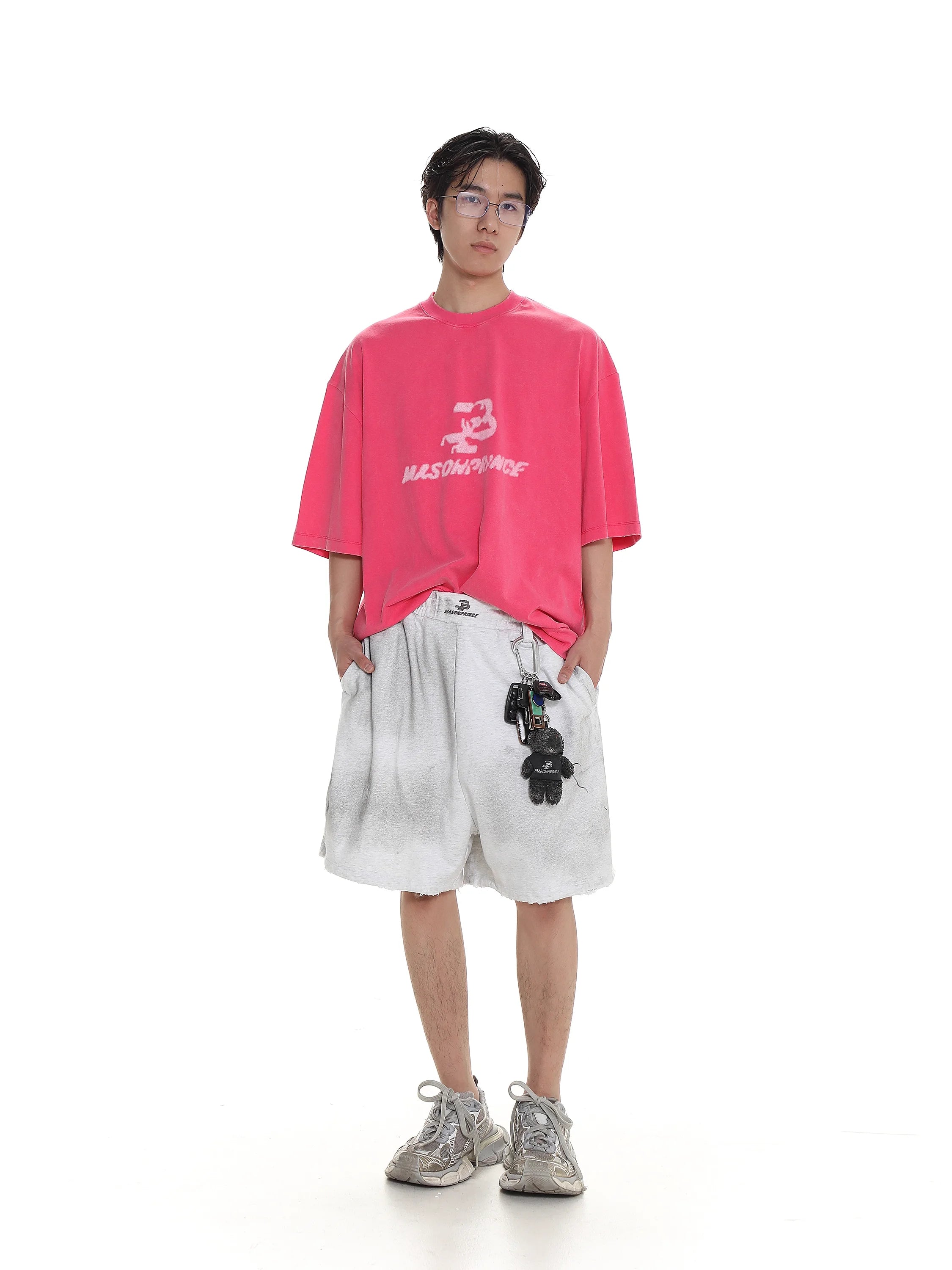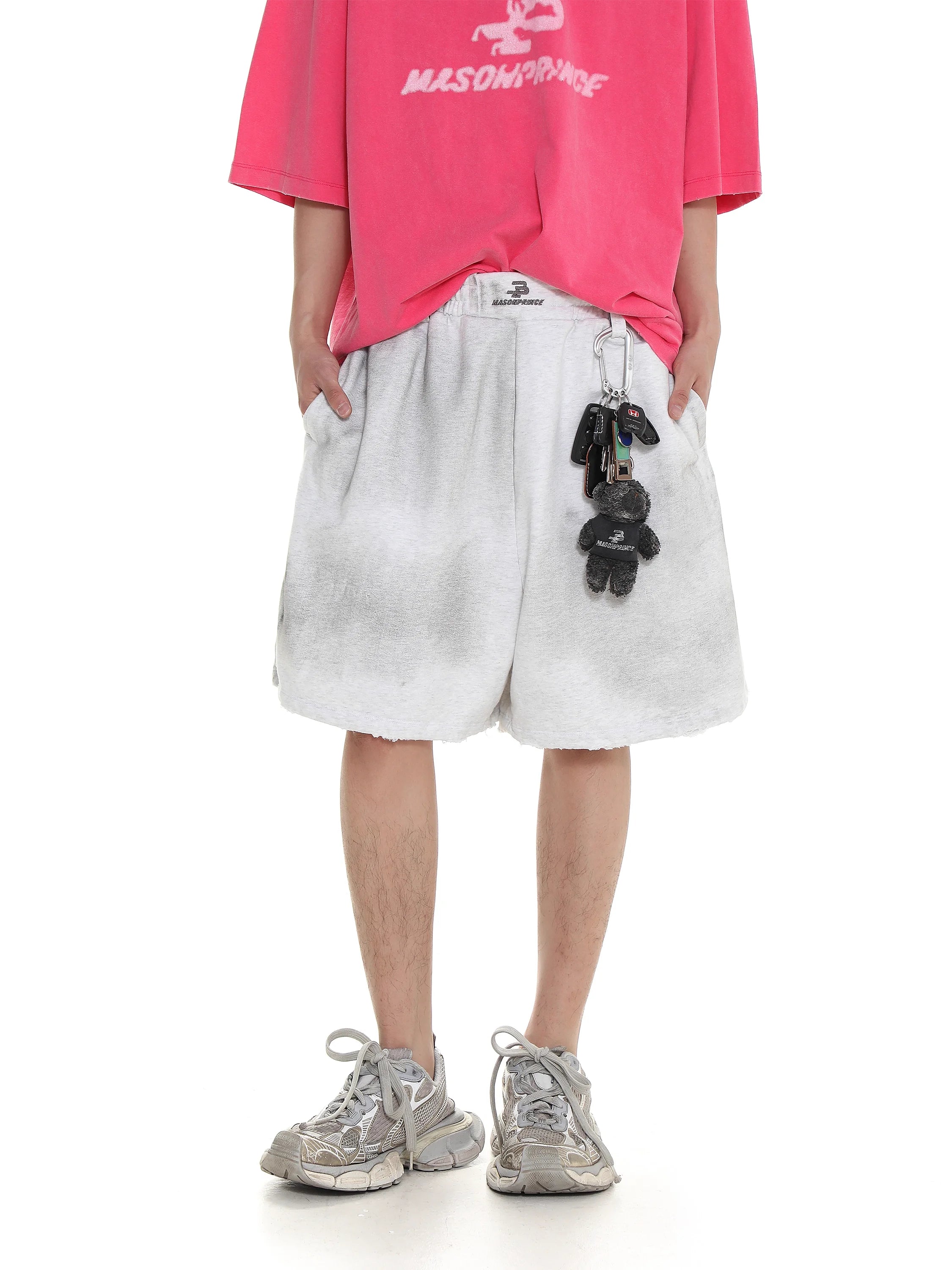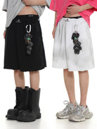 Elevate your casual streetwear look with these distressed terry basketball shorts featuring a classic stripe hem design. Designed with comfort and style in mind, these loose-fitting black shorts include functional details such as a utility carabiner clip accessorized with keychains, including a small plush bear for added urban flair.