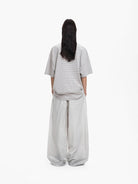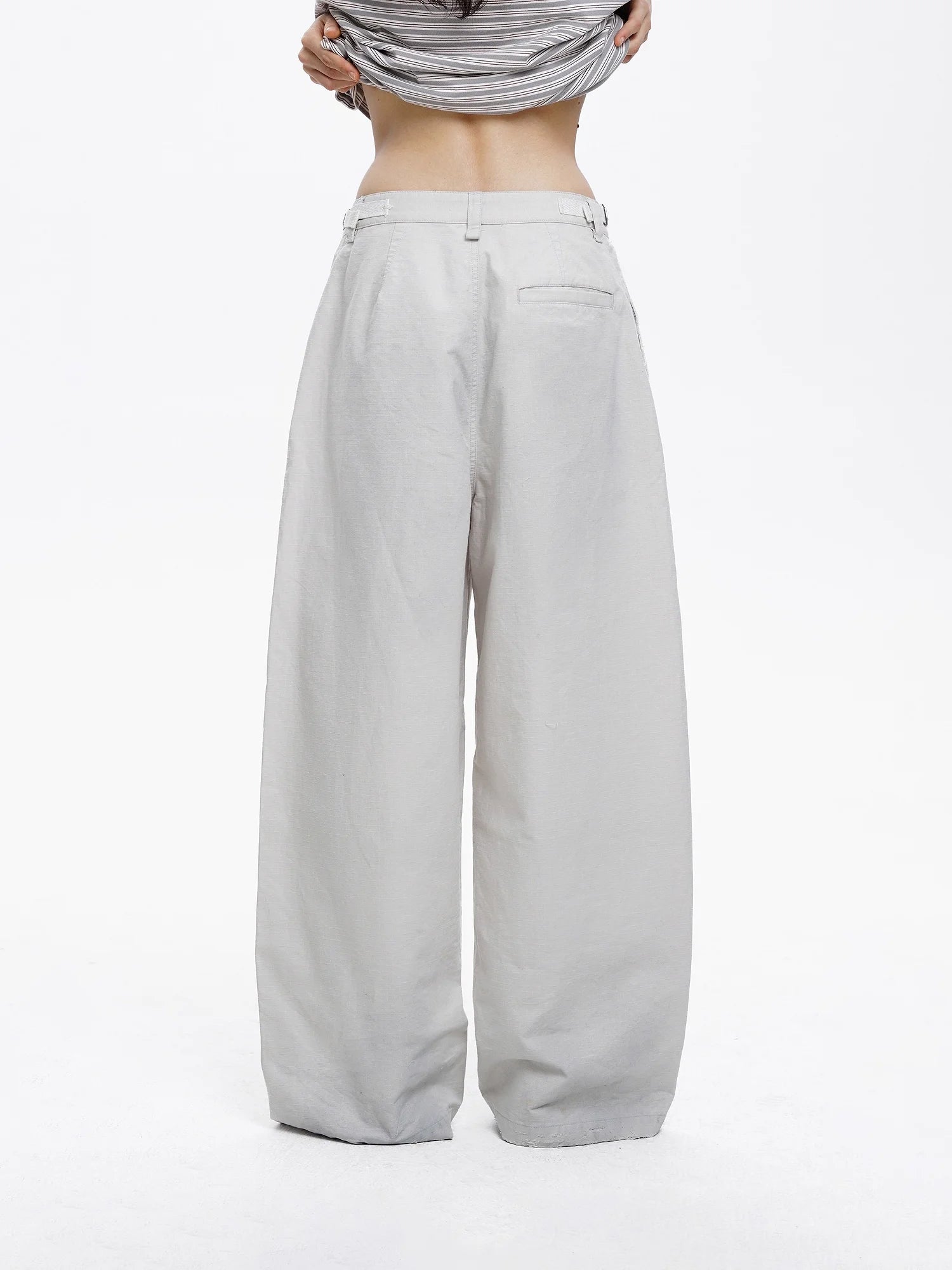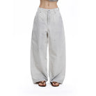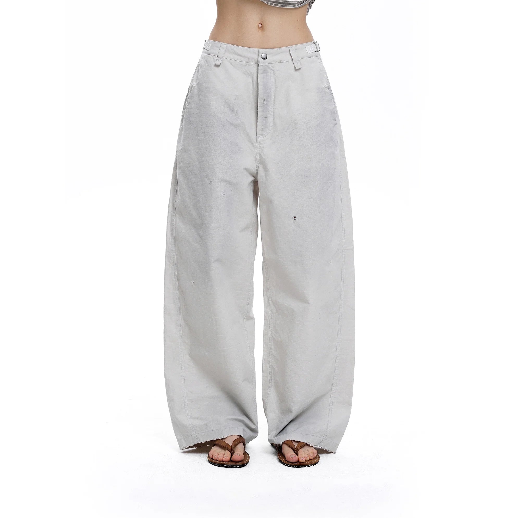 Elevate your casual wardrobe with these relaxed-fit, wide-leg pants designed for effortless style. Crafted from soft, washed cotton, these light grey pants feature a high-waisted silhouette with subtle distressing and a raw, frayed hem. The classic button and zipper closure, along with belt loops, offer functionality while maintaining a laid-back aesthetic. Ideal for casual outings, these women's pants deliver comfort with a worn-in charm.