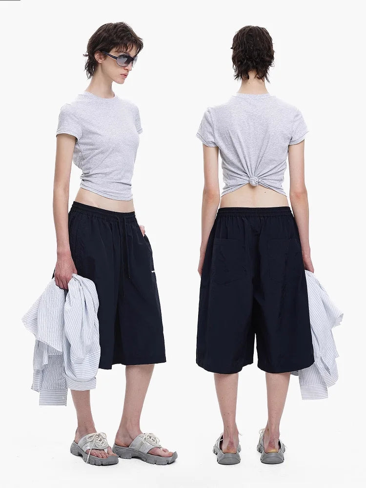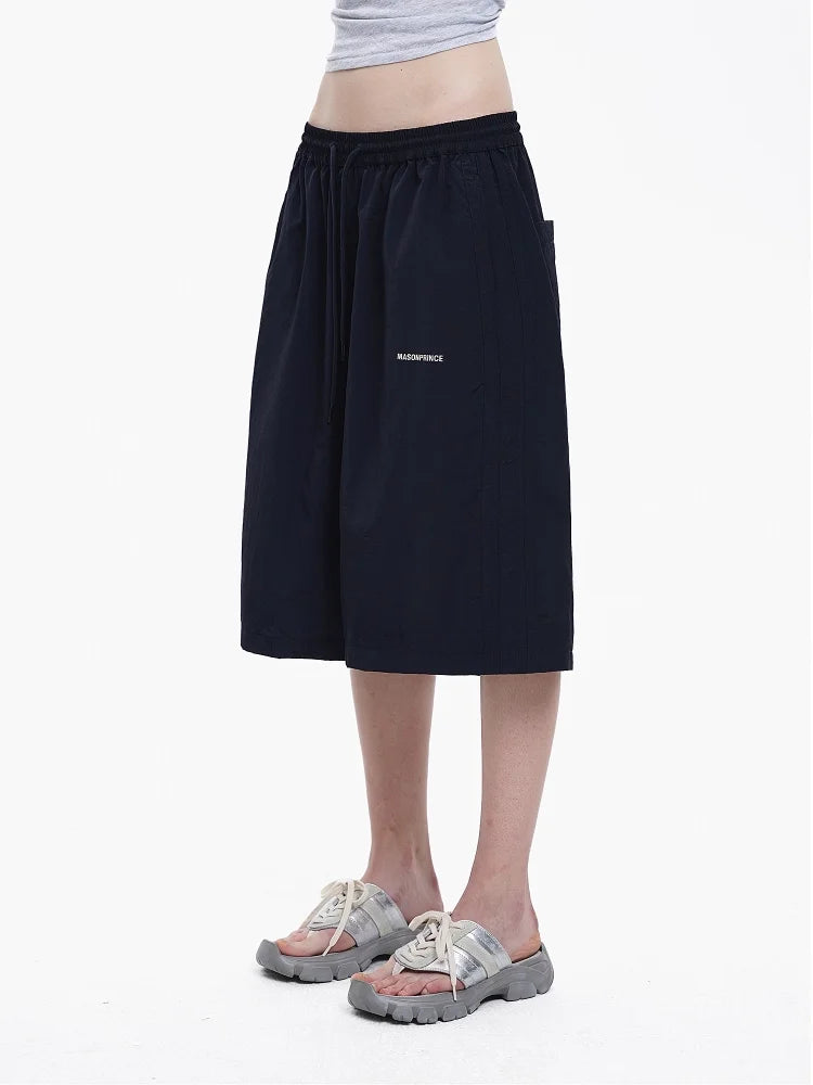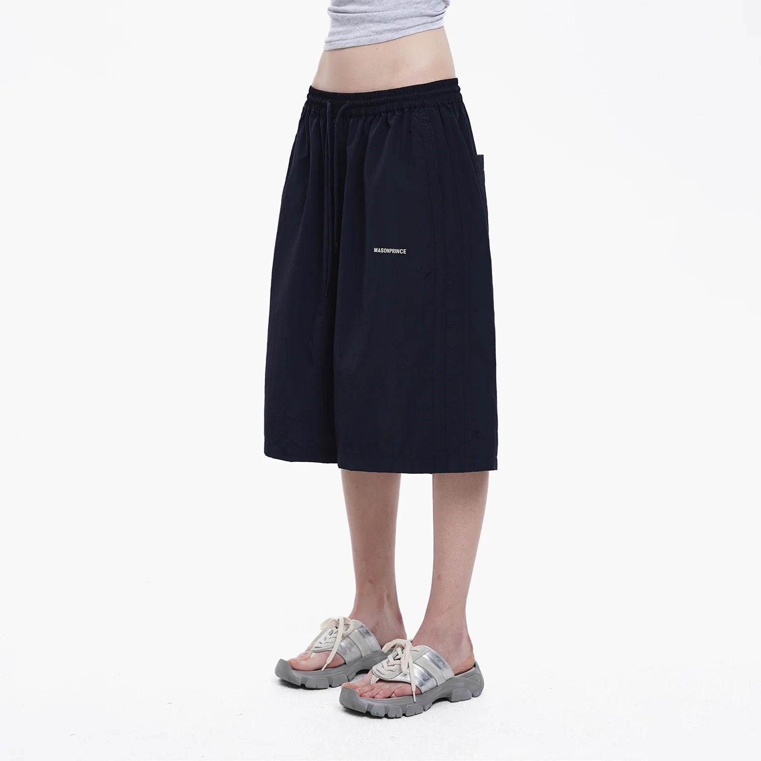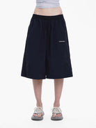 Stay comfortable and stylish with these lightweight, navy blue unisex shorts perfect for casual outdoor occasions and vacation wear. Designed with a relaxed, knee-length fit, these shorts feature an elastic waistband with a drawstring tie for a customizable fit. The upper thigh includes a bold printed detail, adding a modern touch to the minimalist design. Ideal for warm weather and easy to pair with your favorite tops and sandals.