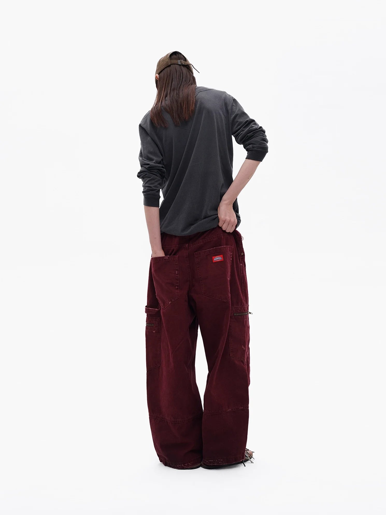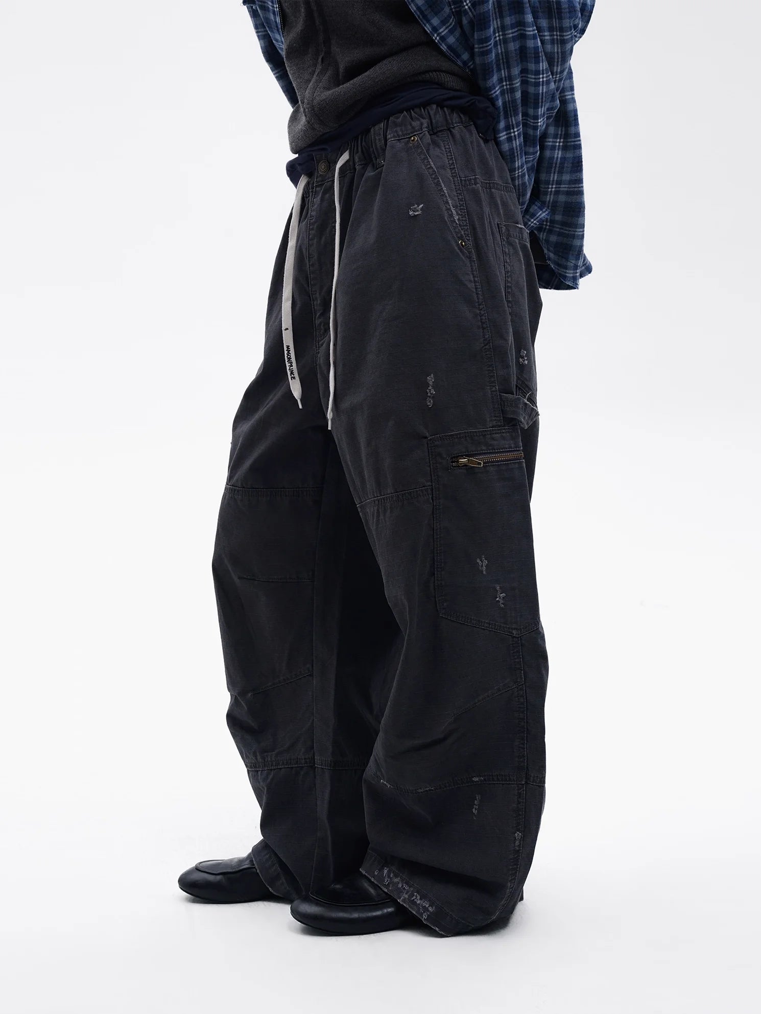 Elevate your streetwear with these men's autumn cargo pants, crafted from textured cotton for a soft, rugged finish. Designed in a light khaki tone, these loose-fit, wide-leg pants feature utility-inspired elements such as multiple flap and zippered pockets for functionality and style. The durable washed fabric gives a worn-in look, while seam detailing on the legs and knees adds to their workwear aesthetic. An elastic waistband ensures a comfortable, adjustable fit, making them perfect for everyday wear with a touch of urban edge.