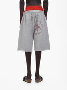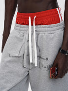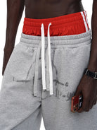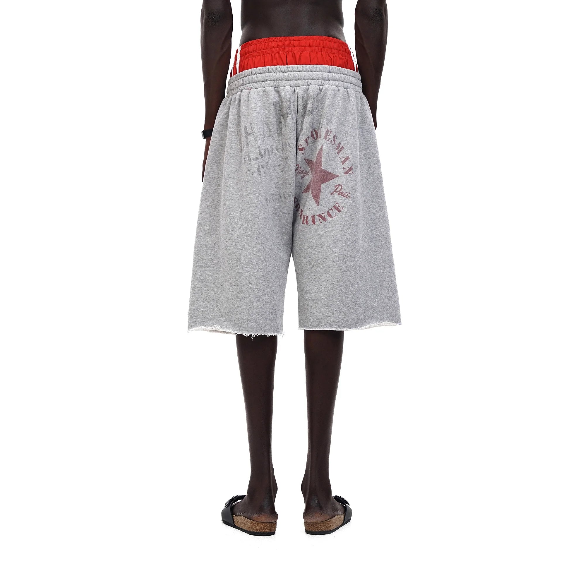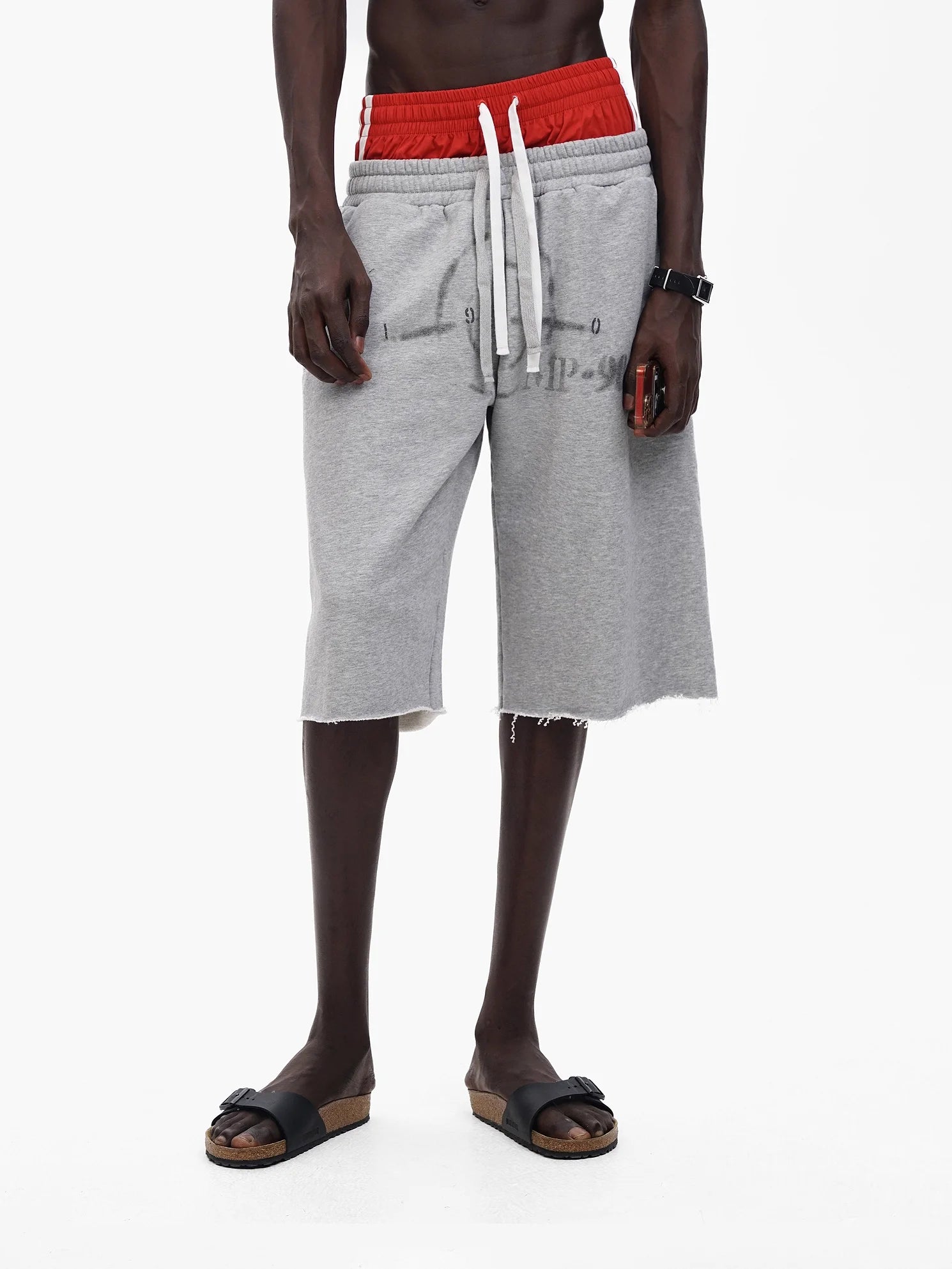These men's casual cropped shorts feature a relaxed, knee-length fit and are crafted from a heavyweight knit fabric for comfort and durability. Designed with a double-layer waist and raw, unfinished hems, they offer a laid-back, edgy look. The back showcases a faded circular graphic print with star and text details in red and gray, adding a vintage-inspired touch. A peek of red inner lining or waistband adds a subtle layered effect. Perfect for casual wear or lounging, these shorts combine street-style flair with relaxed versatility.