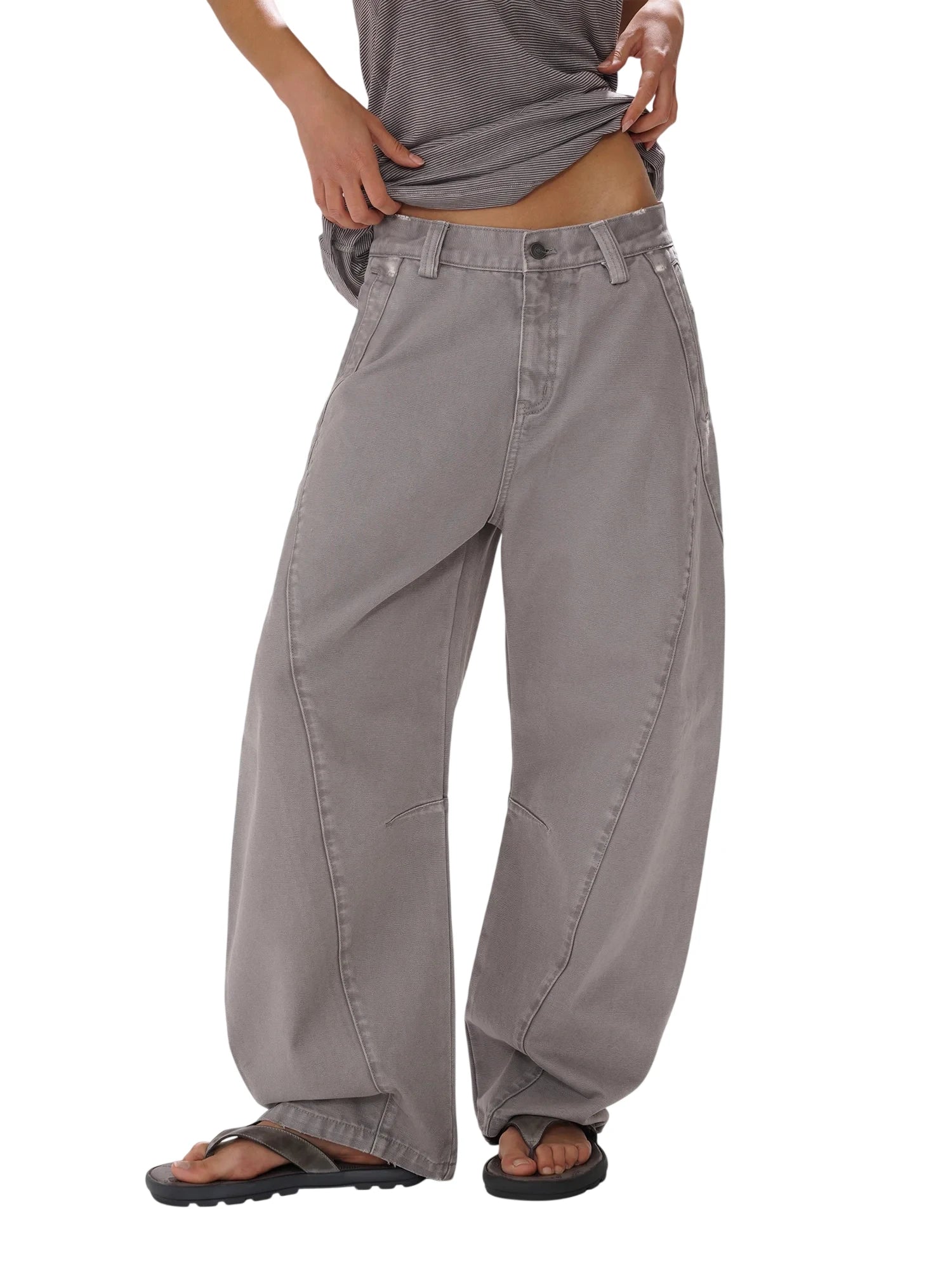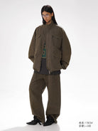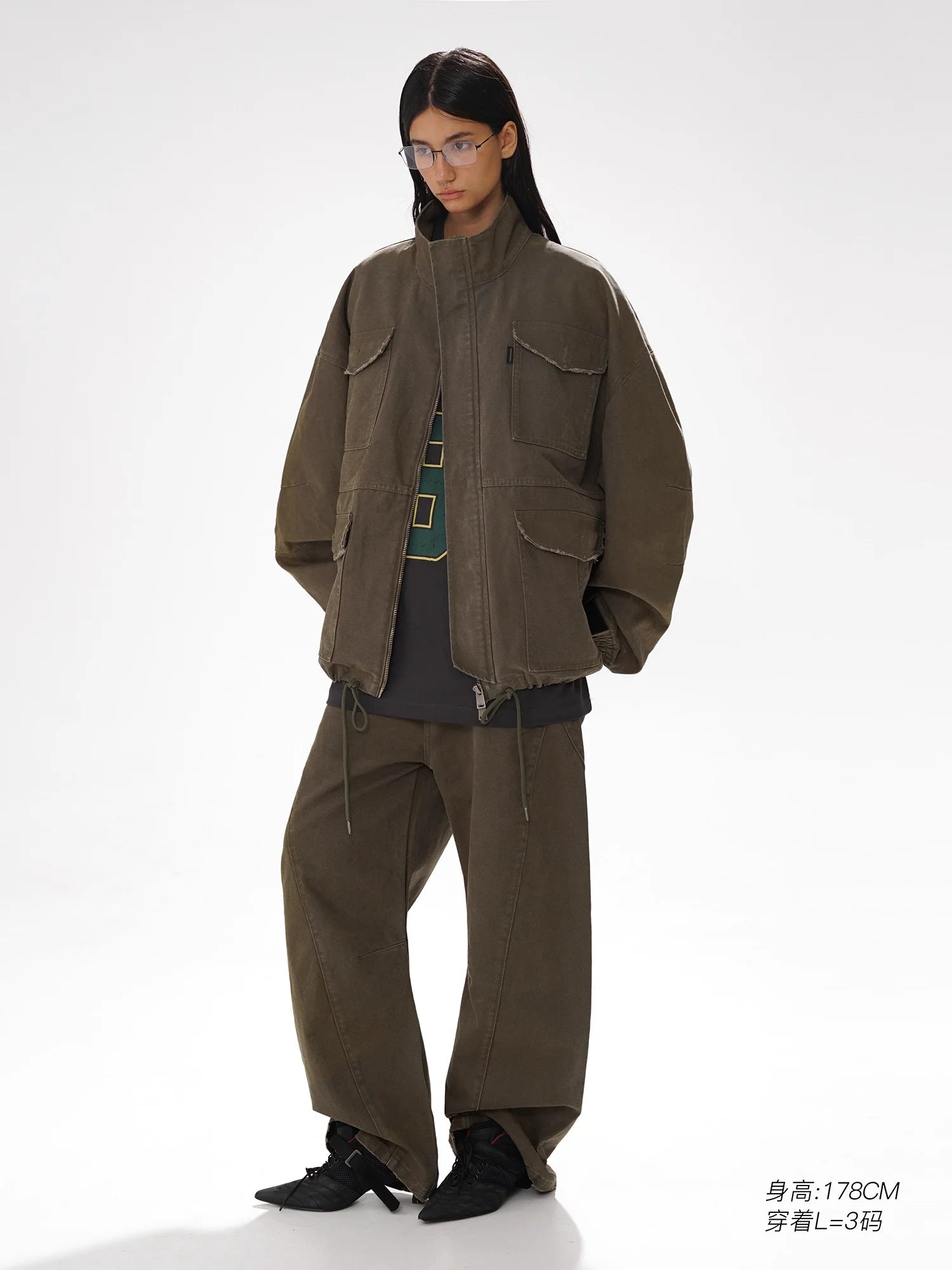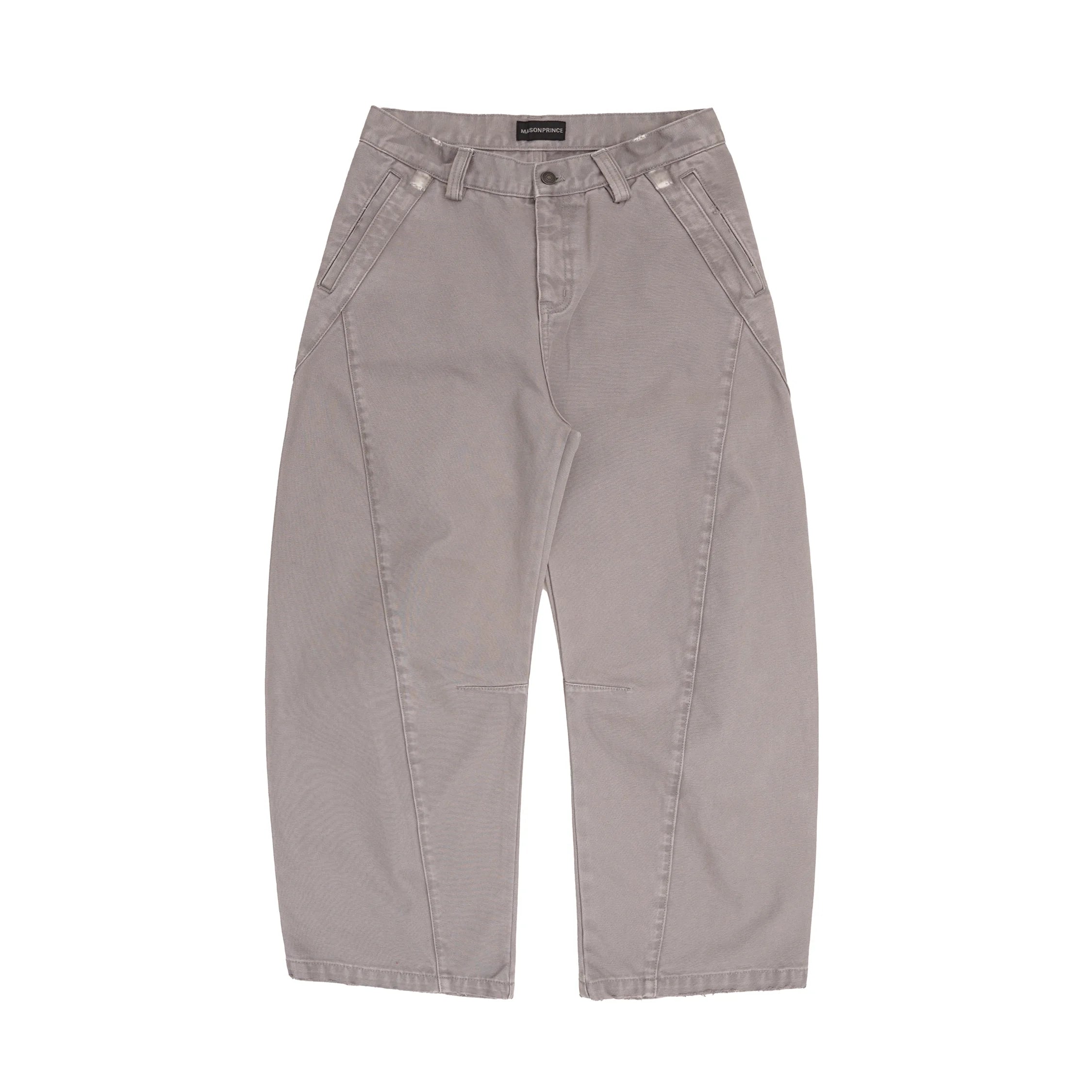 These men's cargo-style pants offer a relaxed, industrial-inspired silhouette with a high-texture heavyweight canvas construction. Designed in a wide-leg cut, they provide exaggerated volume through the legs for a laid-back aesthetic. Diagonal seam detailing at the thighs and knees adds visual interest, while functional side pockets enhance utility. The pants stack subtly at the hem for a contemporary, full-length look, making them a versatile choice for casual wear.