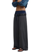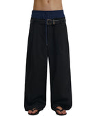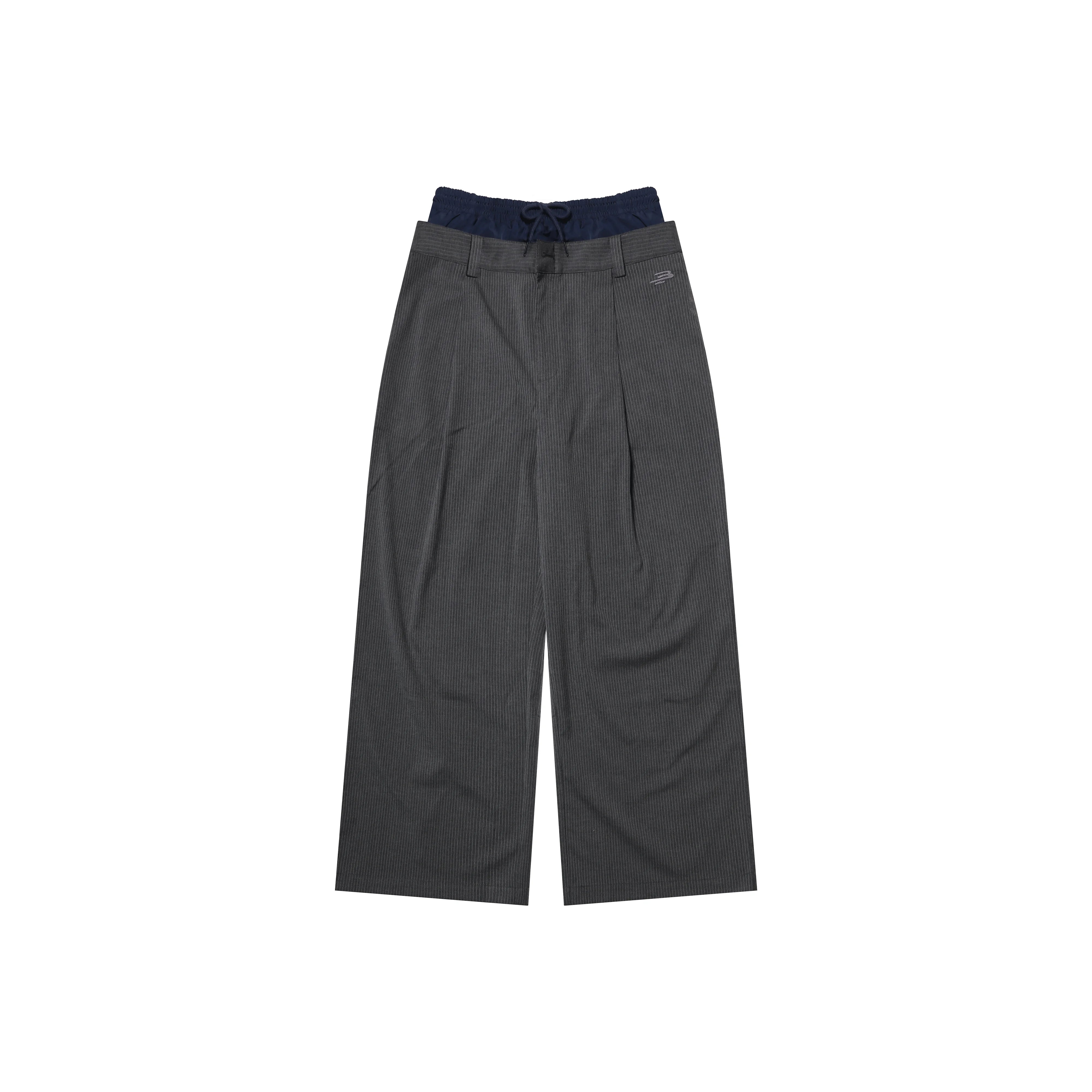 These men's relaxed fit trousers feature a modern layered design with subtle patchwork detailing. Crafted in a wide-leg silhouette, the dark gray fabric showcases a refined pinstripe pattern. The trousers include a contrasting navy blue elastic waistband and an additional black belt, offering a blend of comfort and structured style. Ideal for casual streetwear, they bring a contemporary edge to any autumn wardrobe.