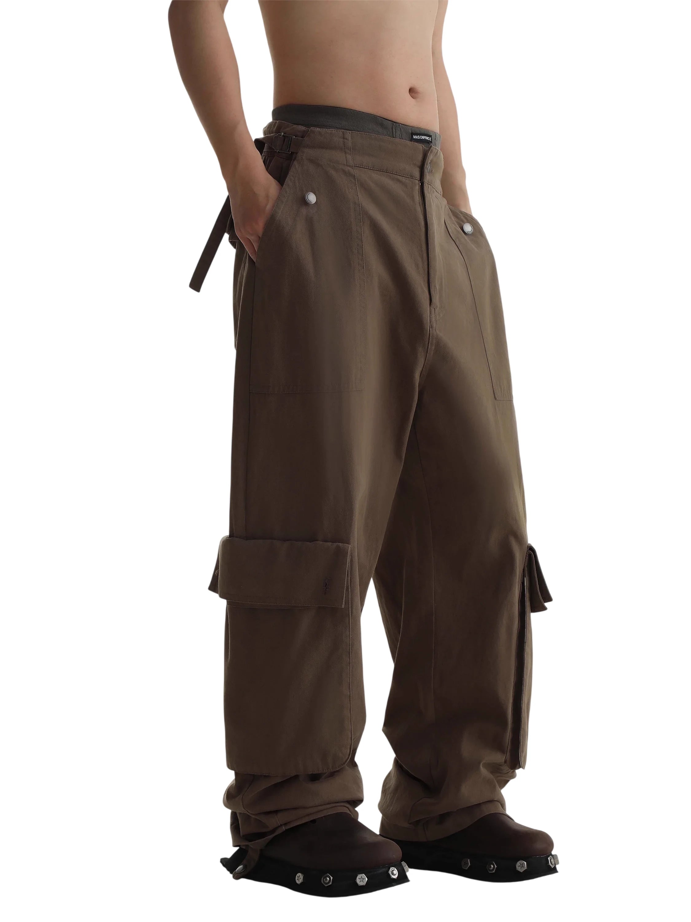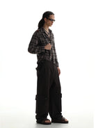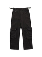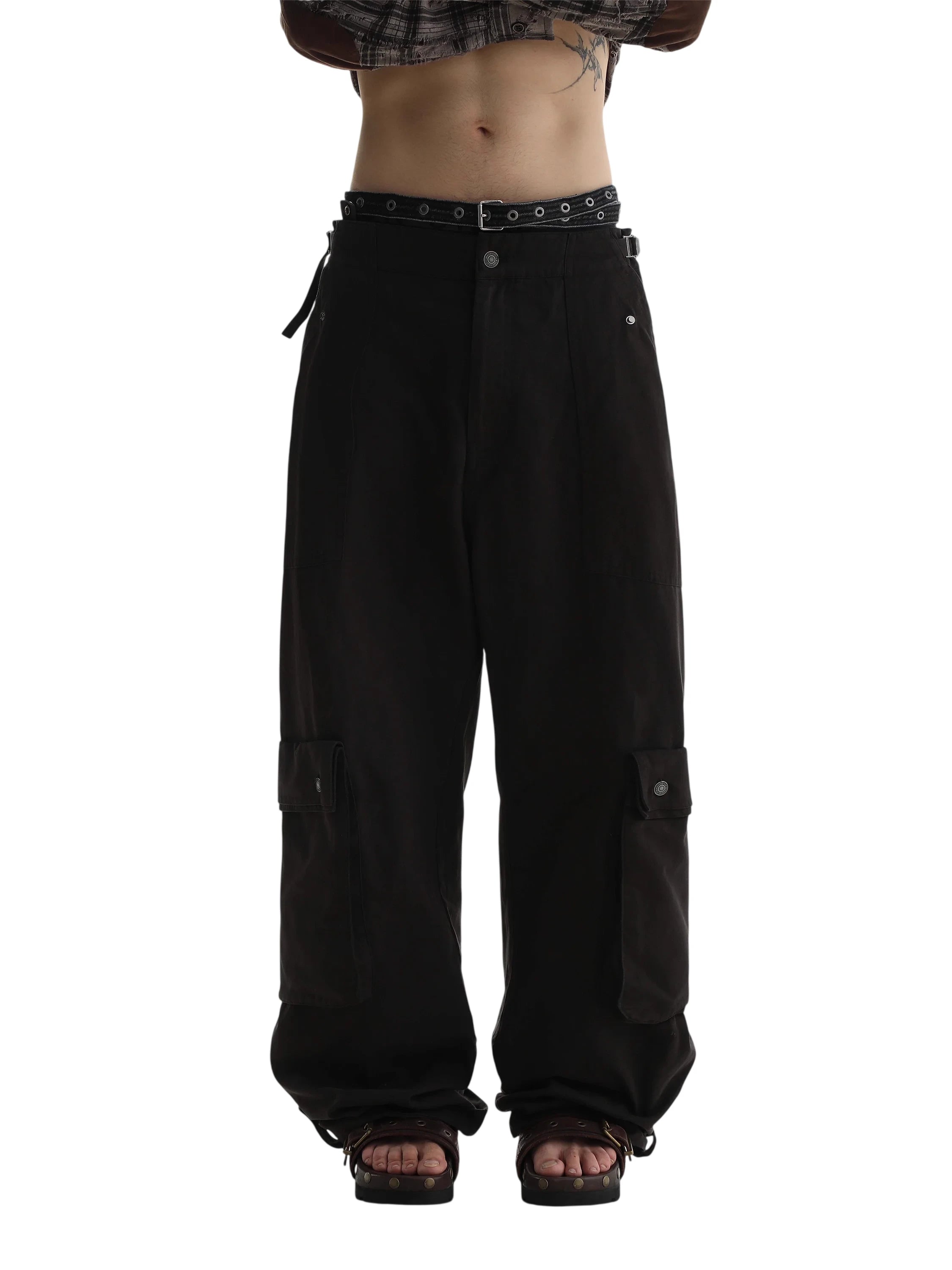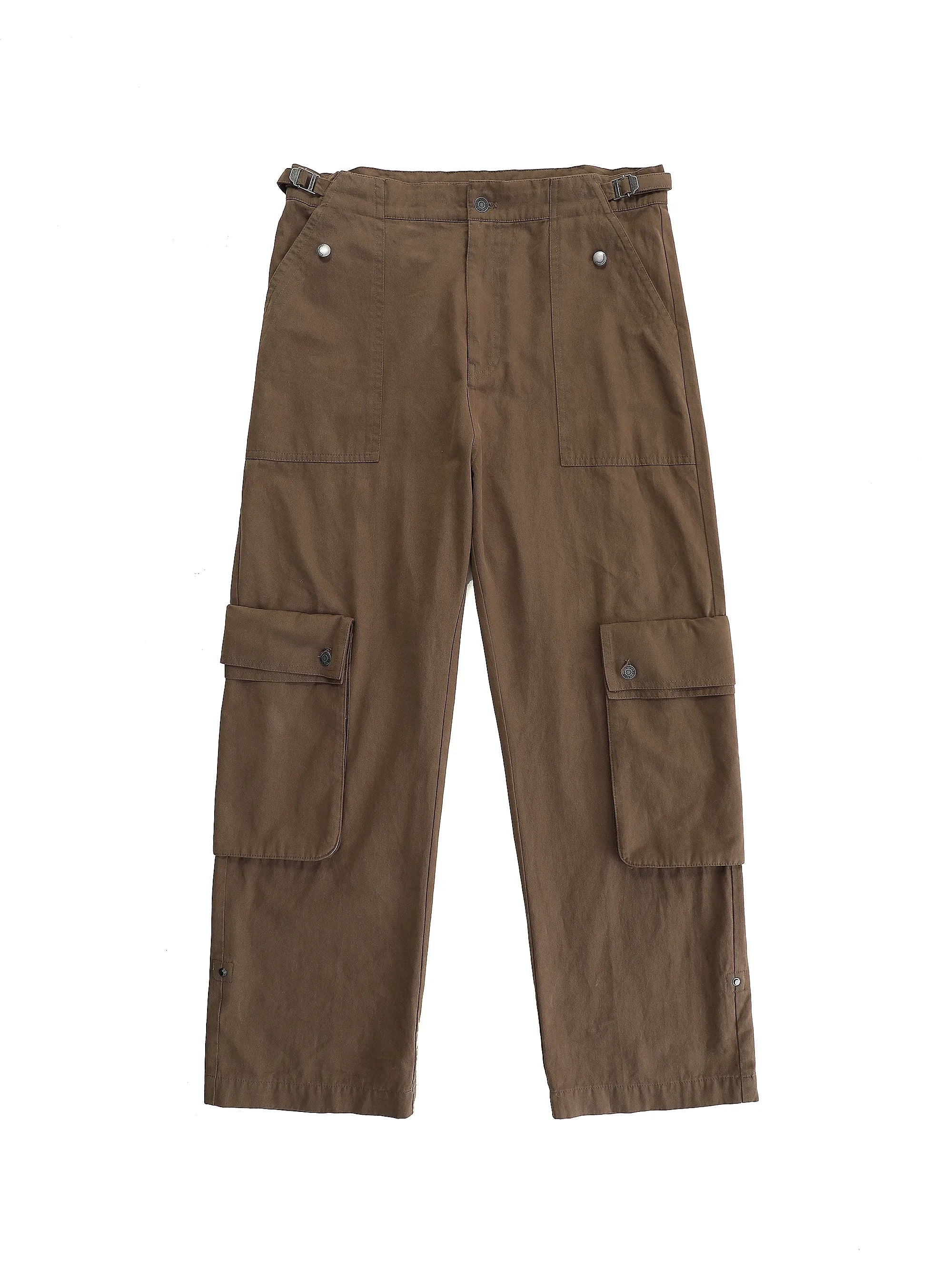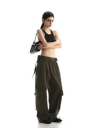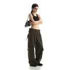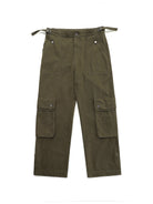 These high-waisted straight-leg cargo work pants offer modern versatility with a utilitarian edge. Designed for a street-style aesthetic, they feature large flap thigh pockets, button details, and adjustable side ties at the waist. The olive green color enhances their understated, urban appeal. Perfect for casual wear or styled up, they provide comfort and fashion-forward function.