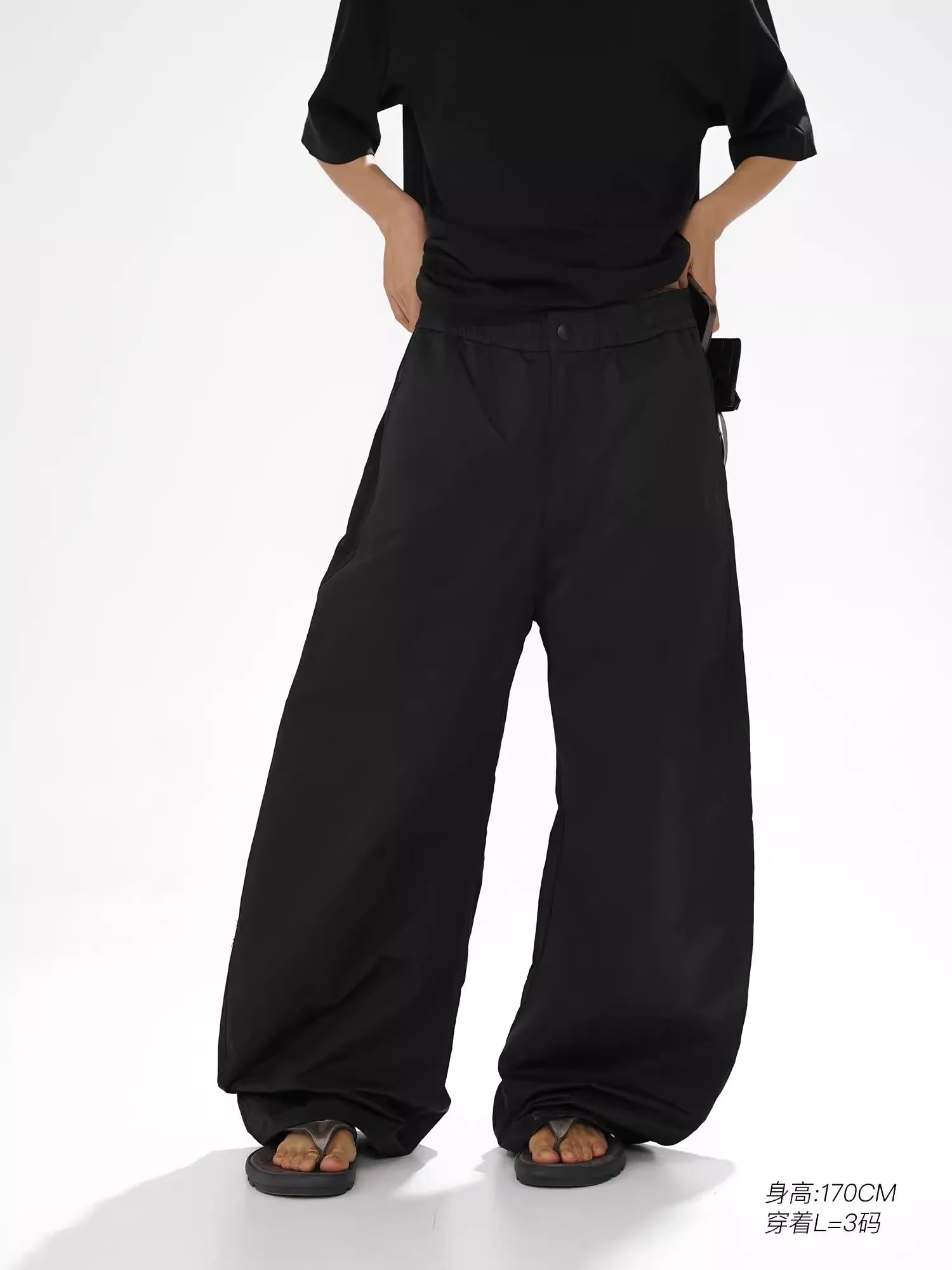 Elevate your casual streetwear style with these unisex wide-leg pants, designed for ultimate comfort and a fashion-forward silhouette. Crafted from lightweight, memory nylon fabric, these pants offer a crinkled texture and a relaxed, flowing fit that hangs effortlessly to the floor. Featuring a secure button closure and functional side pockets, their oversized style is perfect for modern, laid-back looks. Ideal for both men and women seeking a bold yet comfortable wardrobe staple.