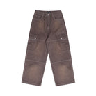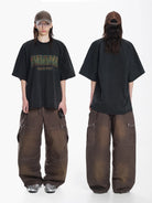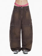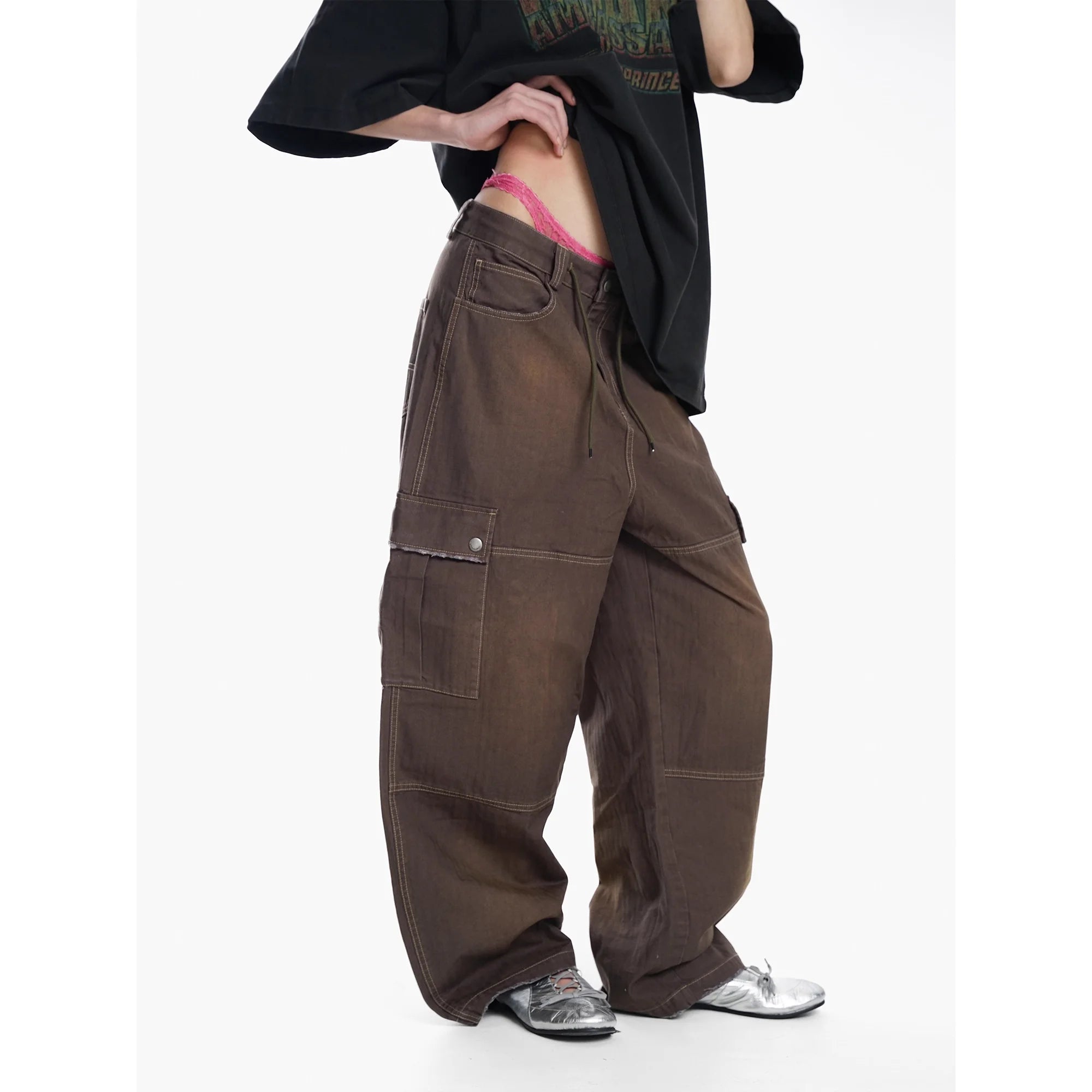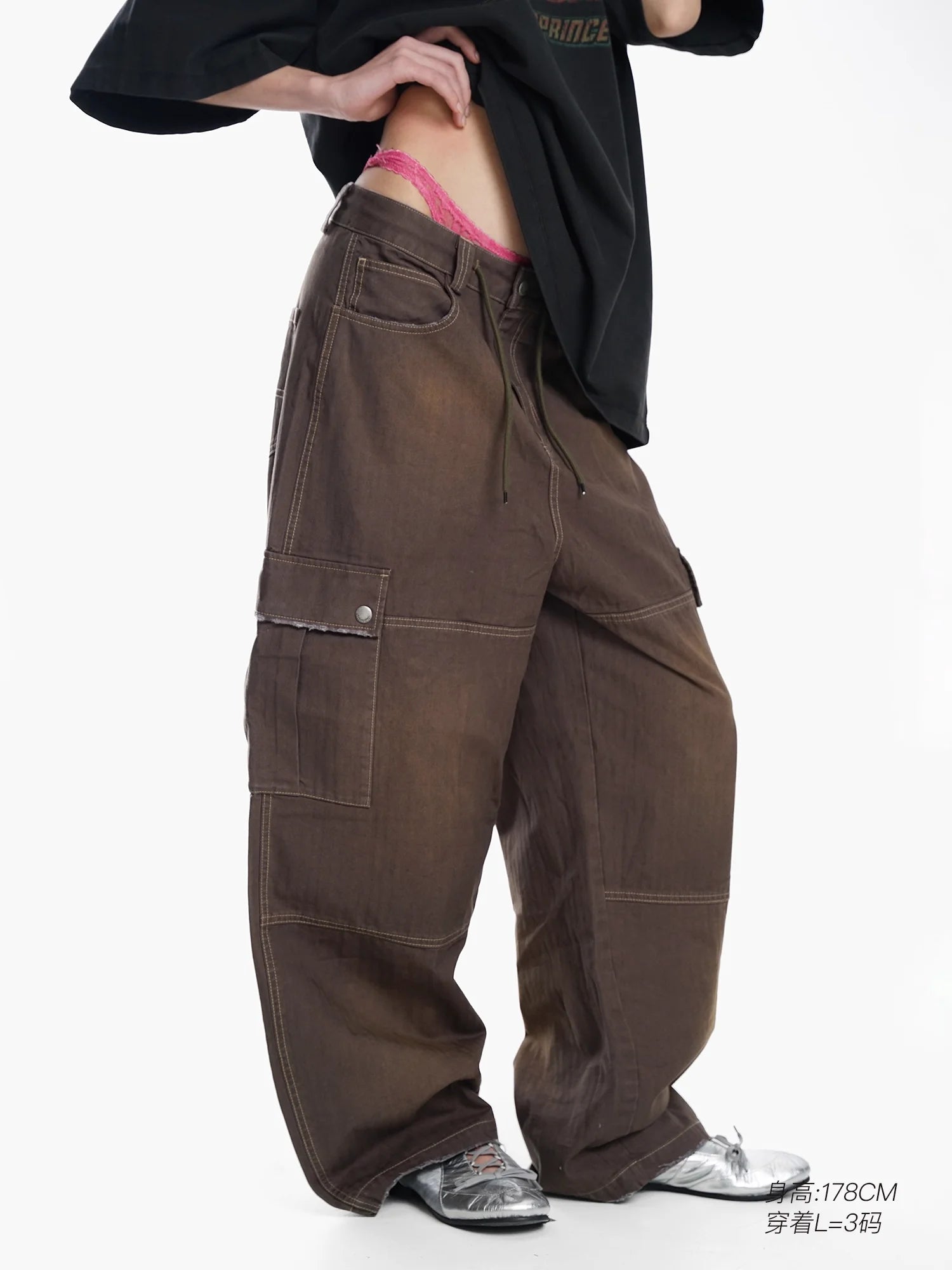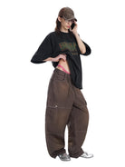 These women's vintage-style cargo pants feature a washed army green tone with a loose, oversized fit for a relaxed, edgy look. Designed with multiple large pockets, including thigh flap pockets with metal snap closures, they combine utility with modern streetwear flair. The contrast white stitching adds structured detailing, while the drawstring waist enhances comfort and style. Ideal for casual wear, these cargo pants pair effortlessly with graphic tees and sneakers for a bold, contemporary outfit.