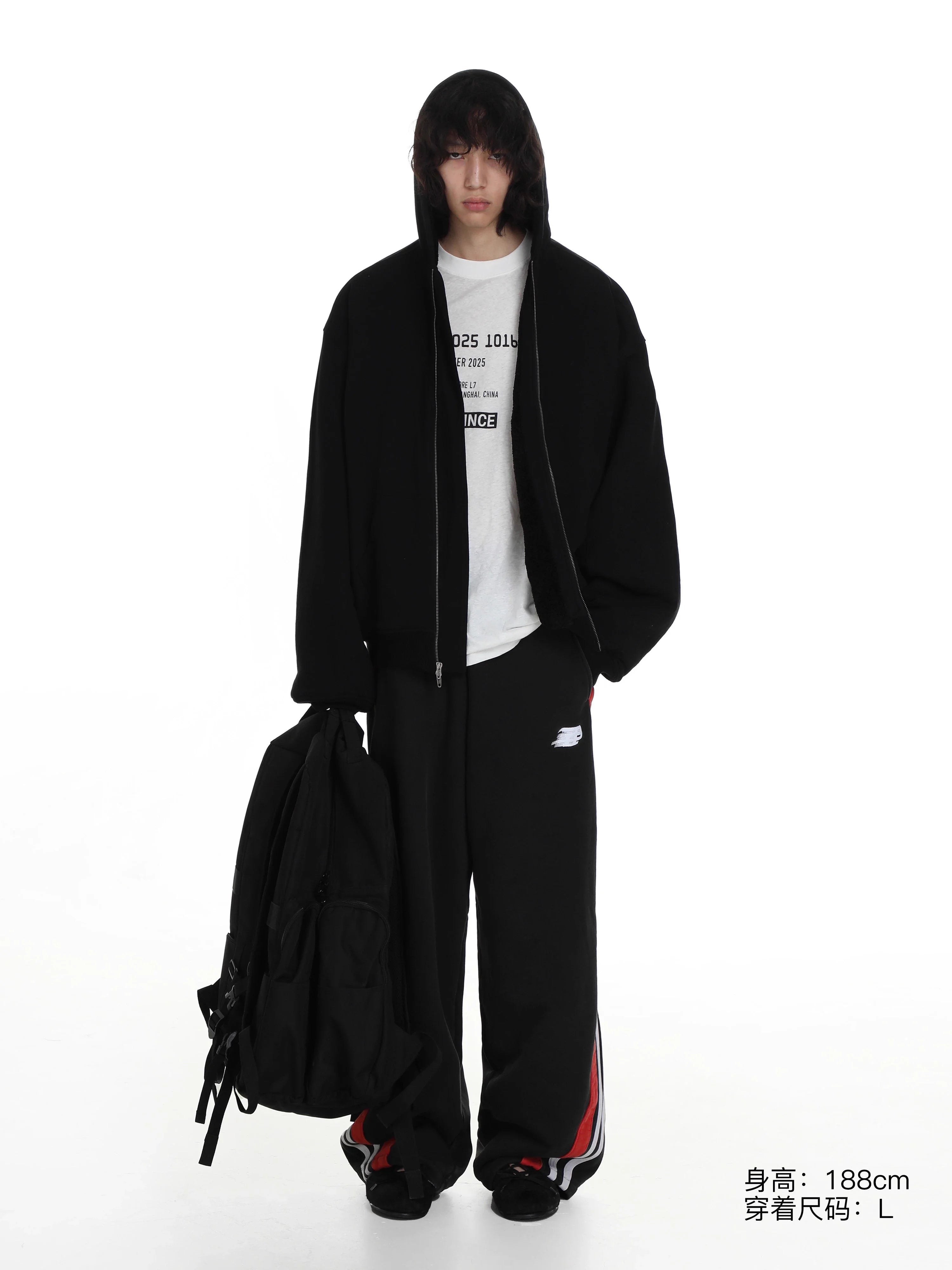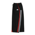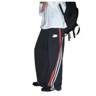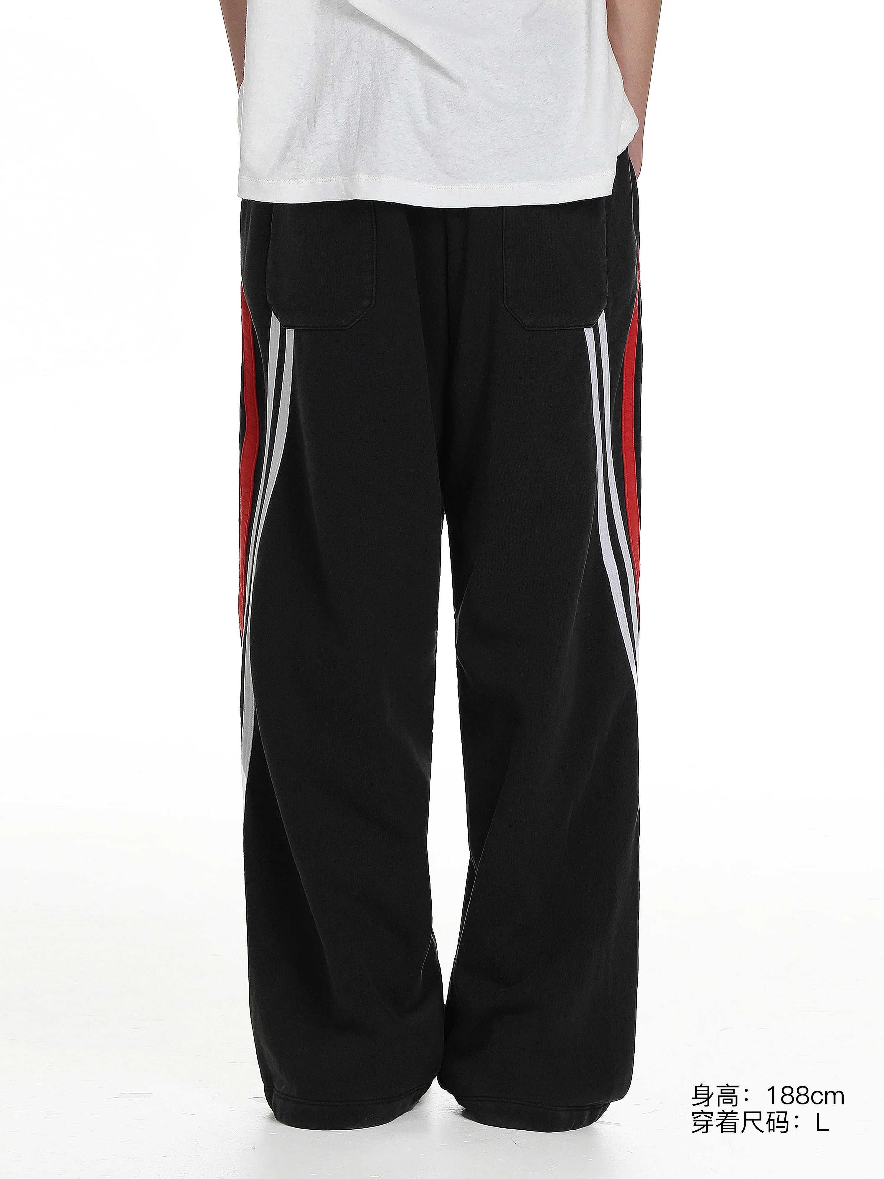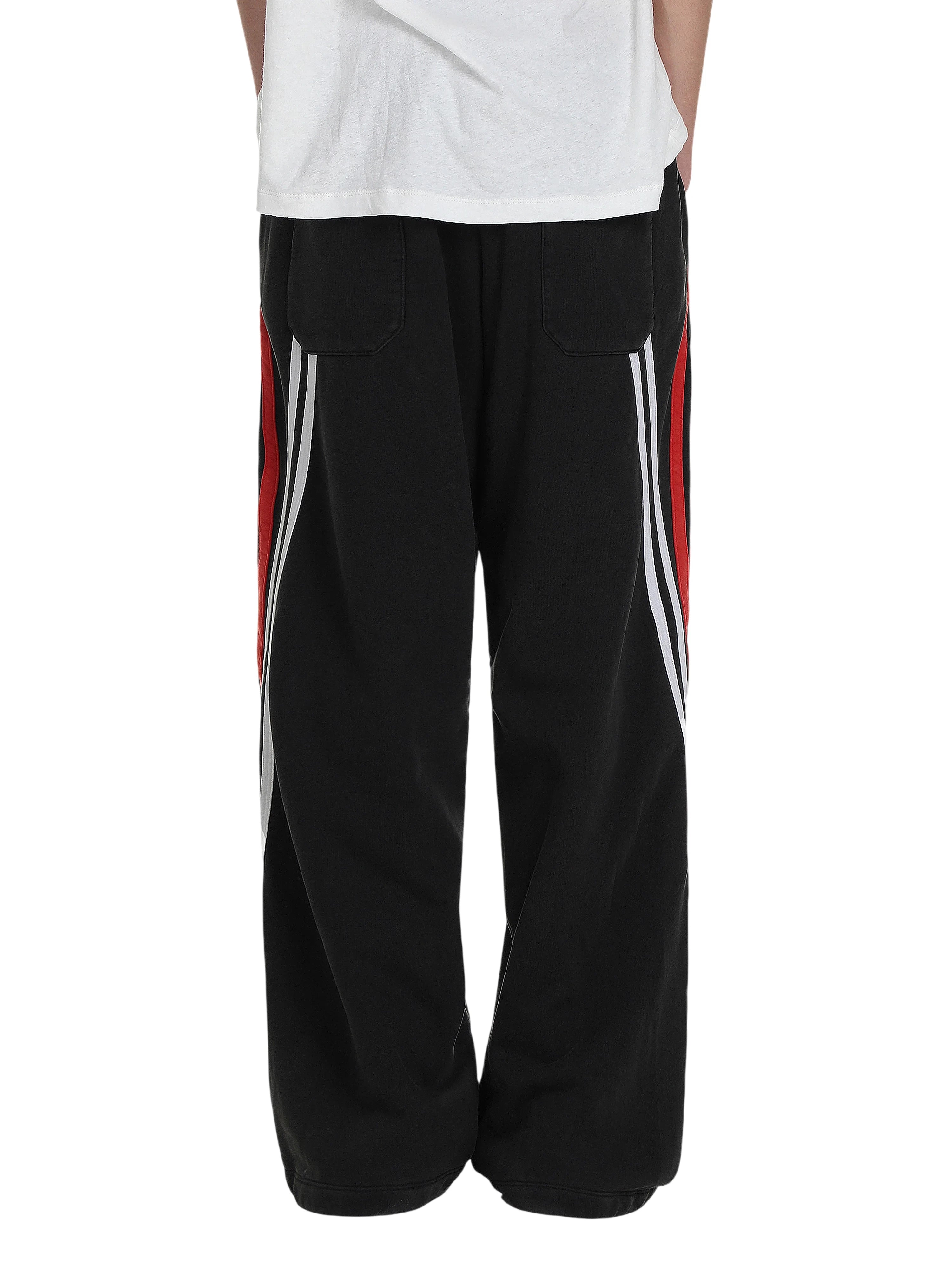 These high-quality knit cotton sweatpants offer a vintage washed finish and a classic athletic design. Featuring dual side stripes in white and red along the legs, they provide a sporty yet relaxed silhouette. A partially distressed logo on the upper thigh adds a subtle touch of style. Designed for men, these sweatpants are perfect for casual outings or training sessions.