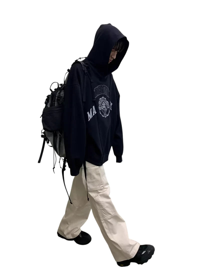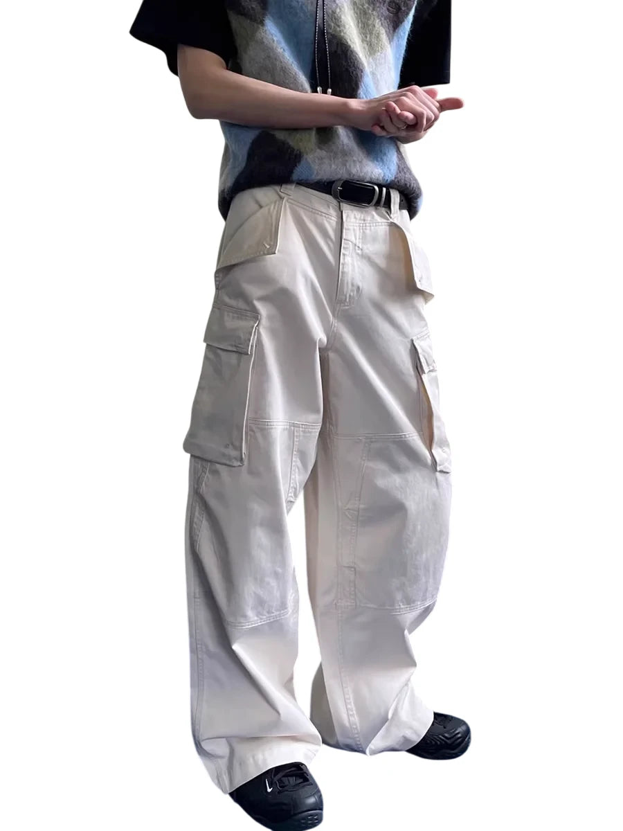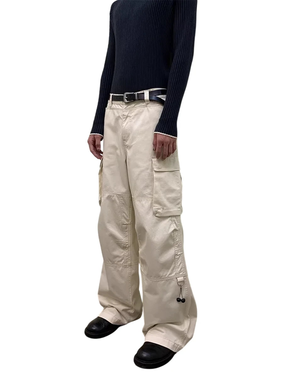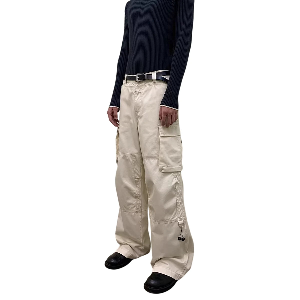 These men's wide-leg work pants feature a relaxed fit with classic pleated knees and a straight-leg silhouette. Designed in a Japanese-inspired casual style, they come in an off-white color and include multiple large flap pockets for functional storage. Detailed stitching adds character, while a small accessory near the hem enhances the unique aesthetic.